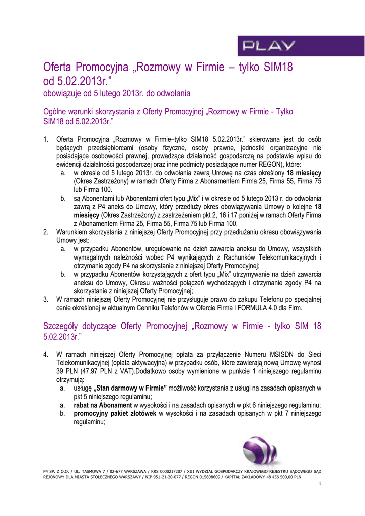 Oferta Promocyjna „Rozmowy w Firmie – tylko SIM18 od 5.02.2013r.” obowiązuje od 5 lutego 2013r. do odwołania Ogólne warunki skorzystania z Oferty Promocyjnej „Rozmowy w Firmie - Tylko SIM18 od 5.02.2013r.” 1. 2. 3. Oferta Promocyjna „Rozmowy w Firmie–tylko SIM18 5.02.2013r.” skierowana jest do osób będących przedsiębiorcami (osoby fizyczne, osoby prawne, jednostki organizacyjne nie posiadające osobowości prawnej, prowadzące działalność gospodarczą na podstawie wpisu do ewidencji działalności gospodarczej oraz inne podmioty posiadające numer REGON), które: a. w okresie od 5 lutego 2013r. do odwołania zawrą Umowę na czas określony 18 miesięcy (Okres Zastrzeżony) w ramach Oferty Firma z Abonamentem Firma 25, Firma 55, Firma 75 lub Firma 100. b. są Abonentami lub Abonentami ofert typu „Mix” i w okresie od 5 lutego 2013 r. do odwołania zawrą z P4 aneks do Umowy, który przedłuży okres obowiązywania Umowy o kolejne 18 miesięcy (Okres Zastrzeżony) z zastrzeżeniem pkt 2, 16 i 17 poniżej w ramach Oferty Firma z Abonamentem Firma 25, Firma 55, Firma 75 lub Firma 100. Warunkiem skorzystania z niniejszej Oferty Promocyjnej przy przedłużaniu okresu obowiązywania Umowy jest: a. w przypadku Abonentów, uregulowanie na dzień zawarcia aneksu do Umowy, wszystkich wymagalnych należności wobec P4 wynikających z Rachunków Telekomunikacyjnych i otrzymanie zgody P4 na skorzystanie z niniejszej Oferty Promocyjnej; b. w przypadku Abonentów korzystających z ofert typu „Mix” utrzymywanie na dzień zawarcia aneksu do Umowy, Okresu ważności połączeń wychodzących i otrzymanie zgody P4 na skorzystanie z niniejszej Oferty Promocyjnej; W ramach niniejszej Oferty Promocyjnej nie przysługuje prawo do zakupu Telefonu po specjalnej cenie określonej w aktualnym Cenniku Telefonów w Ofercie Firma i FORMUŁA 4.0 dla Firm. Szczegóły dotyczące Oferty Promocyjnej „Rozmowy w Firmie - tylko SIM 18 5.02.2013r.” 4. W ramach niniejszej Oferty Promocyjnej opłata za przyłączenie Numeru MSISDN do Sieci Telekomunikacyjnej (oplata aktywacyjna) w przypadku osób, które zawierają nową Umowę wynosi 39 PLN (47,97 PLN z VAT).Dodatkowo osoby wymienione w punkcie 1 niniejszego regulaminu otrzymują: a. usługę „Stan darmowy w Firmie” możliwość korzystania z usługi na zasadach opisanych w pkt 5 niniejszego regulaminu; a. rabat na Abonament w wysokości i na zasadach opisanych w pkt 6 niniejszego regulaminu; b. promocyjny pakiet złotówek w wysokości i na zasadach opisanych w pkt 7 niniejszego regulaminu; P4 SP. Z O.O. / UL. TAŚMOWA 7 / 02-677 WARSZAWA / KRS 0000217207 / XIII WYDZIAŁ GOSPODARCZY KRAJOWEGO REJESTRU SĄDOWEGO SĄD REJONOWY DLA MIASTA STOŁECZNEGO WARSZAWY / NIP 951-21-20-077 / REGON 015808609 / KAPITAŁ ZAKŁADOWY 48 456 500,00 PLN 1 c. 5. 6. pakiet „Pakiet Internet dla Firm” w wysokości i na zasadach opisanych w pkt 8 niniejszego regulaminu; d. możliwość Bezpłatnego korzystania z usługi „Pakiet nielimitowanych SMS-ów do wszystkich sieci - Promo” na zasadach opisanych w pkt 9 niniejszego regulaminu. Osoby wymienione w punkcie 1 i 2 otrzymają w ramach niniejszej Oferty Promocyjnej możliwość Bezpłatnego korzystania z usługi „Stan darmowy w Firmie” przez cały Okres Zastrzeżony oraz po przekształceniu Umowy w Umowę na czas nieokreślony, co oznacza, że usługa jest aktywowana przez P4 wraz z zawarciem Umowy lub z wejściem w życie postanowień aneksu zgodnie z pkt 18 niniejszej Oferty, a opłata za korzystanie z usługi zawarta jest w kwocie Abonamentu. Zasady korzystania z usługi „Stan darmowy w Firmie” określone są w punktach poniżej: e. W ramach usługi „Stan darmowy w Firmie Abonent otrzymuje pakiet 44 640 minut, który może być wykorzystany na krajowe połączenia głosowe i wideo na numery w Sieci Telekomunikacyjnej P4 oraz na połączenia głosowe do wszystkich krajowych sieci stacjonarnych (z wyłączeniem połączeń na numery specjalne wskazane w pkt. 5 Cennika Oferty Firma). f. Minuty przyznane w ramach usługi „Stan darmowy w Firmie” wykorzystywane są przed Pakietem Złotówek przyznanym w ramach Oferty Firma. g. Przyznany pakiet minut będzie odnawiany pierwszego dnia kalendarzowego każdego Okresu Rozliczeniowego pomiędzy godziną 00:00 a 01.00. h. Pierwszy pakiet przyznawany jest w ciągu 24 godzin od momentu aktywacji (od momentu rozpoczęcia świadczenia Usług Telekomunikacyjnych) . i. Jeżeli aktywacja usługi nastąpiła w trakcie Okresu Rozliczeniowego, liczba minut w pakiecie przyznawana jest w ilości proporcjonalnej do liczby dni jaka pozostała do końca tego Okresu Rozliczeniowego. j. Niewykorzystane minuty w danym Okresie Rozliczeniowym nie przechodzą na kolejne Okresy Rozliczeniowe. Dodatkowo, osoby, które zawrą Umowę lub aneks do Umowy w ramach niniejszej Oferty Promocyjnej otrzymują rabat na Abonament, na cały Okres Zastrzeżony oraz po przekształceniu Umowy w Umowę zawartą na czas nieokreślony, w wysokości określonej w tabeli 1 oraz na zasadach opisanych w punktach poniżej: Tabela 1 Oferta Rabat na Abonament Firma 25 Firma 55 Firma 75 Firma 100 50% a. W pierwszym niepełnym Okresie Rozliczeniowym, w którym nastąpiła aktywacja numeru MSISDN lub z wejściem w życie postanowień aneksu zgodnie z pkt 18 niniejszej Oferty Promocyjnej, kwota Abonamentu naliczana jest proporcjonalnie do liczby dni pozostałych do końca tego Okresu Rozliczeniowego i pomniejszona o ww. rabat. P4 SP. Z O.O. / UL. TAŚMOWA 7 / 02-677 WARSZAWA / KRS 0000217207 / XIII WYDZIAŁ GOSPODARCZY KRAJOWEGO REJESTRU SĄDOWEGO SĄD REJONOWY DLA MIASTA STOŁECZNEGO WARSZAWY / NIP 951-21-20-077 / REGON 015808609 / KAPITAŁ ZAKŁADOWY 48 456 500,00 PLN 2 b. Rabat przyznany w ramach niniejszej Oferty Promocyjnej dotyczy tylko opłaty za Abonament. Wszystkie opłaty poza Abonamentem będą naliczane zgodnie z Cennikiem Oferty Firma. c. Zmiana wysokości Abonamentu na wyższy w okresie