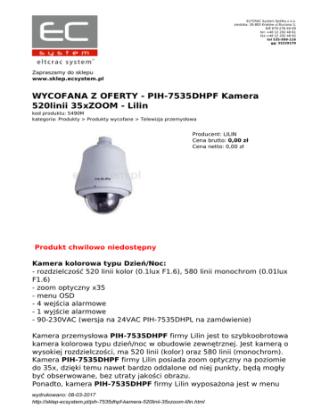 ELTCRAC System Spółka z o.o. siedziba: 30-803 Kraków ul.Ruciana 3, NIP 679-278-49-99 tel: +48 12 292 48 61 fax:+48 12 292 48 62 tel 535-999-116 gg: 35229170 Zapraszamy do sklepu www.sklep.ecsystem.pl WYCOFANA Z OFERTY - PIH-7535DHPF Kamera 520linii 35xZOOM - Lilin kod produktu: 5490M kategoria: Produkty > Produkty wycofane > Telewizja przemysłowa Producent: LILIN Cena brutto: 0,00 zł Cena netto: 0,00 zł Produkt chwilowo niedostępny Kamera kolorowa typu Dzień/Noc: - rozdzielczość 520 linii kolor (0.1lux F1.6), 580 linii monochrom (0.01lux F1.6) - zoom optyczny x35 - menu OSD - 4 wejścia alarmowe - 1 wyjście alarmowe - 90-230VAC (wersja na 24VAC PIH-7535DHPL na zamówienie) Kamera przemysłowa PIH-7535DHPF firmy Lilin jest to szybkoobrotowa kamera kolorowa typu dzień/noc w obudowie zewnętrznej. Jest kamerą o wysokiej rozdzielczości, ma 520 linii (kolor) oraz 580 linii (monochrom). Kamera PIH-7535DHPF firmy Lilin posiada zoom optyczny na poziomie do 35x, dzięki temu nawet bardzo oddalone od niej punkty, będą mogły być obserwowane, bez utraty jakości obrazu. Ponadto, kamera PIH-7535DHPF firmy Lilin wyposażona jest w menu wydrukowano: 08-03-2017 http://sklep-ecsystem.pl/pih-7535dhpf-kamera-520linii-35xzoom-lilin.html OSD w języku polskim, 8 stref prywatności, 128 presetów, 4 wejścia alarmowe z możliwością programowania pozycji oraz 1 wyjście alarmowe. wydrukowano: 08-03-2017 http://sklep-ecsystem.pl/pih-7535dhpf-kamera-520linii-35xzoom-lilin.html