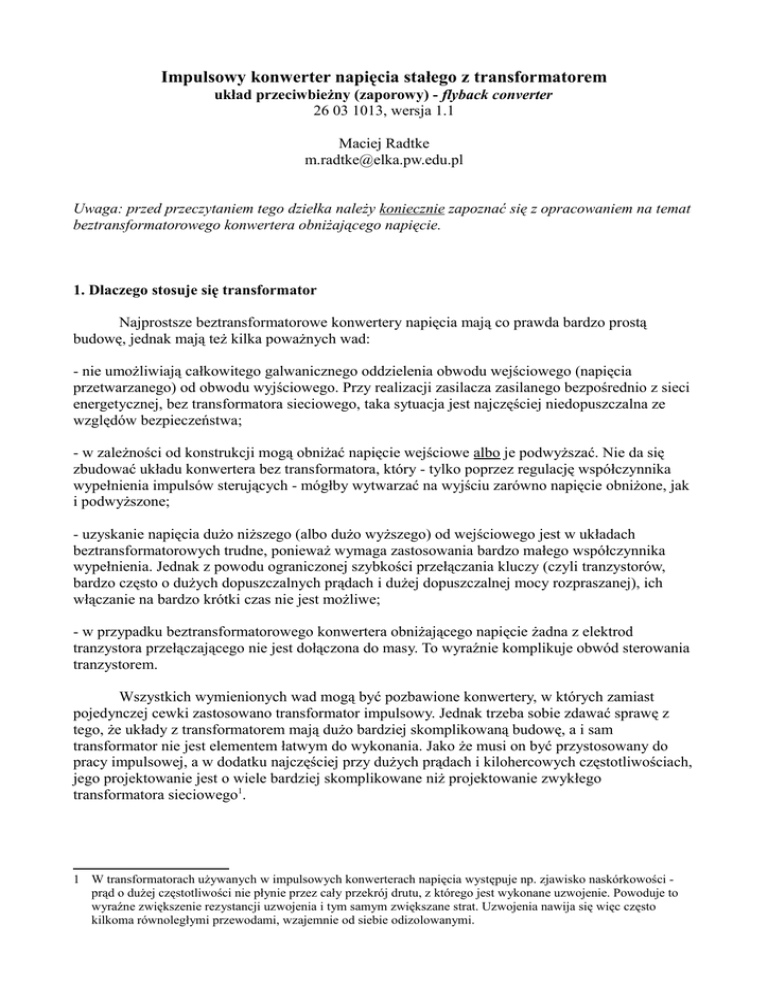 Impulsowy konwerter napięcia stałego z transformatorem układ przeciwbieżny (zaporowy) - flyback converter 26 03 1013, wersja 1.1 Maciej Radtke [email protected] Uwaga: przed przeczytaniem tego dziełka należy koniecznie zapoznać się z opracowaniem na temat beztransformatorowego konwertera obniżającego napięcie. 1. Dlaczego stosuje się transformator Najprostsze beztransformatorowe konwertery napięcia mają co prawda bardzo prostą budowę, jednak mają też kilka poważnych wad: - nie umożliwiają całkowitego galwanicznego oddzielenia obwodu wejściowego (napięcia przetwarzanego) od obwodu wyjściowego. Przy realizacji zasilacza zasilanego bezpośrednio z sieci energetycznej, bez transformatora sieciowego, taka sytuacja jest najczęściej niedopuszczalna ze względów bezpieczeństwa; - w zależności od konstrukcji mogą obniżać napięcie wejściowe albo je podwyższać. Nie da się zbudować układu konwertera bez transformatora, który - tylko poprzez regulację współczynnika wypełnienia impulsów sterujących - mógłby wytwarzać na wyjściu zarówno napięcie obniżone, jak i podwyższone; - uzyskanie napięcia dużo niższego (albo dużo wyższego) od wejściowego jest w układach beztransformatorowych trudne, ponieważ wymaga zastosowania bardzo małego współczynnika wypełnienia. Jednak z powodu ograniczonej szybkości przełączania kluczy (czyli tranzystorów, bardzo często o dużych dopuszczalnych prądach i dużej dopuszczalnej mocy rozpraszanej), ich włączanie na bardzo krótki czas nie jest możliwe; - w przypadku beztransformatorowego konwertera obniżającego napięcie żadna z elektrod tranzystora przełączającego nie jest dołączona do masy. To wyraźnie komplikuje obwód sterowania tranzystorem. Wszystkich wymienionych wad mogą być pozbawione konwertery, w których zamiast pojedynczej cewki zastosowano transformator impulsowy. Jednak trzeba sobie zdawać sprawę z tego, że układy z transformatorem mają dużo bardziej skomplikowaną budowę, a i sam transformator nie jest elementem łatwym do wykonania. Jako że musi on być przystosowany do pracy impulsowej, a w dodatku najczęściej przy dużych prądach i kilohercowych częstotliwościach, jego projektowanie jest o wiele bardziej skomplikowane niż projektowanie zwykłego transformatora sieciowego1. 1 W transformatorach używanych w impulsowych konwerterach napięcia występuje np. zjawisko naskórkowości prąd o dużej częstotliwości nie płynie przez cały przekrój drutu, z którego jest wykonane uzwojenie. Powoduje to wyraźne zwiększenie rezystancji uzwojenia i tym samym zwiększane strat. Uzwojenia nawija się więc często kilkoma równoległymi przewodami, wzajemnie od siebie odizolowanymi. 2. Jak to działa Schemat transformatorowego konwertera przeciwbieżnego jest pokazany na rys. 1. Klucz K jest włączany na czas δT (T = 1/f, gdzie f - częstotliwość przełączania klucza). L to indukcyjność uzwojenia pierwotnego transformatora, a p - jego przekładnia zwojowa2. Rys. 1 - schemat transformatorowego konwertera przeciwbieżnego. Kropki przy transformatorze oznaczają tzw. początki uzwojeń. Pokazują one potrzebny kierunek przepływu prądów w każdym z uzwojeń, jeśli w rdzeniu transformatora mają one wywołać tak samo skierowane pole magnetyczne. Wyjaśnia to na rys. 2. Rys. 2 - oznaczanie kierunków uzwojeń transformatora. Na rys. 3 pokazano napięcia i prądy w konwerterze w obu fazach jego pracy. Przy analizie działania konwertera założymy, że w układzie panuje stan ustalony (napięcie na wyjściu ustabilizowało się po włączeniu zasilania układu i wynosi UO) oraz że pojemność kondensatora C jest bardzo duża, napięcie przewodzenia diody UF ≈ 0, a klucz K jest idealny. Rys. 3 - fazy pracy konwertera. a) - klucz K zamknięty; b) - klucz K otwarty. 2 w niniejszym opracowaniu p = n1 / n2, gdzie n1 i n2 to liczby zwojów, odpowiednio uzwojenia pierwotnego i wtórnego. W literaturze można też spotkać odwrotne oznaczenie przekładni: p = n2 / n1. Faza 1 (rys. 3a) - włączony klucz K: Włączenie (zamknięcie) klucza K sprawia, że do uzwojenia pierwotnego transformatora zostaje przyłożone napięcie UI. Prąd w tym uzwojeniu narasta więc liniowo, powodując zwiększanie natężenia pola magnetycznego w rdzeniu transformatora. Napięcie UI transformuje się do uzwojenia wtórnego w stosunku p:1, ale jednocześnie zostaje "przekręcone" (uwaga na kropki przy uzwojeniach!) i powoduje wsteczne spolaryzowanie diody D. Przez spolaryzowaną zaporowo diodę nie płynie prąd, skutkiem czego uzwojenie wtórne "wisi w powietrzu". Obciążenie RO korzysta więc wyłącznie z energii zgromadzonej w kondensatorze C. Jednocześnie w tym czasie w rdzeniu transformatora, w postaci pola magnetycznego, gromadzi się energia. Zostanie ona wykorzystana w drugiej fazie pracy konwertera. W tym miejscu warto się przyjrzeć wartościom napięć, jakie w tej fazie występują na poszczególnych elementach układu: - napięcie na kluczu K jest niewielkie (jest to napięcie nasycenia tranzystora bipolarnego albo spadek napięcia pomiędzy źródłem a drenem włączonego tranzystora unipolarnego), - napięcie przyłożone do uzwojenia pierwotnego transformatora jest bliskie UI, - napięcie na zaciskach uzwojenia wtórnego to UI/p, - napięcie (wsteczne) na diodzie D jest równe UI/p + UO - jest wyższe niż UO. Faza 2 (rys. 3b) - wyłączony klucz K: W chwili wyłączenia (otwarcia) klucza K przepływ prądu przez uzwojenie pierwotne transformatora zostaje przerwany. W rdzeniu jest jednak zgromadzona energia pola magnetycznego, która nie może nagle zniknąć. Wywołuje ona przepływ prądu w uzwojeniu wtórnym (początki uzwojeń są oznaczone "po przekątnej", więc temu samemu kierunkowi pola magnetycznego odpowiadają przeciwne kierunki przepływu prądu) i tym samym wprowadzenie diody D w stan przewodzenia. Przez diodę przepływa więc prąd, który zasila ob