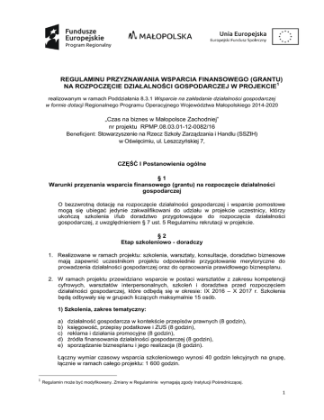 REGULAMINU PRZYZNAWANIA WSPARCIA FINANSOWEGO (GRANTU) NA ROZPOCZĘCIE DZIAŁALNOŚCI GOSPODARCZEJ W PROJEKCIE1 realizowanym w ramach Poddziałania 8.3.1 Wsparcie na zakładanie działalności gospodarczej w formie dotacji Regionalnego Programu Operacyjnego Województwa Małopolskiego 2014-2020 „Czas na biznes w Małopolsce Zachodniej” nr projektu RPMP.08.03.01-12-0082/16 Beneficjent: Stowarzyszenie na Rzecz Szkoły Zarządzania i Handlu (SSZIH) w Oświęcimiu, ul. Leszczyńskiej 7, CZĘŚĆ I Postanowienia ogólne §1 Warunki przyznania wsparcia finansowego (grantu) na rozpoczęcie działalności gospodarczej O bezzwrotną dotację na rozpoczęcie działalności gospodarczej i wsparcie pomostowe mogą się ubiegać jedynie zakwalifikowani do udziału w projekcie uczestnicy, którzy ukończą szkolenia i/lub doradztwo przygotowujące do rozpoczęcia działalności gospodarczej, z uwzględnieniem § 7 ust. 5 Regulaminu rekrutacji w projekcie. §2 Etap szkoleniowo - doradczy 1. Realizowane w ramach projektu: szkolenia, warsztaty, konsultacje, doradztwo biznesowe mają zapewnić uczestnikom projektu odpowiednie przygotowanie merytoryczne do prowadzenia działalności gospodarczej oraz do opracowania prawidłowego biznesplanu. 2. W ramach projektu przewidziano wsparcie w postaci warsztatów z zakresu kompetencji cyfrowych, warsztatów interpersonalnych, szkoleń i doradztwa przed rozpoczęciem działalności gospodarczej, które odbędą się w okresie: IX 2016 – X 2017 r. Szkolenia będą odbywały się w grupach liczących maksymalnie 15 osób. 1) Szkolenia, zakres tematyczny: a) b) c) d) e) działalność gospodarcza w kontekście przepisów prawnych (8 godzin), księgowość, przepisy podatkowe i ZUS (8 godzin), reklama i działania promocyjne (8 godzin), źródła finansowania działalności gospodarczej (8 godzin), sporządzanie biznesplanu i jego realizacja (8 godzin). Łączny wymiar czasowy wsparcia szkoleniowego wynosi 40 godzin lekcyjnych na grupę, łącznie w ramach całego projektu: 1 600 godzin. 1 Regulamin może być modyfikowany. Zmiany w Regulaminie wymagają zgody Instytucji Pośredniczącej. 1 2) Warsztaty z zakresu kompetencji cyfrowych, zakres tematyczny w zależności od poziomu zaawansowania grupy, obejmuje m.in. a) b) c) d) e) f) g) podstawy obsługi komputera, obsługa i konfiguracja poczty e-mail, word, arkusze kalkulacyjne, programy komputerowe wykorzystywane w działalności gospodarczej, social media-marketing w sieci (np. Facebook, Twitter), pozyskanie danych z Internetu, Obligatoryjnie panel o proekologicznym biznesie. Wymiar czasowy 8 godzin na grupę, łącznie 640 godzin. 3) Warsztaty interpersonalne, zakres tematyczny: a) b) c) d) motywacja i kreowanie własnej wartości negocjacje biznesowe, pozyskanie i obsługa klienta, radzenie sobie ze stresem i konfliktem oraz asertywność, Dodatkowo panel o niedyskryminacji i równości szans kobiet i mężczyzn, m.in. niedyskryminacja ze względu na płeć, rasę, niepełnosprawność w kontekście zatrudnianych pracowników, płace kobiet i mężczyzn). Wymiar czasowy 8 godzin na grupę, łącznie 640 godzin. 4) Indywidualne doradztwo biznesowe, zakres tematyczny: a) przygotowanie biznes planów, b) dopracowanie pomysłu uczestnika projektu na działalność gospodarczą, c) wskazanie ryzyk wynikających z założeń biznes planu, d) poprawność analizy finansowej, e) analiza rynku, analiza SWOT, f) promocja, pozyskanie klienta, wypracowanie lepszych rozwiązań, g) pomoc w przygotowaniu wniosku o przyznanie dotacji, wsparcie pomostowe, h) zaplanowanie działalności i przygotowanie uczestnika projektu do rejestracji firmy. Wymiar czasowy 30 godzin na uczestnika projektu, łącznie 18 000 godzin. Łączny wymiar wsparcia szkoleniowo – doradczego wraz z warsztatami wynosi 20 880 godzin. 3. Zajęcia szkoleniowe, warsztatowe odbywać się będą w miejscu dostosowanym do potrzeb wszystkich osób w grupie. Harmonogram szkoleń, warsztatów i doradztwa biznesowego zostanie podany na stronie internetowej projektu czasnabiznes.eu. Beneficjent zastrzega sobie prawo do zmiany terminów i miejsc szkoleń, warsztatów i doradztwa. 4. Wsparcie szkoleniowe i/lub doradcze realizowane jest na podstawie Umowy o świadczenie usług szkoleniowo-doradczych, zgodnej ze wzorem stanowiącym załącznik do Regulaminu rekrutacji w projekcie. 2 5. Zakres proponowanego doradztwa biznesowego udzielanego uczestnikom projektu przed rozpoczęciem działalności zakłada pomoc w przygotowaniu biznesplanu, wniosku o przyznanie dotacji, wniosku o przyznanie wsparcia pomostowego a także zaplanowaniu działalności i przygotowaniu uczestników do zarejestrowania firmy. 6. Etap szkoleniowo - doradczy zakończy się wydaniem zaświadczeń/certyfikatów potwierdzających uczestnictwo w szkoleniach, warsztatach, doradztwie biznesowym. Uzyskanie zaświadczenia jest jednym z warunków koniecznych do ubiegania się o środki finansowe na rozpoczęcie działalności gospodarczej, z uwzględnieniem § 7 ust. 5 Regulaminu rekrutacji w projekcie. 7. Uczestnik projektu zostaje wykluczony z uczestnictwa w projekcie, gdy: 1) opuści bez usprawiedliwienia więcej niż 20 % łącznej liczby godzin przewidzianych do realizacji na etapie szkoleniowo – doradczym2. 2) złoży oświadczenia niezgodne z prawdą. 8. Uczestnicy projektu są zobowiązani do zapoznania się z programem wsparcia, uczestnictwa w szkoleniach, warsztatach, doradztwie, podpisywania listy obecności na zajęciach oraz innych stosownych dokumentów, a także wykorzystania przysługującego wsparcia doradczego. 9. Uczestnicy projektu są zobowiązani do niezwłocznego poinformowania Beneficjenta o zmianie statusu na rynku pracy. Utrata statusu osoby bezrobotnej lub biernej zawodowo oznacza brak możliwości kontynuowania wsparcia szkoleniowo-doradczego przygotowującego do rozpoczęcia działalności gospodarczej oraz przyznania wsparcia finansowego. 10. Zgodnie z § 7 ust. 5 Regulaminu