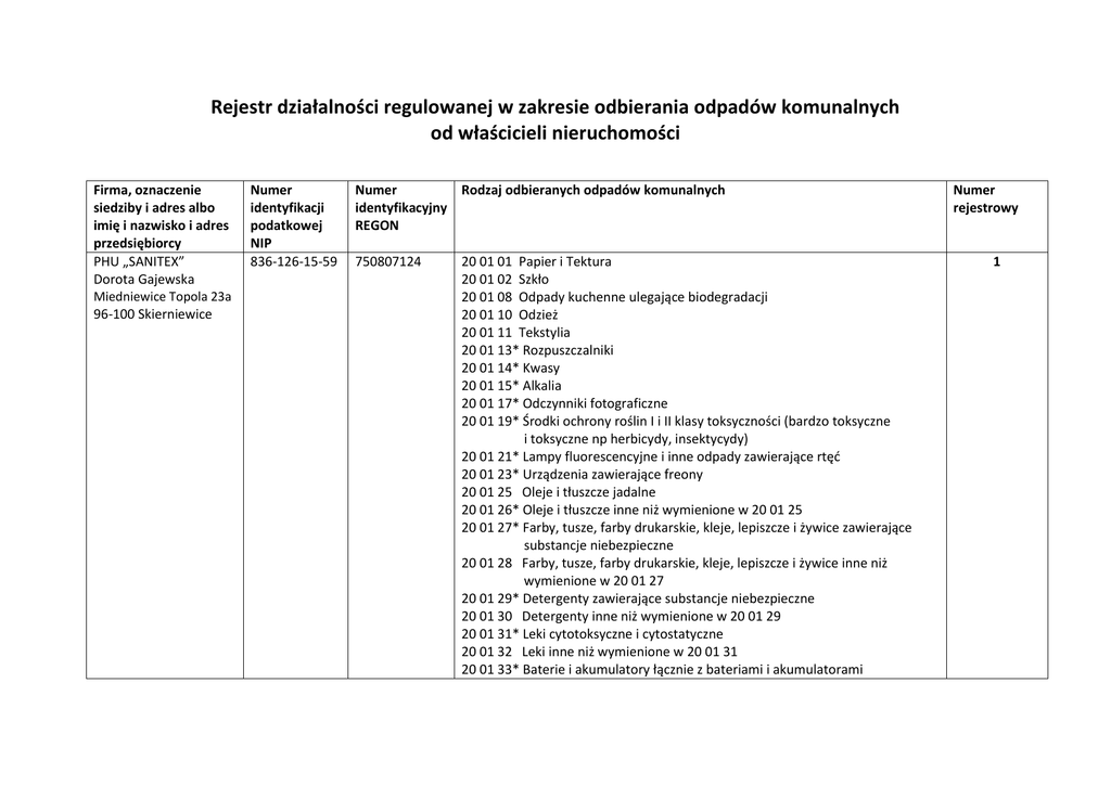 Rejestr działalności regulowanej w zakresie odbierania odpadów komunalnych od właścicieli nieruchomości Firma, oznaczenie siedziby i adres albo imię i nazwisko i adres przedsiębiorcy PHU „SANITEX” Dorota Gajewska Miedniewice Topola 23a 96-100 Skierniewice Numer identyfikacji podatkowej NIP 836-126-15-59 Numer Rodzaj odbieranych odpadów komunalnych identyfikacyjny REGON 750807124 20 01 01 Papier i Tektura 20 01 02 Szkło 20 01 08 Odpady kuchenne ulegające biodegradacji 20 01 10 Odzież 20 01 11 Tekstylia 20 01 13* Rozpuszczalniki 20 01 14* Kwasy 20 01 15* Alkalia 20 01 17* Odczynniki fotograficzne 20 01 19* Środki ochrony roślin I i II klasy toksyczności (bardzo toksyczne i toksyczne np herbicydy, insektycydy) 20 01 21* Lampy fluorescencyjne i inne odpady zawierające rtęć 20 01 23* Urządzenia zawierające freony 20 01 25 Oleje i tłuszcze jadalne 20 01 26* Oleje i tłuszcze inne niż wymienione w 20 01 25 20 01 27* Farby, tusze, farby drukarskie, kleje, lepiszcze i żywice zawierające substancje niebezpieczne 20 01 28 Farby, tusze, farby drukarskie, kleje, lepiszcze i żywice inne niż wymienione w 20 01 27 20 01 29* Detergenty zawierające substancje niebezpieczne 20 01 30 Detergenty inne niż wymienione w 20 01 29 20 01 31* Leki cytotoksyczne i cytostatyczne 20 01 32 Leki inne niż wymienione w 20 01 31 20 01 33* Baterie i akumulatory łącznie z bateriami i akumulatorami Numer rejestrowy 1 EKO-REGION Sp. z o.o. ul. Bawełniana 18, 97-400 Bełchatów 769-19-17-979 590765381 wymienionymi w 16 06 01, 16 06 02 lub 16 06 03 oraz nie sortowane baterie i akumulatory zawierające te baterie 20 01 34 Baterie i akumulatory inne niż wymienione w 20 01 33 20 01 35* Zużyte urządzenia elektryczne i elektroniczne inne niż wymienione w 20 01 21 i 20 01 23 zawierające niebezpieczne składniki (1) 20 01 36 Zużyte urządzenia elektryczne i elektroniczne inne niż wymienione w 20 01 21, 20 01 23 i 20 01 35 20 01 37* Drewno zawierające substancje niebezpieczne 20 01 38 Drewno inne niż wymienione w 20 01 37 20 01 39 Tworzywa sztuczne 20 01 40 Metale 20 01 41 Odpady zmiotek wentylacyjnych 20 01 80 Środki ochrony roślin inne niż wymienione w 20 01 19 20 01 99 Inne nie wymienione frakcje zbierane w sposób selektywny 20 02 01 Odpady ulegające biodegradacji 20 02 02 Gleba i ziemia, w tym kamienie 20 02 03 Inne odpady nie ulegające biodegradacji 20 03 01 Nie segregowane (zmieszane) odpady komunalne 20 03 02 Odpady z targowisk 20 03 03 Odpady z czyszczenia ulic i placów 20 03 06 Odpady ze studzienek kanalizacyjnych 20 03 07 Odpady wielkogabarytowe 20 03 99 Odpady komunalne nie wymienione w innych podgrupach 15 01 01 Opakowania z papieru i tektury 15 01 02 Opakowania z tworzyw sztucznych 15 01 03 Opakowania z drewna 15 01 04 Opakowania z metali 15 01 05 Opakowania wielomateriałowe 15 01 06 Zmieszane odpady opakowaniowe 15 01 07 Opakowania ze szkła 15 01 09 Opakowania z tekstyliów 15 01 10* Opakowania zawierające pozostałości substancji niebezpiecznych lub nimi zanieczyszczone (np. środkami ochrony roślin I i II klasy 2 toksyczności – bardzo toksyczne i toksyczne) 15 01 11* Opakowania z metali zawierające niebezpieczne porowate elementy wzmocnienia konstrukcyjnego (np. azbest), włącznie z pustymi pojemnikami ciśnieniowymi 16 01 03 Zużyte opony 17 01 01 Odpady betonu oraz gruz betonowy z rozbiórek i remontów 17 01 02 Gruz ceglany 17 01 03 Odpady innych materiałów ceramicznych i elementów wyposażenia 17 01 07 Zmieszane odpady z betonu, gruzu ceglanego, odpadowych materiałów ceramicznych i elementów wyposażenia inne niż wymienione w 17 01 06 17 02 01 Drewno 17 02 02 Szkło 17 02 03 Tworzywa sztuczne 17 03 02 Asfalt inny niż wymieniony w 17 03 01 17 04 01 Miedź, brąz, mosiądz 17 04 02 Aluminium 17 04 03 Ołów 17 04 04 Cynk 17 04 05 Żelazo i stal 17 04 06 Cyna 17 04 07 Mieszaniny metali 17 04 11 Kable inne niż wymienione w 17 04 10 17 05 08 Tłuczeń torowy (kruszywo)inny niż wymieniony w 17 05 07 17 06 04 Materiały izolacyjne inne niż wymienione w 17 06 01 i 17 06 03 17 08 02 Materiały konstrukcyjne zawierające gips inne niż wymienione w 17 08 01 17 09 04 Zmieszane odpady z budowy, remontów i demontażu inne niż wymienione w 17 09 01, 17 09 02 i 17 09 03 20 01 01 Papier i Tektura 20 01 02 Szkło 20 01 08 Odpady kuchenne ulegające biodegradacji 20 01 10 Odzież 20 01 11 Tekstylia 20 01 13* Rozpuszczalniki 20 01 14* Kwasy 20 01 15* Alkalia 20 01 17* Odczynniki fotograficzne 20 01 19* Środki ochrony roślin I i II klasy toksyczności (bardzo toksyczne i toksyczne np. herbicydy, insektycydy) 20 01 21* Lampy fluorescencyjne i inne odpady zawierające rtęć 20 01 23* Urządzenia zawierające freony 20 01 25 Oleje i tłuszcze jadalne 20 01 26* Oleje i tłuszcze inne niż wymienione w 20 01 25 20 01 27* Farby, tusze, farby drukarskie, kleje, lepiszcze i żywice zawierające substancje niebezpieczne 20 01 28 Farby, tusze, farby drukarskie, kleje, lepiszcze i żywice inne niż wymienione w 20 01 27 20 01 29* Detergenty zawierające substancje niebezpieczne 20 01 30 Detergenty inne niż wymienione w 20 01 29 20 01 31* Leki cytotoksyczne i cytostatyczne 20 01 32 Leki inne niż wymienione w 20 01 31 20 01 33* Baterie i akumulatory łącznie z bateriami i akumulatorami wymienionymi w 16 06 01, 16 06 02 lub 16 06 03 oraz nie sortowane baterie i akumulatory zawierające te baterie 20 01 34 Baterie i akumulatory inne niż wymienione w 20 01 33 20 01 35* Zużyte urządzenia elektryczne i elektroniczne inne niż wymienione w 20 01 21 i 20 01 23 zawierające niebezpieczne składniki (1) 20 01 36 Zużyte urządzenia elektryczne i elektroniczne inne niż wymienione w 20 01 21, 20 01 23 i 20 01 35 20 01 37* Drewno zawierające substancje niebezpieczne 20 01 38 Drewno inne niż wymienione w 20 01 37 20 01 39 Tworzywa sztuczne 20 01 40 Metale 20 01 41 Odpady zmiotek wentylacyjnych 20 01 80 Środki ochrony roślin inne niż wymienione w 20 01 19 20 01 99 20 02 01 2