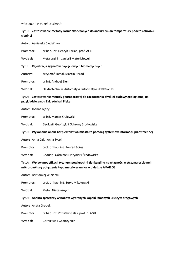 w kategorii prac aplikacyjnych: Tytuł: Zastosowanie metody różnic skończonych do analizy zmian temperatury podczas obróbki cieplnej Autor: Agnieszka Śledzińska Promotor: dr hab. inż. Henryk Adrian, prof. AGH Wydział: Metalurgii i Inżynierii Materiałowej Tytuł: Rejestracja sygnałów napięciowych biomedycznych Autorzy: Krzysztof Tomal, Marcin Herod Promotor: dr inż. Andrzej Bień Wydział: Elektrotechniki, Automatyki, Informatyki i Elektroniki Tytuł: Zastosowanie metody georadarowej do rozpoznania płytkiej budowy geologicznej na przykładzie zrębu Zakrzówka i Piekar Autor: Joanna Jędrys Promotor: dr inż. Marcin Krajewski Wydział: Geologii, Geofizyki i Ochrony Środowiska Tytuł: Wykonanie analiz bezpieczeństwa miasta za pomocą systemów informacji przestrzennej Autor: Anna Cała, Anna Sysoł Promotor: prof. dr hab. inż. Konrad Eckes Wydział: Geodezji Górniczej i Inżynierii Środowiska Tytuł: Wpływ modyfikacji tytanem powierzchni tlenku glinu na własności wytrzymałościowe i mikrostrukturę połączenia typu metal-ceramika w układzie Al/Al2O3 Autor: Bartłomiej Winiarski Promotor: prof. dr hab. inż. Borys Mikułowski Wydział: Metali Nieżelaznych Tytuł: Analiza sprzedaży wyrobów wybranych kopalń łamanych kruszyw drogowych Autor: Aneta Gródek Promotor: dr hab. inż. Zdzisław Gałaś, prof. n. AGH Wydział: Górnictwa i Geoinżynierii Tytuł: Audyt energetyczny budynku w Jordanowie Autor: Karol Stós, Jacek Szary Promotor: dr inż. Mariusz Filipowicz Wydział: Paliw i Energii Tytuł: Zastosowanie teorii grafów w statystyce Autor: Sylwia Cichacz Promotor: dr hab. Mariusz Woźniak, prof. AGH Wydział: Matematyki Stosowanej Tytuł: Oznaczanie składu gamma promieniotwórczych izotopów metodą sztucznych sieci neuronowych Autor: Sebastian Bożek Promotor: Dr inż. Zdzisław Stęgowski Wydział: Fizyki i Techniki Jądrowej w kategorii prac teoretycznych: Tytuł: Face Recognition from Still Camera Images Autorzy: Tomasz Arodź, Marcin Kurdziel Promotor: dr hab. inż. Witold Dzwinel, prof. n. AGH Wydział: Elektrotechniki, Automatyki, Informatyki i Elektroniki Tytuł: Rekonstrukcja warunków metamorfizmu skał formacji Elveflya (Ziemia Wedel Jarlsberga, Spitsbergen zachodni) na podstawie geotermobarometrii Autor: Jakub Bazarnik Promotor: dr inż. Maciej Manecki Wydział: Geologii, Geofizyki i Ochrony Środowiska Tytuł: Synteza i właściwości fizykochemiczne ferrytów magnezowo-cynkowych i manganowocynkowych Autor: Barbara Skołyszewska Promotor: prof. dr hab. inż. Kazimierz Przybylski Wydział: Inżynierii Materiałowej i Ceramiki Tytuł: Model Brace-Gątarek-Musiela przy wycenie opcji na stopę procentową Autor: Konrad Augustyński Promotor: dr inż. Jerzy Dzieża Wydział: Matematyki Stosowanej Tytuł: Klasyfikacja neuronów istoty czarnej pnia mózgu człowieka w schorzeniach neurodegeneracyjnych z wykorzystaniem synchrotronowej mikroskopii rentgenowskiej i wielowymiarowej analizy wariancji Autor: Katarzyna Fik-Mazgaj Promotor: dr hab. inż. Marek Lankosz, prof. n. AGH Wydział: Fizyki i Techniki Jądrowej