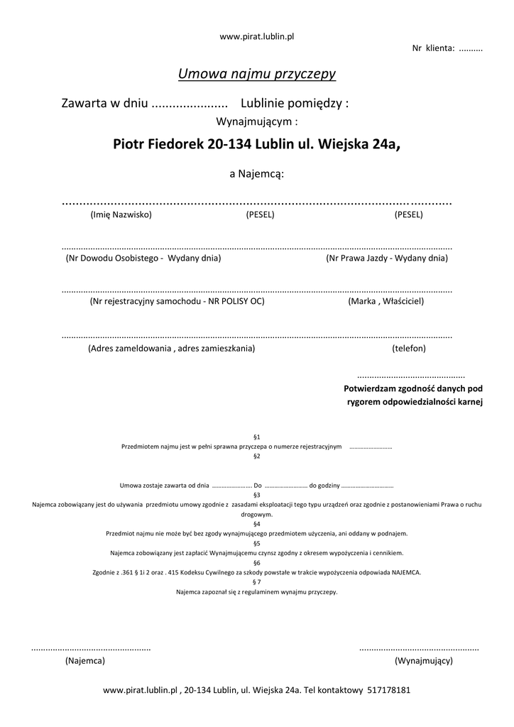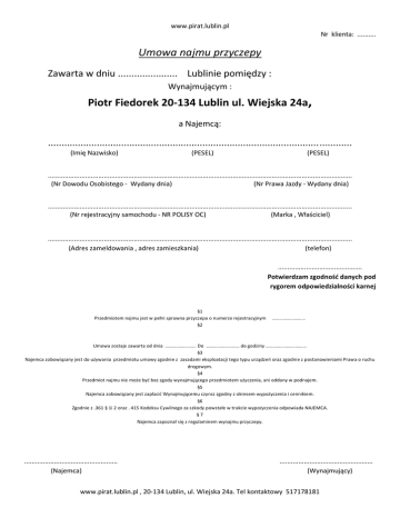 Umowa najmu przyczepy Piotr Fiedorek 20-134 Lublin ul