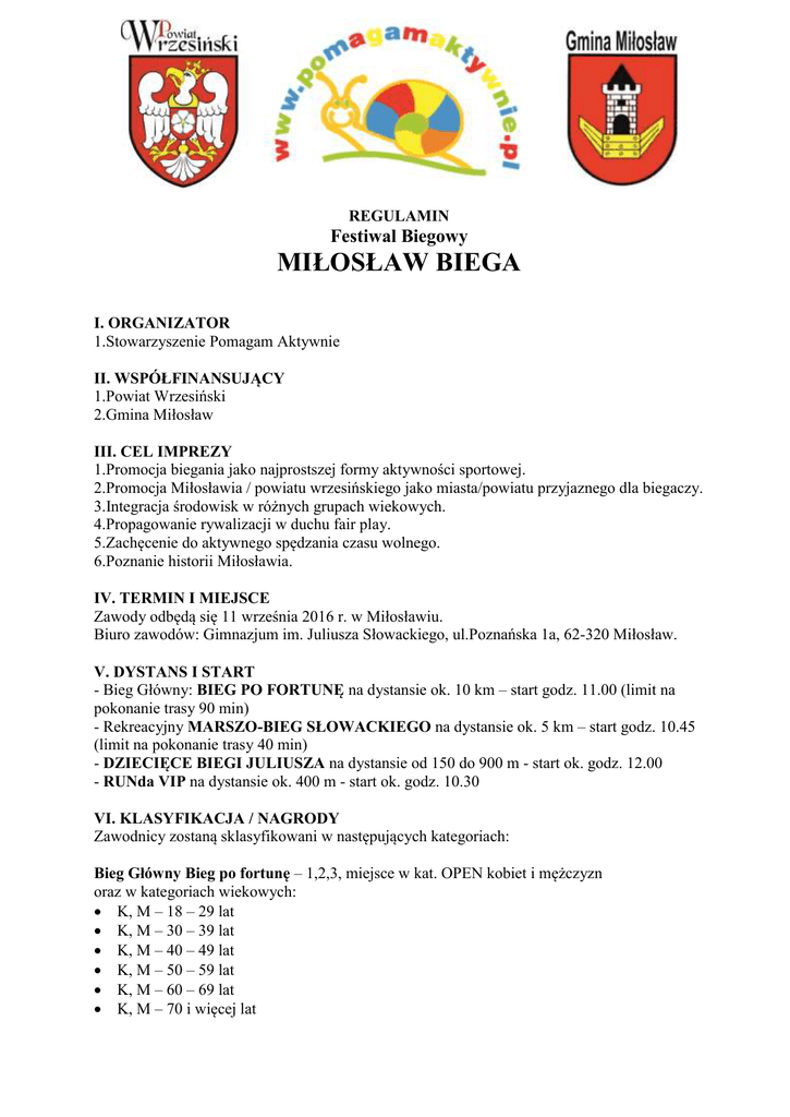 REGULAMIN Festiwal Biegowy MIŁOSŁAW BIEGA I. ORGANIZATOR 1.Stowarzyszenie Pomagam Aktywnie II. WSPÓŁFINANSUJĄCY 1.Powiat Wrzesiński 2.Gmina Miłosław III. CEL IMPREZY 1.Promocja biegania jako najprostszej formy aktywności sportowej. 2.Promocja Miłosławia / powiatu wrzesińskiego jako miasta/powiatu przyjaznego dla biegaczy. 3.Integracja środowisk w różnych grupach wiekowych. 4.Propagowanie rywalizacji w duchu fair play. 5.Zachęcenie do aktywnego spędzania czasu wolnego. 6.Poznanie historii Miłosławia. IV. TERMIN I MIEJSCE Zawody odbędą się 11 września 2016 r. w Miłosławiu. Biuro zawodów: Gimnazjum im. Juliusza Słowackiego, ul.Poznańska 1a, 62-320 Miłosław. V. DYSTANS I START - Bieg Główny: BIEG PO FORTUNĘ na dystansie ok. 10 km – start godz. 11.00 (limit na pokonanie trasy 90 min) - Rekreacyjny MARSZO-BIEG SŁOWACKIEGO na dystansie ok. 5 km – start godz. 10.45 (limit na pokonanie trasy 40 min) - DZIECIĘCE BIEGI JULIUSZA na dystansie od 150 do 900 m - start ok. godz. 12.00 - RUNda VIP na dystansie ok. 400 m - start ok. godz. 10.30 VI. KLASYFIKACJA / NAGRODY Zawodnicy zostaną sklasyfikowani w następujących kategoriach: Bieg Główny Bieg po fortunę – 1,2,3, miejsce w kat. OPEN kobiet i mężczyzn oraz w kategoriach wiekowych: K, M – 18 – 29 lat K, M – 30 – 39 lat K, M – 40 – 49 lat K, M – 50 – 59 lat K, M – 60 – 69 lat K, M – 70 i więcej lat OPEN: I miejsce: nagroda rzeczowa + puchar II miejsce: nagroda rzeczowa + puchar III miejsce: nagroda rzeczowa + puchar Nagrody w kategoriach wiekowych – drobne upominki dla najlepszych. Rekreacyjny Marszo-Bieg Słowackiego: - Pierwsze trzy osoby w kategorii kobiet i mężczyzn bez względu na wiek – drobne upominki. Dziecięce Biegi Juliusza Kategorie wstępne: (D1) 0 - 4 lata (D2) 5 - 6 lat (D3) 7 – 8 lat (D4) 9 – 10 lat (D5) 11 – 12 lat (D6) 13 – 14 lat (D7) 15 – 16 lat Trzy pierwsze miejsca wśród dziewczynek i chłopców w każdej kategorii wiekowej – dyplomy, upominki. Nagrody można odbierać tylko osobiście podczas ceremonii wręczania nagród ! Kategorie wiekowe ustalane są na podstawie roku urodzenia. Organizator zastrzega sobie możliwość zmiany kategorii ze względu na liczbę zgłoszeń. VII. WARUNKI UCZESTNICTWA Warunkiem uczestnictwa jest dokonanie rejestracji elektronicznej do biegu, opłacenie opłaty startowej przelewem elektronicznym oraz podpisanie deklaracji uczestnictwa podczas weryfikacji zawodników w dniu zawodów. Wypełnienie deklaracji uczestnictwa i dokonanie opłaty rejestracyjnej jest jednoznaczne z akceptacją niniejszego Regulaminu. WYSOKOŚĆ OPŁAT STARTOWYCH*: BIEG PO FORTUNĘ – 25,00 zł REKREACYJNY MARSZO-BIEG SŁOWACKIEGO – 15,00 zł DZIECIĘCE BIEGI JULIUSZA – 10,00 zł Termin zgłoszeń upływa 28 sierpnia br. lub po osiągnięciu limitu zgłoszeń. Po tym terminie zgłoszenia nie będą przyjmowane. Zgłoszenie = wypełnienie formularza zgłoszeniowego on-line + wpływ na rachunek organizatora opłaty startowej. Osoby poniżej 18 roku życia (niepełnoletnie) nie mogą startować w Biegu Głównym. Osoby niepełnoletnie mogą wystartować w Marszo-Biegu Słowackiego tylko za pisemną zgodą opiekunów prawnych. Wpłacona darowizna nie podlega zwrotowi. Darowizny nie można przepisywać na inną osobę. Limit zgłoszonych zawodników wynosi: Bieg Główny: „Bieg po fortunę” – 200 osób Rekreacyjny „Marszo-Bieg Słowackiego” – 200 osób „Dziecięce Biegi Juliusza” – 200 osób „RUNda VIP” - zaproszeni goście Listy startowe wszystkich www.pomagamaktywnie.pl konkurencji dostępne będą na stronie internetowej W zawodach mogą uczestniczyć osoby, które podpiszą oświadczenie, że startują na własną odpowiedzialność. W przypadku osób niepełnoletnich wymagana jest pisemna zgoda opiekunów prawnych na udział w zawodach (zgodę należy przedstawić w biurze zawodów podczas weryfikacji). Podczas weryfikacji zawodnicy muszą posiadać dowód osobisty lub inny dokument tożsamości umożliwiający identyfikację. VIII. BIURO ZAWODÓW Biuro zawodów zlokalizowane będzie w Gimnazjum im.Juliusza Słowackiego, ul.Poznańska 1a, 62-320 Miłosław. Do dyspozycji zawodników: -szatnia damska, -szatnia męska, -prysznice, -depozyt. Wydawanie depozytu odbywać się będzie za okazaniem numeru startowego. Zagubienie numeru startowego przez zawodnika zwalnia organizatora z wydania depozytu. IX. PROGRAM MINUTOWY 11.09.2016r. : 8:00 – 10:30 – 10:30 10:45 11:00 11:05 – – 11:30 11:00 – 13:00 10:30 – 11:45 12:15 13:15 - Weryfikacja uczestników Marszo-Biegu Słowackiego oraz Biegu po fortunę (Biuro Zawodów) Start: „RUNda VIP” Start: Rekreacyjny „Marszo-Bieg Słowackiego” Start: „Bieg po fortunę” Spodziewany pierwszy zawodnik na mecie „Rekreacyjnego MarszoBiegu Słowackiego” Spodziewany pierwszy zawodnik na mecie „Biegu po fortunę” Posiłek regeneracyjny, konkursy, atrakcje dla najmłodszych Weryfikacja uczestników „Dziecięcych Biegów Juliuszowych” (Biuro Zawodów) Start: „Dziecięce Biegi Juliuszowe” Ceremonia zakończenia (podsumowanie, wręczenie nagród) X. KONTAKT Stowarzyszenie Pomagam Aktywnie ul. Kosynierów 94, 62-300 Września e-mail: [email protected] www.facebook.pl/pomagamaktywnie www.pomagamaktywnie.pl XI. POSTANOWIENIA KOŃCOWE 1.Bieg odbędzie się bez względu na warunki atmosferyczne. 2.Odebranie numeru startowego jest równoznaczne z akceptacją regulaminu zawodów 3.Uczestnicy zawodów zobowiązani są do przestrzegania regulaminu, ogólnych zasad bezpieczeństwa i stosowania się do poleceń organizatorów i służb porządkowych. 4.Podczas biegu zawodnicy muszą posiadać numer startowy przypięty do koszulki z przodu, oraz chip do pomiaru czas wplątany w sznurowadło. Chip podlega zwrotowi do organizatora. 5.Zawodnicy pokonujący dystans biegu/marszu w sposób niedozwolony zostaną zdyskwalifikowani. 6.Zawodnicy wyrażają zgodę na przetwarza