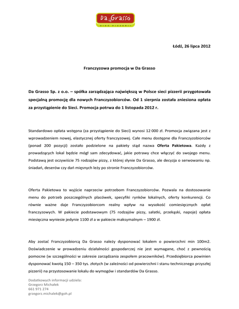 Łódź, 26 lipca 2012 Franczyzowa promocja w Da Grasso Da Grasso Sp. z o.o. – spółka zarządzająca największą w Polsce sieci pizzerii przygotowała specjalną promocję dla nowych Franczyzobiorców. Od 1 sierpnia została zniesiona opłata za przystąpienie do Sieci. Promocja potrwa do 1 listopada 2012 r. Standardowo opłata wstępna (za przystąpienie do Sieci) wynosi 12 000 zł. Promocja związana jest z wprowadzeniem nowej, elastycznej oferty franczyzowej. Całe menu dostępne dla Franczyzobiorców (ponad 200 pozycji) zostało podzielone na pakiety stąd nazwa Oferta Pakietowa. Każdy z prowadzących lokal będzie mógł sam zdecydować, jakie potrawy chce włączyć do swojego menu. Podstawą jest oczywiście 75 rodzajów pizzy, z której słynie Da Grasso, ale decyzja o serwowaniu np. śniadań, deserów czy dań mięsnych leży po stronie Franczyzobiorców. Oferta Pakietowa to wyjście naprzeciw potrzebom Franczyzobiorców. Pozwala na dostosowanie menu do potrzeb poszczególnych placówek, specyfiki rynków lokalnych, oferty konkurencji. Co równie ważne daje Franczyzobiorcom realny wpływ na wysokość comiesięcznych opłat franczyzowych. W pakiecie podstawowym (75 rodzajów pizzy, sałatki, przekąski, napoje) opłata miesięczna wyniesie jedynie 1100 zł a w pakiecie maksymalnym – 1900 zł. Aby zostać Franczyzobiorcą Da Grasso należy dysponować lokalem o powierzchni min 100m2. Doświadczenie w prowadzeniu działalności gospodarczej nie jest wymagane, choć z pewnością pomocne (w szczególności w zakresie zarządzania zespołem pracowników). Przedsiębiorca powinien dysponować kwotą 150 – 350 tys. złotych (w zależności od powierzchni i stanu technicznego przyszłej pizzerii) na przystosowanie lokalu do wymogów i standardów Da Grasso. Dodatkowych informacji udziela: Grzegorz Michałek 661 971 274 [email protected] Współpraca z Franczyzobiorcami Da Grasso wspiera Franczyzobiorców w każdej fazie współpracy. Na początku dostarcza szczegółowy instruktaż przygotowania placówki, projekty aranżacji oraz listę sprawdzonych wykonawców i kontaktów handlowych. Następnym etapem są bezpłatne, dostosowane do potrzeb szkolenia dla pracowników (nie tylko na początku, ale też przez cały okres prowadzenia działalności) oraz pomoc doświadczonych przedstawicieli w dniu uruchomienia lokalu. Na tym wsparcie się nie kończy. Zarządzający Siecią ustalają ofertę, opracowują receptury i doskonalą know-how prowadzenia placówki. Każdy przedsiębiorca otrzymuje stale aktualizowany system HACCP. Da Grasso dba o atesty produktów, audytuje potencjalnych partnerów handlowych, testuje surowce, oblicza szczegółowe koszty produkcji dań. We współpracy z profesjonalnymi dostawcami i znanymi producentami zapewnia dostępność wszelkich produktów i surowców oraz negocjuje atrakcyjne dla Franczyzobiorców warunki zakupu. Organizator Sieci prowadzi działania marketingowe i reklamowe na szczeblu ogólnopolskim, zarządza stroną www.dagrasso.pl i profilem www.facebook.com/DaGrassoPizzerie. Lokalne działania marketingowe Franczyzobiorcy organizują samodzielnie, ale mogą liczyć na pełne wsparcie centrali – od doradztwa strategicznego po przygotowanie graficzne materiałów. Po szczegóły dotyczące oferty zapraszamy na www.dagrassogroup.pl do sekcji Franczyza. Dodatkowych informacji udziela: Grzegorz Michałek 661 971 274 [email protected]