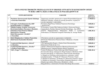 ZESTAWIENIE ŚRODKÓW PRZEKAZANYCH W DRODZE OTWARTYCH KONKURSÓW OFERT W ROKU 2008 NA RZECZ ORGANIZACJI POZARZĄDOWYCH LP STOWARZYSZENIE 1. Powiatowe Stowarzyszenie Sportu Szkolnego w Drawsku Pomorskim 2. Chorągiew Zachodniopomorska ZHP Komenda Hufca w Czaplinku Miejsko-Gminny Związek Towarzystw Krzewienia Kultury Fizycznej w Złocieńcu Ochotnicza StraŜ PoŜarna Oddział Ratownictwa Wodnego Klub Płetwonurków „MARES” w Koszalinie Klub Olimpijczyka w Kaliszu Pomorskim Klub Karate Kyokushin Złocieniec 3. 4. 5. 6. 7. 8. 9. Uczniowski Klub Sportowy „Szkwał” w Złocieńcu Uczniowski Klub Sportowy „Strzelec” w Kaliszu Pomorskim UKS „Traper” w Złocieńcu 10. Towarzystwo Rekreacyjno-Sportowe ZADANIE Organizacja zawodów sportowych w ramach Wojewódzkich Igrzysk MłodzieŜy Szkolnej, wyjazdy na zawody powiatowe, wyjazdy na zawody regionalne i wojewódzkie Powiatowy Rajd Pieszy Szlakiem Pojezierza Drawskiego „MAGULON” II Powiatowy Turniej Piłki Siatkowej Kobiet i Dziewcząt DruŜyn Amatorskich o Puchary Starosty Powiatu Drawskiego – kat. OPEN XXXVI Międzynarodowe Mistrzostwa Polski w Łowiectwie Podwodnym, IX Memoriał Fotografii Podwodnej im. Jerzego Macke I Powiatowe zawody na ergonometrze wioślarskim III Otwarte Mistrzostwa Pomorza Dzieci i MłodzieŜy w Karate Kyokushin VIII Ogólnopolskie Regaty o Puchar Ziemi Złocienieckiej, Mistrzostwa Polski do lat 11-tu Udział w Mistrzostwach Sportowo-Obronnych Stowarzyszeń MłodzieŜowych i Nagrodę Ministra Obrony Narodowej Turniej Wielkanocny Tenisa Stołowego Szkół Podstawowych Powiatu Drawskiego, Ekologiczne Biegi Przełajowe MłodzieŜy Szkół Powiatu Drawskiego, IV Mistrzostwa Szkół Powiatu Drawskiego w Biegach na Orientację szkoły podstawowe, gimnazja i szkoły ponadgimnazjalne, VI Runda XV Mistrzostw Pomorza i Kujaw w Biegach na Orientację, VII Runda XV Mistrzostw Pomorza i Kujaw w Biegach na Orientację, Wojewódzka Olimpiada MłodzieŜy w BnO, Międzywojewódzkie Mistrzostwa Młodzików w BnO, Bieg patrolowy o mistrzostwo Powiatu Drawskiego dla uczennic KWOTA DOTACJI 11.900,00 zł 3.000,00 zł 500,00 zł 1.000, 00 zł 1.500,00 zł 3.000,00 zł 4.800,00 zł 2.000,00 zł 5.000, 00 zł 434,00 zł 11. 12. 13. 14. „Anders” w Złocieńcu Towarzystwo Rekreacyjno-Sportowe „Anders” Złocieńcu Towarzystwo Rekreacyjno-Sportowe „Anders” Złocieńcu Klub Sportowy MLKS „Kolejarz”- KPPD S.A. Wierzchowo Czaplinecki Ośrodek Kultury, Sportu i Rekreacji w Czaplinku 15. Liga Obrony Kraju w Ostrowicach 16. Złocienieckie Towarzystwo Tenisa Stołowego w Złocieńcu 17. Złocieniecki Ośrodek Kultury w Złocieńcu 18. Złocieniecki Ośrodek Kultury w Złocieńcu Chorągiew Zachodniopomorska ZHP Komenda Hufca w Czaplinku 20. Towarzystwo Przyjaciół Dzieci, Koło Pomocy Dzieciom z Niepełną Sprawnością Ruchową w Kaliszu Pomorskim 21. Polski Związek Emerytów, Rencistów i Inwalidów, Zarząd Rejonowy w Drawsku Pomorskim 22. Gminny Ośrodek Kultury, Sportu i Turystyki w Wierzchowie 23. Caritas Parafii Św. Pawła Apostoła w Drawsku Pomorskim i uczniów szkół ponadgimnazjalnych i gimnazjów Turniej towarzyski piłki noŜnej halowej chłopców dla szkół ponadgimnazjalnych Powiatu Drawskiego Integracyjna Spartakiada Sportowo-Rekreacyjna Osób Niepełnosprawnych z terenu Powiatu Drawskiego Rozgrywki, mecze, turnieje sołectw Powiatu Drawskiego Powiatowy Turniej Piłki Siatkowej o Puchar Starosty Powiatu Drawskiego dla dorosłych, Regaty w klasie omega i kabinówek, turniej siatkowej piłki plaŜowej Zawody strzeleckie z broni małokalibrowej klubów strzeleckich Powiatu Drawskiego Mistrzostwa Powiatu Par Deblowych i Miksów, Otwarty Turniej Niepodległościowy. X Regionalny Przegląd Twórczości Poetyckiej Dzieci i MłodzieŜy pt. „Spotkanie z zajączkiem” Powiatowy konkurs na najpiękniejszą szopkę boŜonarodzeniową Zlot druŜyn harcerskich i zuchowych działających na terenie Powiatu Drawskiego II Powiatowe warsztaty „Spotkanie z jesienią” Organizacja wycieczki autokarowej, kursu zdrowego Ŝywienia Emerytów – Zarząd Rejonowy Drawsko Pomorskie, Wycieczka autokarowa Międzyzdroje –Świnoujście, organizacja Dnia Matki - Koło Czaplinek, Spotkanie Wigilijne, organizacja Dnia Matki – Koło Świerczyna, Organizacja pielgrzymki do Lichenia – Koło Wierzchowo, Organizacja Dnia Matki – Koło Kalisz Pomorski Artystyczne Spotkanie Seniorów – wyjazd zespołu ludowego „Sami Swoi” z programem festiwalowym do Międzyzdrojów Organizacja parafiady 2008 r. z okazji 80-lecia powstania Parafii Św. Pawła – prezentacja młodzieŜowych zespołów muzycznych 600,00 zł 600,00 zł 1.500,00 zł 2.000,00 zł 1.000,00 zł 500,00 zł 450,00 zł 400,00 zł 1.680, 00 zł 2.000,00 zł 4.800,00 zł 1.200,00 zł 500,00 zł 24. Polski Czerwony KrzyŜ Zachodniopomorski Zarząd Okręgowy w Szczecinie 25. Stowarzyszenie Przyjaciół Czaplinka w Czaplinku 26. Stowarzyszenie „Jesteśmy Razem” w Kaliszu Pomorskim 27. Miejski Klub Sportowy „Drawa” w Drawsko Pomorskie 28. Stowarzyszenie Pojezierza Drawskiego EuroRegion 2000 w Złocieńcu 29. Salezjańskie Stowarzyszenie Wychowania MłodzieŜy w Pile 30. Złocienieckie Stowarzyszenie „Złocieniecka Orkiestra Dęta” w Złocieńcu 31. Polski Związek Emerytów, Rencistów i Inwalidów, Zarząd Rejonowy Drawsko Pomorskie 32. Stowarzyszenie Pojezierza Drawskiego EuroRegion 2000 w Złocieńcu Szkolenie z zakresu udzielania pierwszej pomocy dla dzieci i młodzieŜy ze szkół podstawowych, gimnazjalnych i ponadgimnazjalnych Wydawanie lokalnego miesięcznika „Kurier Czaplinecki”, wznowienie druku ksiąŜki „Czaplinek 1945-2005, 60-ta rocznica powrotu do Macierzy” cz. I, wydanie cz. II ksiąŜki, „Dom Europa- budowany przez młodych Polaków i Białorusinów” 1.250,00 zł Powiatowy turniej piłkarski młodzików, powiatowy turniej piłkarski dla druŜyn oldbojów, powiatowy turniej piłkarski im. Waleriana Pytla „KaŜdy moŜe być Anioł