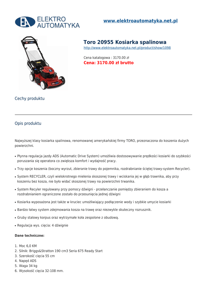 www.elektroautomatyka.net.pl Toro 20955 Kosiarka spalinowa http://www.elektroautomatyka.net.pl/product/show/1098 Cena katalogowa : 3170.00 zł Cena: 3170.00 zł brutto Cechy produktu Opis produktu Najwyższej klasy kosiarka spalinowa, renomowanej amerykańskiej firmy TORO, przeznaczona do koszenia dużych powierzchni. ● ● ● ● Płynna regulacja jazdy ADS (Automatic Drive System) umożliwia dostosowywanie prędkości kosiarki do szybkości poruszania się operatora co zwiększa komfort i wydajność pracy. Trzy opcje koszenia (boczny wyrzut, zbieranie trawy do pojemnika, rozdrabnianie ściętej trawy-system Recycler). System RECYCLER, czyli wielokrotnego mielenia skoszonej trawy i wciskania jej w głąb trawnika, aby przy koszeniu bez kosza, nie było widać skoszonej trawy na powierzchni trwanika. System Recyler regulowany przy pomocy dźwigni - przełanczanie pomiędzy zbieraniem do kosza a rozdrabnianiem ograniczone zostało do przesunięcia jednej dźwigni ● Kosiarka wyposażona jest także w kruciec umożliwiający podłączenie wody i szybkie umycie kosiarki ● Bardzo łatwy system zdejmowania kosza na trawę oraz niezwykle skuteczny rozrusznik. ● Gruby stalowy korpus oraz wytrzymałe koła zespolone z obudową. ● Regulacja wys. cięcia: 4 dźwignie Dane techniczne: 1. 2. 3. 4. 5. 6. Moc 6,0 KM Silnik: Briggs&Stratton 190 cm3 Seria 675 Ready Start Szerokość cięcia 55 cm Napęd ADS Waga 34 kg Wysokość cięcia 32-108 mm. 7. Pojemność kosza na trawę 65 l ELEKTRO-AUTOMATYKA Sprzedaż elektronarzędzi, urządzeń spawalniczych, maszyn budowlanych, pneumatyki, narzędzi warsztatowych, firmowych ubrań roboczych oraz maszyn ogrodowo leśnych. Sklep Bochnia ul. Brzeska 50 32-700 Bochnia Sklep Brzesko ul. Szarych Szeregów 23 32-800 Brzesko Serwis, Magazyn ul. Św. Brata Alberta 4 32-800 Brzesko tel. 691 572 333 e-mail: [email protected] tel. 609 523 230 e-mail: [email protected] tel. 609 523 645 e-mail: [email protected]