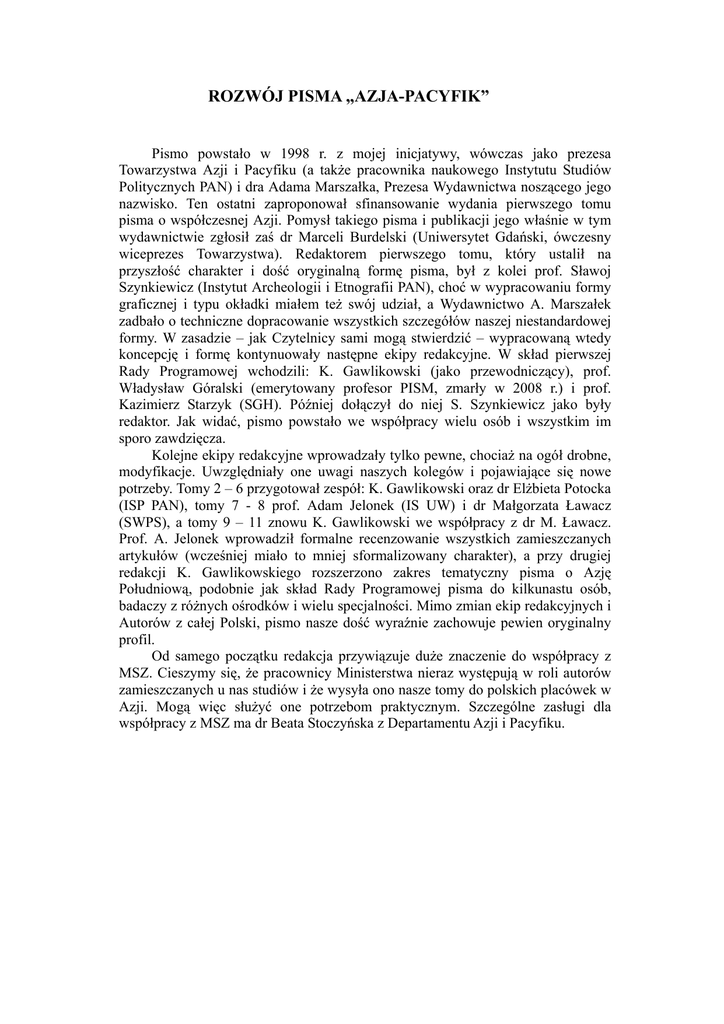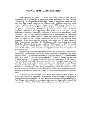 ROZWÓJ PISMA „AZJA-PACYFIK” Pismo powstało w 1998 r. z mojej inicjatywy, wówczas jako prezesa Towarzystwa Azji i Pacyfiku (a także pracownika naukowego Instytutu Studiów Politycznych PAN) i dra Adama Marszałka, Prezesa Wydawnictwa noszącego jego nazwisko. Ten ostatni zaproponował sfinansowanie wydania pierwszego tomu pisma o współczesnej Azji. Pomysł takiego pisma i publikacji jego właśnie w tym wydawnictwie zgłosił zaś dr Marceli Burdelski (Uniwersytet Gdański, ówczesny wiceprezes Towarzystwa). Redaktorem pierwszego tomu, który ustalił na przyszłość charakter i dość oryginalną formę pisma, był z kolei prof. Sławoj Szynkiewicz (Instytut Archeologii i Etnografii PAN), choć w wypracowaniu formy graficznej i typu okładki miałem też swój udział, a Wydawnictwo A. Marszałek zadbało o techniczne dopracowanie wszystkich szczegółów naszej niestandardowej formy. W zasadzie – jak Czytelnicy sami mogą stwierdzić – wypracowaną wtedy koncepcję i formę kontynuowały następne ekipy redakcyjne. W skład pierwszej Rady Programowej wchodzili: K. Gawlikowski (jako przewodniczący), prof. Władysław Góralski (emerytowany profesor PISM, zmarły w 2008 r.) i prof. Kazimierz Starzyk (SGH). Później dołączył do niej S. Szynkiewicz jako były redaktor. Jak widać, pismo powstało we współpracy wielu osób i wszystkim im sporo zawdzięcza. Kolejne ekipy redakcyjne wprowadzały tylko pewne, chociaż na ogół drobne, modyfikacje. Uwzględniały one uwagi naszych kolegów i pojawiające się nowe potrzeby. Tomy 2 – 6 przygotował zespół: K. Gawlikowski oraz dr Elżbieta Potocka (ISP PAN), tomy 7 - 8 prof. Adam Jelonek (IS UW) i dr Małgorzata Ławacz (SWPS), a tomy 9 – 11 znowu K. Gawlikowski we współpracy z dr M. Ławacz. Prof. A. Jelonek wprowadził formalne recenzowanie wszystkich zamieszczanych artykułów (wcześniej miało to mniej sformalizowany charakter), a przy drugiej redakcji K. Gawlikowskiego rozszerzono zakres tematyczny pisma o Azję Południową, podobnie jak skład Rady Programowej pisma do kilkunastu osób, badaczy z różnych ośrodków i wielu specjalności. Mimo zmian ekip redakcyjnych i Autorów z całej Polski, pismo nasze dość wyraźnie zachowuje pewien oryginalny profil. Od samego początku redakcja przywiązuje duże znaczenie do współpracy z MSZ. Cieszymy się, że pracownicy Ministerstwa nieraz występują w roli autorów zamieszczanych u nas studiów i że wysyła ono nasze tomy do polskich placówek w Azji. Mogą więc służyć one potrzebom praktycznym. Szczególne zasługi dla współpracy z MSZ ma dr Beata Stoczyńska z Departamentu Azji i Pacyfiku. Zmieniał się także układ instytucjonalny pisma. Do tomu 8. pismo wydawało Towarzystwo Azji i Pacyfiku, założone w Warszawie z mojej inicjatywy oraz grupy badaczy związanych z ISP PAN, a także z kręgiem prowadzonego tam od 1995 r. przeze mnie ogólnopolskiego Konwersatorium Dziejów Najnowszych i Tradycji Azji Wschodniej. Tam mieściła się także redakcja pisma. Od tomu 9. wydaje je towarzystwo noszące wprawdzie tę samą nazwę, ale w istocie inne, gdyż założył je dr A. Marszałek w Toruniu. Wiązało się to z zakończeniem działalności przez Towarzystwo warszawskie, w związku z wygaśnięciem jego rejestracji sądowej, której nie wznowiono. Pojawił się także wtedy nowy patron instytucjonalny pisma: Szkoła Wyższa Psychologii Społecznej (gdzie mieści się obecnie założone tam przeze mnie Centrum Cywilizacji Azji Wschodniej). W szkole tej naucza się języków i spraw azjatyckich, zorganizowano tam także nowy dział orientalny w bibliotece (kierowany przez M. Ławacz) i odbywają się konferencje naukowe o Azji Wschodniej. Patronat SWPS nie był więc przypadkowy. Tam obecnie mieści się Redakcja pisma, którą wspomagają prof. Jan Rowiński (ISM UW) i amb. Bogusław Zakrzewski, a od jesieni 2008 r. także prof. Bogdan Góralczyk (UW) – jako z-ca redaktora naczelnego – który powrócił z naszej placówki w Bangkoku. K.Gawlikowski Jesień 2008 r.
