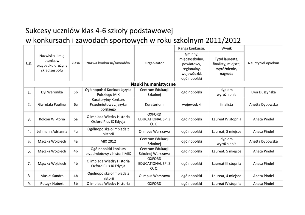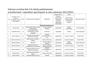 Sukcesy uczniów klas 4-6 szkoły podstawowej w konkursach i zawodach sportowych w roku szkolnym 2011/2012 L.p. Nazwisko i imię ucznia, w przypadku drużyny skład zespołu klasa Nazwa konkursu/zawodów Organizator Ranga konkursu: Gminny, międzyszkolny, powiatowy, regionalny, wojewódzki, ogólnopolski Wynik Tytuł laureata, finalisty, miejsce, wyróżnienie, nagroda Nauczyciel opiekun Nauki humanistyczne Centrum Edukacji Szkolnej ogólnopolski dyplom wyróżnienia Ewa Duszyoska Kuratorium wojewódzki finalista Anetta Dybowska Olimpiada Wiedzy Historia Oxford Plus IX Edycja OXFORD EDUCATIONAL SP. Z O. O. ogólnopolski Laureat IV stopnia Aneta Pindel 4a Ogólnopolska olimpiada z historii Olimpus Warszawa ogólnopolski Laureat, 8 miejsce Aneta Pindel Mączka Wojciech 4a MIX 2012 ogólnopolski dyplom wyróżnienia Anetta Dybowska 6. Mączka Wojciech 4b Ogólnopolski konkurs przedmiotowy z historii MIX ogólnopolski Laureat, 5 miejsce Aneta Pindel 7. Mączka Wojciech 4b Olimpiada Wiedzy Historia Oxford Plus IX Edycja ogólnopolski Laureat III stopnia Aneta Pindel 8. Musiał Sandra 4b Olimpus Warszawa ogólnopolski Laureat, 4 miejsce Aneta Pindel 9. Roszyk Hubert 5b OXFORD ogólnopolski Laureat IV stopnia Aneta Pindel 1. Dyl Weronika 5b 2. Gwizdała Paulina 6a 3. Kołcon Wiktoria 5a 4. Lehmann Adrianna 5. Ogólnopolski Konkurs Języka Polskiego MIX Kuratoryjny Konkurs Przedmiotowy z języka polskiego Ogólnopolska olimpiada z historii Olimpiada Wiedzy Historia Centrum Edukacji Szkolnej Centrum Edukacji Szkolnej Warszawa OXFORD EDUCATIONAL SP. Z O. O. Oxford Plus IX Edycja EDUCATIONAL SP. Z O. O. Religia 1. Gwizdała Paulina 6a 2. Kołcon Wiktoria 5a 3. Lehmann Adrianna 4a 4. Nelke Anita Wojewódzki Konkurs multimedialny pt:„ Jan Paweł II – człowiek modlitwy” Ogólnopolski Konkurs Wiedzy o Janie Pawle II pt: „Pielgrzymi szlak Jana Pawła II - III pielgrzymka do Polski” Wojewódzki Konkurs Plastyczny pt: „ Nasze serca dla Afryki, nasze dłonie dla Sudanu”. 6b Wojewódzki Konkurs Plastyczny „Chrystus nie ręką ludzką uczyniony”. 5. Roszyk Hubert 5b Wojewódzki Konkurs pt: „ Jan Paweł II - człowiek modlitwy” 6. Zaborowska Wiktoria 5a Wojewódzki Konkurs Plastyczny pt: „ Jan Paweł II - człowiek modlitwy” 7. Zaborowska Wiktoria 5a Wojewódzki Konkurs Plastyczny pt: „ Miłośd ponad wszelką miłośd”. Zespół Szkół im. Bydgoskich Olimpijczyków w Bydgoszczy wojewódzki Laureat 1 miejsce Joanna Hernacka Szkoła Podstawowa w Lublinie – Etap regionalny ZS w Łochowie ogólnopolski III miejsce w etapie regionalnym Joanna Hernacka Zespół Szkół nr 14 w Bydgoszczy wojewódzki wyróżnienie Joanna Hernacka Gminne Centrum Kultury Łochowo Zespół Szkół im. Bydgoskich Olimpijczyków w Bydgoszczy Zespół Szkół im. Bydgoskich Olimpijczyków w Bydgoszczy Zespół Szkół im. Bydgoskich Olimpijczyków wojewódzki II miejsce i Wyróżnienie Wójta Gminy Białe Błota Joanna Hernacka wojewódzki wyróżnienie Joanna Hernacka wojewódzki wyróżnienie Joanna Hernacka wojewódzki wyróżnienie Joanna Hernacka w Bydgoszczy Nauki przyrodnicze 1. Lehmann Adrianna 4a Ogólnopolska olimpiada przedmiotowa z przyrody Olimpus – sesja jesienna 2. Lehmann Adrianna 4a Ogólnopolska olimpiada przedmiotowa z przyrody Olimpus – sesja wiosenna 5b Przedmiot pamiątkowy wykonany z materiałów wtórnych lub pochodzących z recyklingu. 3. Strzelewicz Sara Ogólnopolskie Olimpiady Przedmiotowe Olimpus Ogólnopolskie Olimpiady Przedmiotowe Olimpus ogólnopolski 7 miejsce Agnieszka Błaszczyk ogólnopolski 7 miejsce Agnieszka Błaszczyk wojewódzki nagroda Agnieszka Błaszczyk Towarzystwo Upowszechniania Wiedzy i Nauk Matematycznych ogólnopolski wyróżnienie Emilia Turowska Firma Olimpus ogólnopolski laureat Emilia Turowska Łowcy Talentów Jersz Centrum Edukacji Szkolnej Centrum Edukacji Szkolnej Centrum edukacji Szkolnej Wydział Matematyki i Informatyki Uniwersytet Mikołaja ogólnopolski wyróżnienie Emilia Turowska ogólnopolski laureat Renata Błaszak ogólnopolski dyplom wyróżnienia Grażyna Puzio ogólnopolski laureat Renata Błaszak międzynarodowy wyróżnienie Renata Błaszak Wojewoda Kujawsko-Pomorski Nauki ścisłe 1. Lehmann Adrianna 4a Międzynarodowy konkurs „Kangur Matematyczny” Ogólnopolska Olimpiada Matematyczna Olimpus. Sesja jesienna Alfik matematyczny konkurs z matematyki „Albus 2012” 2. Lehmann Adrianna 4a 3. Lehmann Adrianna 4a 4. Musiał Maciej 6a 5. Płaczkiewicz Paweł 5b Albus 6. Stefaoski Paweł 6b konkurs z matematyki „Albus 2012” 7. Stefaoski Paweł 6b Kangur matematyczny 8. Sucharska Paulina 4a Kangur matematyczny 9. Twardowska Monika 4a Ogólnopolska Olimpiada Matematyczna Olimpus. Sesja jesienna Kopernika Towarzystwo Upowszechniania Wiedzy i Nauk Matematycznych Firma Olimpus ogólnopolski wyróżnienie Emilia Turowska ogólnopolski wyróżnienie Emilia Turowska Laureat pierwszego stopnia z wyróżnieniem Janiszewska Aleksandra Laureat drugiego stopnia Janiszewska Aleksandra Języki obce 1. Behrendt Maja 4b TEST OXFORD PLUS 19.EDYCJA Oxford Educational ogólnopolski 2. Behrendt Maja 4b TEST OXFORD PLUS 18.EDYCJA Oxford Educational ogólnopolski 3. Behrendt Maja 4b Centrum Edukacji Szkolnej ogólnopolski 13 miejsce i dyplom wyróżnienia Janiszewska Aleksandra 4. Bugalski Wojciech 6a ogólnopolski laureat II stopnia Renata Stanowska 5. Bugalski Wojciech 6a ogólnopolski laureat III stopnia Renata Stanowska 6. Bugalski Wojciech 6a ogólnopolski miejsce 17 Renata Stanowska 7. Czajkowska Oliwia 5b ogólnopolski laureat III stopnia Renata Stanowska 8. Czajkowska Oliwia 5b ogólnopolski laureat V stopnia Renata Stanowska 9. Czajkowska Oliwia 5b ogólnopolski miejsce 16 Renata Stanowska Ogólnopolski Konkurs MIX 2012 Olimpiada Wiedzy Oxford Plus 18. Edycja Olimpiada Wiedzy Oxford Plus 19. Edycja Albus Olimpiada Wiedzy Oxford Plus 19. Edycja Olimpiada Wiedzy Oxford Plus 18. Edycja Albus Oxford Educational Sp. z O.O. Oxford Educational 