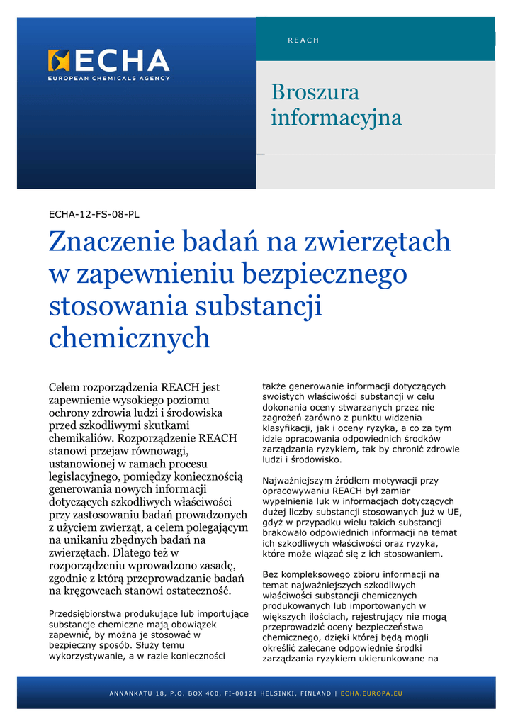 REACH Broszura informacyjna ECHA-12-FS-08-PL Znaczenie badań na zwierzętach w zapewnieniu bezpiecznego stosowania substancji chemicznych Celem rozporządzenia REACH jest zapewnienie wysokiego poziomu ochrony zdrowia ludzi i środowiska przed szkodliwymi skutkami chemikaliów. Rozporządzenie REACH stanowi przejaw równowagi, ustanowionej w ramach procesu legislacyjnego, pomiędzy koniecznością generowania nowych informacji dotyczących szkodliwych właściwości przy zastosowaniu badań prowadzonych z użyciem zwierząt, a celem polegającym na unikaniu zbędnych badań na zwierzętach. Dlatego też w rozporządzeniu wprowadzono zasadę, zgodnie z którą przeprowadzanie badań na kręgowcach stanowi ostateczność. Przedsiębiorstwa produkujące lub importujące substancje chemiczne mają obowiązek zapewnić, by można je stosować w bezpieczny sposób. Służy temu wykorzystywanie, a w razie konieczności także generowanie informacji dotyczących swoistych właściwości substancji w celu dokonania oceny stwarzanych przez nie zagrożeń zarówno z punktu widzenia klasyfikacji, jak i oceny ryzyka, a co za tym idzie opracowania odpowiednich środków zarządzania ryzykiem, tak by chronić zdrowie ludzi i środowisko. Najważniejszym źródłem motywacji przy opracowywaniu REACH był zamiar wypełnienia luk w informacjach dotyczących dużej liczby substancji stosowanych już w UE, gdyż w przypadku wielu takich substancji brakowało odpowiednich informacji na temat ich szkodliwych właściwości oraz ryzyka, które może wiązać się z ich stosowaniem. Bez kompleksowego zbioru informacji na temat najważniejszych szkodliwych właściwości substancji chemicznych produkowanych lub importowanych w większych ilościach, rejestrujący nie mogą przeprowadzić oceny bezpieczeństwa chemicznego, dzięki której będą mogli określić zalecane odpowiednie środki zarządzania ryzykiem ukierunkowane na ANNANKATU 18, P.O. BOX 400, FI-00121 HELSINKI, FINLAND | ECHA.EUROPA.EU uniknięcie lub ograniczenie narażenia. W przypadku tego rodzaju substancji szczególnie często brakuje dostępnych informacji na temat właściwości, takich jak działanie toksyczne na narządy w następstwie długotrwałego narażenia, potencjał w zakresie wywoływania raka, działanie toksyczne na rozwijający się płód, działanie toksyczne na funkcje rozrodcze, lub długotrwałe działanie toksyczne na środowisko wodne. Wymagania w zakresie informacji standardowych Rejestrujący w ramach systemu REACH mają obowiązek przekazywać wszelkie stosowne i dostępne informacje na temat swoistych właściwości substancji w swojej dokumentacji rejestracyjnej. Informacje te, które należy zamieścić w dokumentacji rejestracyjnej przedsiębiorstwa, zależą od poziomu wielkości obrotu, w jakim dana substancja jest importowana lub produkowana. Większe zakresy wielkości obrotu dla danej substancji uznaje się za wskaźnik większego potencjału w zakresie wyrządzania szkód dla zdrowia ludzi i środowiska, jak również konieczności przeprowadzenia bardziej szczegółowych badań niż w przypadku mniejszych zakresów wielkości obrotu. W załącznikach VII, VIII, IX i X do rozporządzenia określono, jakie informacje są wymagane przy wielkościach obrotu wynoszących odpowiednio 1, 10, 100 lub 1000 bądź więcej ton rocznie na rejestrującego. Są to tak zwane „wymagania w zakresie informacji standardowych”, i są one najwyższe w odniesieniu do substancji produkowanych lub importowanych w ilościach co najmniej 1000 ton rocznie. W razie braku dostępności danych w zakresie zasadniczego („podstawowego”) zestawu informacji obejmujących wiele swoistych właściwości danej substancji (określonych w załącznikach VII i VIII), rejestrujący są odpowiedzialni za wygenerowanie tych danych i przekazanie ich w swojej dokumentacji rejestracyjnej. W zależności od danej właściwości, wymagania w zakresie informacji standardowych mogą określać informacje, jakie można uzyskać w następstwie standardowych badań. W zależności od określonego badania wykorzystuje się zazwyczaj bakterie, komórki pochodzące z hodowli lub zwierzęta. Informacje podstawowe mają na przykład wykazać, czy pojedyncze narażenie bądź narażenie trwające kilka godzin lub dni może wyrządzić poważne szkody dla zdrowia ludzi lub środowiska. Informacje pochodzące z innych badań, przeprowadzanych na przykład na komórkach bakteryjnych, mogą wskazywać potencjał danej substancji w zakresie wywoływania raka. Przy większych wielkościach obrotu obowiązują dodatkowe wymagania w zakresie informacji (określone w załącznikach IX i X). W przypadku takich wielkości wymagane są bardziej szczegółowe i obszerne informacje, które można uzyskać przy zastosowaniu tzw. badań wyższego rzędu. W razie stwierdzenia luk w danych, których nie można wypełnić w inny sposób, rejestrujący mają obowiązek przeprowadzić badania wyższego rzędu w celu spełnienia wymagań określonych w załącznikach IX i X. Zanim jednak będzie można rozpocząć takie badania, rejestrujący muszą przedłożyć propozycje przeprowadzenia badań oraz uzyskać od ECHA wcześniejsze zatwierdzenie. Niektóre z badań mających umożliwić ocenę właściwości substancji, zwłaszcza w odniesieniu do rejestracji substancji produkowanych lub importowanych w dużych ilościach, przeprowadza się na zwierzętach doświadczalnych. W przypadku większości szkodliwych właściwości badanych z użyciem zwierząt doświadczalnych wykorzystuje się szczury i myszy, ale używane są również inne gatunki (specjalnie wyhodowane szczepy), takie jak króliki, świnki morskie i ryby, a w rzadkich przypadkach także ptaki. REACH nakłada jednak wymóg, zgodnie z którym badania obejmujące wykorzystanie żywych zwierząt należy przeprowadzać zgodnie z przepisami ustanowionymi na podstawie dyrektywy 2010/63/UE w sprawie ochrony zwierząt wykorz