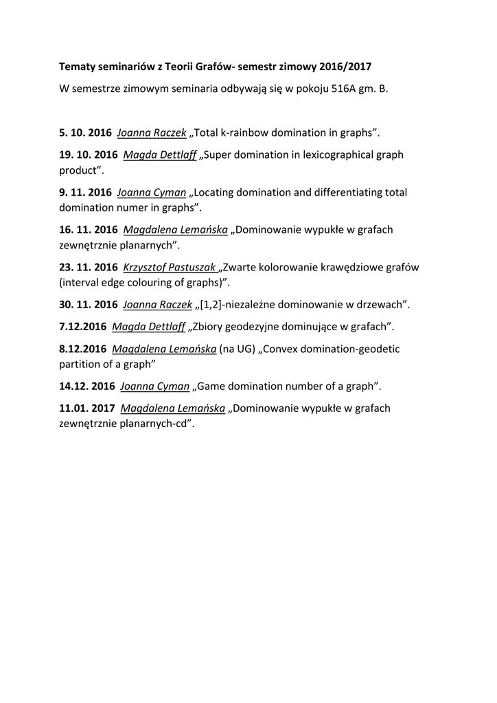Tematy seminariów z Teorii Grafów- semestr zimowy 2016/2017 W semestrze zimowym seminaria odbywają się w pokoju 516A gm. B. 5. 10. 2016 Joanna Raczek „Total k-rainbow domination in graphs”. 19. 10. 2016 Magda Dettlaff „Super domination in lexicographical graph product”. 9. 11. 2016 Joanna Cyman „Locating domination and differentiating total domination numer in graphs”. 16. 11. 2016 Magdalena Lemańska „Dominowanie wypukłe w grafach zewnętrznie planarnych”. 23. 11. 2016 Krzysztof Pastuszak „Zwarte kolorowanie krawędziowe grafów (interval edge colouring of graphs)”. 30. 11. 2016 Joanna Raczek „[1,2]-niezależne dominowanie w drzewach”. 7.12.2016 Magda Dettlaff „Zbiory geodezyjne dominujące w grafach”. 8.12.2016 Magdalena Lemańska (na UG) „Convex domination-geodetic partition of a graph” 14.12. 2016 Joanna Cyman „Game domination number of a graph”. 11.01. 2017 Magdalena Lemańska „Dominowanie wypukłe w grafach zewnętrznie planarnych-cd”.