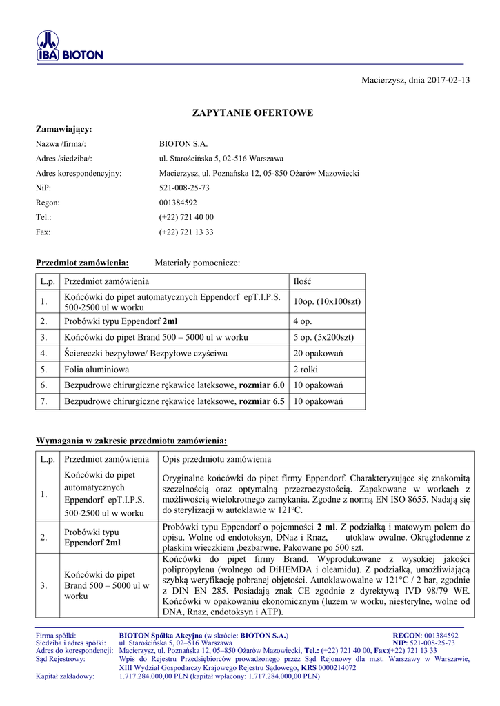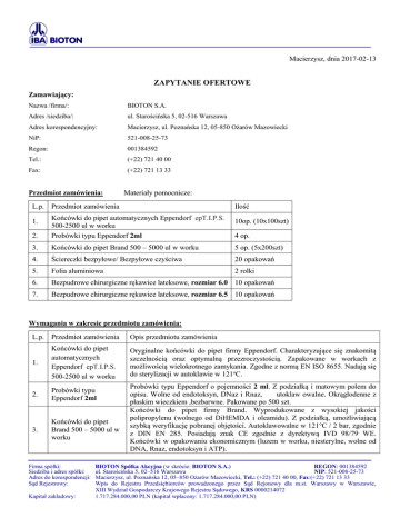 Macierzysz, dnia 2017-02-13 ZAPYTANIE OFERTOWE Zamawiający: Nazwa /firma/: BIOTON S.A. Adres /siedziba/: ul. Starościńska 5, 02-516 Warszawa Adres korespondencyjny: Macierzysz, ul. Poznańska 12, 05-850 Ożarów Mazowiecki NiP: 521-008-25-73 Regon: 001384592 Tel.: (+22) 721 40 00 Fax: (+22) 721 13 33 Przedmiot zamówienia: Materiały pomocnicze: L.p. Przedmiot zamówienia Ilość 2. Końcówki do pipet automatycznych Eppendorf epT.I.P.S. 500-2500 ul w worku Probówki typu Eppendorf 2ml 3. Końcówki do pipet Brand 500 – 5000 ul w worku 5 op. (5x200szt) 4. Ściereczki bezpyłowe/ Bezpyłowe czyściwa 20 opakowań 5. Folia aluminiowa 2 rolki 6. Bezpudrowe chirurgiczne rękawice lateksowe, rozmiar 6.0 10 opakowań 7. Bezpudrowe chirurgiczne rękawice lateksowe, rozmiar 6.5 10 opakowań 1. 10op. (10x100szt) 4 op. Wymagania w zakresie przedmiotu zamówienia: L.p. Przedmiot zamówienia 1. Końcówki do pipet automatycznych Eppendorf epT.I.P.S. 500-2500 ul w worku 2. Probówki typu Eppendorf 2ml 3. Końcówki do pipet Brand 500 – 5000 ul w worku Firma spółki: Siedziba i adres spółki: Adres do korespondencji: Sąd Rejestrowy: Kapitał zakładowy: Opis przedmiotu zamówienia Oryginalne końcówki do pipet firmy Eppendorf. Charakteryzujące się znakomitą szczelnością oraz optymalną przezroczystością. Zapakowane w workach z możliwością wielokrotnego zamykania. Zgodne z normą EN ISO 8655. Nadają się do sterylizacji w autoklawie w 121oC. Probówki typu Eppendorf o pojemności 2 ml. Z podziałką i matowym polem do opisu. Wolne od endotoksyn, DNaz i Rnaz, utoklaw owalne. Okrągłodenne z płaskim wieczkiem ,bezbarwne. Pakowane po 500 szt. Końcówki do pipet firmy Brand. Wyprodukowane z wysokiej jakości polipropylenu (wolnego od DiHEMDA i oleamidu). Z podziałką, umożliwiającą szybką weryfikację pobranej objętości. Autoklawowalne w 121°C / 2 bar, zgodnie z DIN EN 285. Posiadają znak CE zgodnie z dyrektywą IVD 98/79 WE. Końcówki w opakowaniu ekonomicznym (luzem w worku, niesterylne, wolne od DNA, Rnaz, endotoksyn i ATP). BIOTON Spółka Akcyjna (w skrócie: BIOTON S.A.) REGON: 001384592 ul. Starościńska 5, 02–516 Warszawa NIP: 521-008-25-73 Macierzysz, ul. Poznańska 12, 05–850 Ożarów Mazowiecki, Tel.: (+22) 721 40 00, Fax:(+22) 721 13 33 Wpis do Rejestru Przedsiębiorców prowadzonego przez Sąd Rejonowy dla m.st. Warszawy w Warszawie, XIII Wydział Gospodarczy Krajowego Rejestru Sądowego, KRS 0000214072 1.717.284.000,00 PLN (kapitał wpłacony: 1.717.284.000,00 PLN) 4 5. 6. 7. Ściereczki bezpyłowe/ Bezpyłowe czyściwa Folia aluminiowa Bezpudrowe chirurgiczne rękawice lateksowe, rozmiar 6.0 Bezpudrowe chirurgiczne rękawice lateksowe, rozmiar 6.5 Wysokowydajne, białe składane ściereczki. Idealne do przemysłowych zastosowań takich jak: sprzątanie, wycieranie linii technologicznych, wchłaniania dużych ilości płynów. Folia aluminiowa do szerokości 50 cm, długości 100 m i grubości 0,05mm Rękawice chirurgiczne, bezpudrowe,lateksowe, jałowe. Pakowane osobno. Zróżnicowany na prawą i lewą dłoń, anatomiczny kształt. Rękawice chirurgiczne, bezpudrowe,lateksowe, jałowe. Pakowane osobno. Zróżnicowany na prawą i lewą dłoń, anatomiczny kształt. Termin i miejsce wykonania zamówienia: Wymagany maksymalny termin realizacji: 2 tygodnie Miejsce: Macierzysz Opis sposobu przygotowania oferty: Oferta musi zawierać: Pełną nazwę oferenta, Adres lub siedzibę oferenta, numer telefonu oraz numer NIP, Termin ważności oferty, Oferta musi być podpisana przez osobę lub osoby uprawnione do występowania w obrocie prawnym w imieniu oferenta, przy czym podpis musi być czytelny lub opisany pieczątkami firmowymi, Warunki płatności i dostawy: Wartość przedmiotu dostawy powinna być podana w cenie netto + podatek VAT, który oferent jest zobowiązany obliczyć zgodnie z obowiązującymi przepisami; Cena uwzględnia przedmiot zamówienia spełniający opisane wymagania oraz zawiera wszystkie koszty związane z realizacją zamówienia (w tym koszty dostawy); Podstawą wystawienia faktury przez wykonawcę jest protokół odbioru przedmiotu zamówienia i podpisany przez pracownika Zamawiającego upoważnionego do dokonania takiej czynności. Sposób oceny oferty: Firma BIOTON S.A. dokona oceny otrzymanych ofert kierując się następującymi kryteriami: 1. Jakość zaoferowanych produktów, w tym okres ważności, 2. Cena wraz z warunkami płatności, 3. Czas dostawy oferowanych produktów lub usług, 4. Doświadczenie w zakresie realizacji przedmiotu niniejszego zapytania ofertowego. W wyniku analizy otrzymanych ofert zostanie wyselekcjonowany dostawca. BIOTON S.A. może zwrócić się do oferentów o dodatkowe informacje lub spotkania w siedzibie firmy celem wyjaśnienie ewentualnych niejasności dotyczących przedmiotu zamówienia. Ponadto Zamawiający przy dokonywaniu wyboru Wykonawcy będzie się kierował elementarnymi zasadami obowiązującymi na wspólnotowym jednolitym rynku europejskim, m.in.: zasadą przejrzystości i jawności prowadzonego postępowania, zasadą uczciwej konkurencji, zasadą swobody przepływu kapitału, towarów, dóbr i usług, zasadą niedyskryminacji i równego traktowania wykonawców na rynku. Wybór zostanie dokonany w oparciu o najbardziej korzystną ekonomicznie i jakościowo ofertę. Wymagania stawiane oferentowi: Oferent musi wykazywać się doświadczeniem w zakresie przechowywania i dostarczania sprzętu laboratoryjnego. Firma spółki: Siedziba i adres spółki: Adres do korespondencji: Sąd Rejestrowy: Kapitał zakładowy: BIOTON Spółka Akcyjna (w skrócie: BIOTON S.A.) REGON: 001384592 ul. Starościńska 5, 02–516 Warszawa NIP: 521-008-25-73 Macierzysz, ul. Poznańska 12, 05–850 Ożarów Mazowiecki, Tel.: (+22) 721 40 00, Fax:(+22) 721 13 33 Wpis do Rejestru Przedsiębiorców prowadzonego przez Sąd Rejonowy dla m.st. Warszawy w Warszawie, XIII Wydział Gospodarczy Krajowego Rejestru Sądowego, 