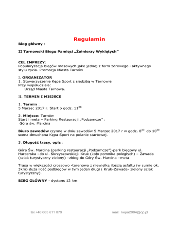 Bieg główny : Regulamin II Tarnowski Biegu Pamięci „Żołnierzy Wyklętych” CEL IMPREZY: Popularyzacja biegów masowych jako jednej z form zdrowego i aktywnego stylu życia. Promocja Miasta Tarnów I. ORGANIZATOR 1. Stowarzyszenie Kępa Sport z siedzibą w Tarnowie Przy współudziale: Urząd Miasta Tarnowa. II. TERMIN I MIEJSCE 1. Termin : 5 Marzec 2017 r. Start o godz. 1100 2. Miejsce: Tarnów Start i meta – Parking Restauracji „Podzamcze” : Góra św. Marcina Biuro zawodów czynne w dniu zawodów 5 Marzec 2017 r w godz. 830 do 1030 scena dmuchana Kępa Sport na polanie startowej. 3. Długość trasy, opis : Góra Św. Marcina (parking restauracji „Podzamcze”)-park biegowy ul. Harcerska –do ul. Skrzyszowskiej- Kruk (koło pomnika poległych) – Zawada (szlak turystyczny zielony) –zbieg do Góry Św. Marcina –meta Trasa w większości crossowo -terenowa z niewielką ilością asfaltu (w sumie ok. 3km) duża ilość podbiegów w tym jeden długi ( Kruk-Zawada- zielony szlak turystyczny). BIEG GŁÓWNY - dystans 12 km tel.+48 665 611 079 mail: [email protected] Kategorie biegu głównego: Generalna: Kobiet i Mężczyzn Mężczyźni: M-1 16 – 29 lat M-2 30 – 39 lat M-3 40 – 49 lat M-4 50 – 59 lat M-5 60 lat i więcej Kobiety K-1 16 – 29 lat K-2 30 – 39 lat K-3 40 – 49 lat K-4 50 lat i więcej Podłoże trasy : Bieg w 80% terenowy z dużą ilością przewyższeń (przekrój mapy na stronie biegu) Trasa biegu odbędzie się na jednej pętli !!! Trasa oznakowana co 2 km Zgłoszenie uczestnictwa (rejestracja) i opłata startowa: 1. Zapisy do biegu dostępne na stronie www.kepa sport.pl 2. Przy zapisie on-line uczestnicy biegu zobowiązani są do wpłacenia: # 50 zł wpisowego do dnia 10 lutego 2017r # 60 zł wpisowego do 28 lutego 2017 # 70 zł wpisowego do 5 marca (w biurze zawodów) Wpłat dokonujemy na konto organizatora: Pekao s.a nr konta : 83 1050 1562 1000 0023 0002 8913 Tytuł wpłaty: Nazwa Biegu, Imię i Nazwisko Zawodnika tel.+48 665 611 079 mail: [email protected] 4. Wpisanie na listę startową i przydzielenie numeru startowego nastąpi po zaksięgowaniu opłaty startowej na koncie Organizatora. 5. W przypadku opłaty startowej uiszczonej przelewem, osoba która nie zostanie oznaczona jako opłacona na liście startowej , zobligowana jest podczas weryfikacji w biurze zawodów do okazania dowodu wpłaty w formie wydruku. 6. W przypadku rezygnacji z uczestnictwa opłata startowa nie podlega zwrotowi, nie ma możliwości przeniesienia jej na inną osobę. 7. Istnieje możliwość wniesienia opłaty grupowej. W tytule przelewu należy wpisać dane wszystkich zgłoszonych osób. Pomiar czasu: elektroniczny CHIP zwrotny (bez kaucji) WARUNKI UCZESTNICTWA w BIEGU : • Impreza ma charakter otwarty. • Prawo uczestnictwa w biegu mają osoby pełnoletnie, oraz osoby w wieku od 16 lat (ur. 2001r.), jeśli mają pisemną zgodę rodziców. • Warunkiem dopuszczenia zawodnika do biegu będzie własnoręczne podpisanie zaświadczenia o braku przeciwwskazań zdrowotnych do uczestnictwa w biegu, które będzie dostępne w biurze zawodów i na stronie www.kepasportbiegi.pl /Dz.Ustaw nr 101, poz 1095/ lub przedstawienie przez uczestnika zaświadczenia lekarskiego o braku przeciwwskazań do udziału w biegu. • W ramach opłaty startowej każdy uczestnik biegu głównego otrzymuje pakiet startowy, na który składają się: o numer startowy o artykuły pozyskane od sponsorów o worek na odzież o materiały informacyjne i reklamowe o pamiątkowy medal na mecie lub suwenir o posiłek na mecie • Podczas biegu uczestnicy muszą posiadać numery startowe przekazane przez organizatora, przypięte z przodu do koszulki startowej. Zasłanianie numeru startowego w części lub w całości jest niedopuszczalne pod karą dyskwalifikacji • Uczestnicy pokonujący dystans w sposób niedozwolony zostaną zdyskwalifikowani. • Zabrania się startu zawodnikom będącym pod wpływem alkoholu, bądź innych środków odurzających. .Uwaga !!uczestnicy zostaną wyposażeni w plecaki imitujące plecaki z II wojny światowej wyłożone od wewnątrz gąbką . Bieg z w/w plecakiem jest obowiązkowy POSTANOWIENIA KOŃCOWE: • Impreza odbędzie się bez względu na warunki atmosferyczne. • Wszyscy uczestnicy biorą udział na własną odpowiedzialność i nie będą wnosić żadnych roszczeń w stosunku do organizatorów w razie zaistnienia zdarzeń losowych podczas trwania imprezy. tel.+48 665 611 079 mail: [email protected] • Dyrektor biegu zastrzega sobie możliwość zmian w regulaminie, o których jest zobowiązany poinformować wszystkich uczestników przed rozpoczęciem imprezy. • Organizator zapewnia opiekę medyczną na trasie i mecie. • Organizator biegu zapewnia dla uczestników posiłek i napoje po biegu, oraz medale lub suwenir • Odebranie numeru startowego przez uczestnika biegu głównego jest równoznaczne z akceptacją Regulaminu. • Organizator zaleca uczestnikom posiadanie aktualnych badań lekarskich stwierdzających zdolność do udziału w biegu długodystansowym. • Depozyt zostanie umiejscowiony na polanie startowej • Wartość i ilość nagród rzeczowych jest uzależniona od ilości pozyskanych sponsorów. • Organizator nie odpowiada za rzeczy pozostawione bez opieki w trakcie imprezy. • Parkingi dla samochodów znajduję się poniżej oraz powyżej polany startowej. • Organizator zastrzega sobie prawo do przeprowadzenia z każdym z uczestników wywiadu, robienia mu zdjęć i filmowania na potrzeby reklamowe, promocyjne, wykorzystania w Internecie lub w transmisjach radiowotelewizyjnych oraz na inne potrzeby komercyjne. • Organizator zastrzega sobie prawo do nieodpłatnego wykorzystywania wszelkich zdjęć, materiałów filmowych, wywiadów i nagrań dźwiękowych przedstawiających uczestników biegu. Mogą one być wykorzystane przez Organizatora poprzez umieszczanie na nośnikach elektronicznych, w katalogach oraz mediach, na str