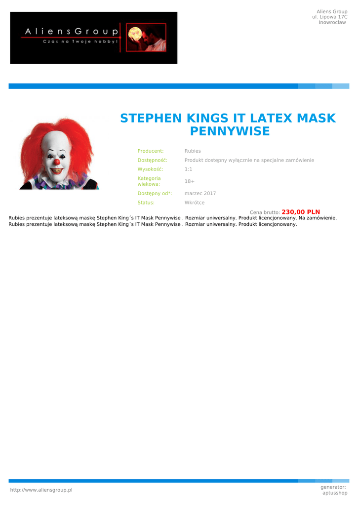 Aliens Group ul. Lipowa 17C Inowrocław STEPHEN KINGS IT LATEX MASK PENNYWISE Producent: Rubies Dostępność: Produkt dostępny wyłącznie na specjalne zamówienie Wysokość: 1:1 Kategoria wiekowa: 18+ Dostępny od*: marzec 2017 Status: Wkrótce Cena brutto: 230,00 PLN Rubies prezentuje lateksową maskę Stephen King´s IT Mask Pennywise . Rozmiar uniwersalny. Produkt licencjonowany. Na zamówienie. Rubies prezentuje lateksową maskę Stephen King´s IT Mask Pennywise . Rozmiar uniwersalny. Produkt licencjonowany. http://www.aliensgroup.pl generator: aptusshop