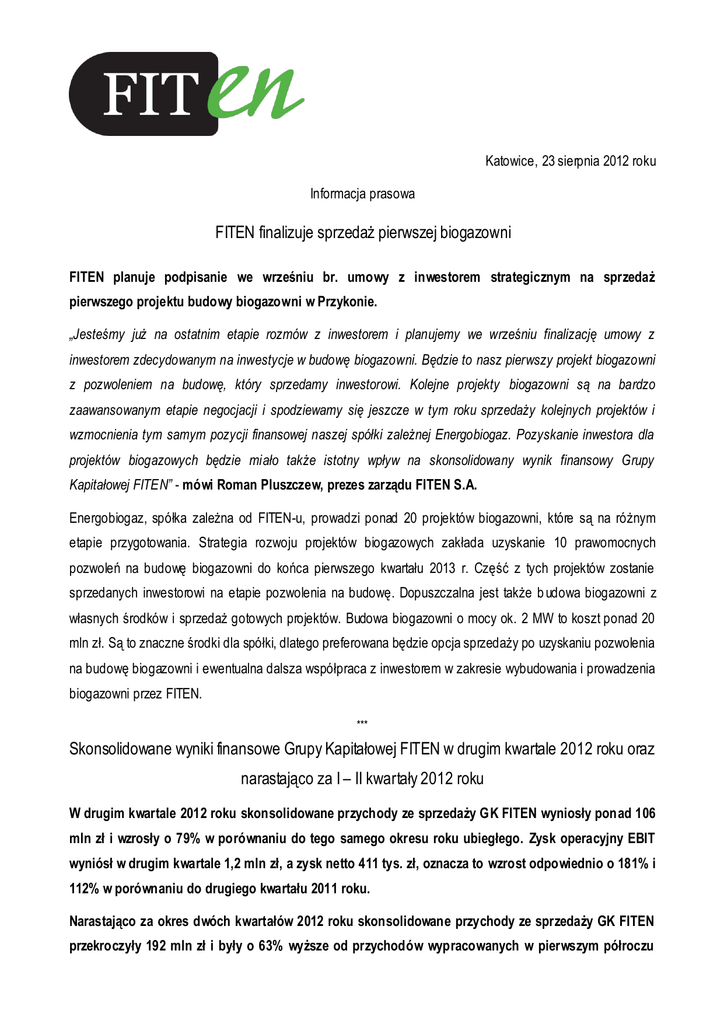 Katowice, 23 sierpnia 2012 roku Informacja prasowa FITEN finalizuje sprzedaż pierwszej biogazowni FITEN planuje podpisanie we wrześniu br. umowy z inwestorem strategicznym na sprzedaż pierwszego projektu budowy biogazowni w Przykonie. „Jesteśmy już na ostatnim etapie rozmów z inwestorem i planujemy we wrześniu finalizację umowy z inwestorem zdecydowanym na inwestycje w budowę biogazowni. Będzie to nasz pierwszy projekt biogazowni z pozwoleniem na budowę, który sprzedamy inwestorowi. Kolejne projekty biogazowni są na bardzo zaawansowanym etapie negocjacji i spodziewamy się jeszcze w tym roku sprzedaży kolejnych projektów i wzmocnienia tym samym pozycji finansowej naszej spółki zależnej Energobiogaz. Pozyskanie inwestora dla projektów biogazowych będzie miało także istotny wpływ na skonsolidowany wynik finansowy Grupy Kapitałowej FITEN” - mówi Roman Pluszczew, prezes zarządu FITEN S.A. Energobiogaz, spółka zależna od FITEN-u, prowadzi ponad 20 projektów biogazowni, które są na różnym etapie przygotowania. Strategia rozwoju projektów biogazowych zakłada uzyskanie 10 prawomocnych pozwoleń na budowę biogazowni do końca pierwszego kwartału 2013 r. Część z tych projektów zostanie sprzedanych inwestorowi na etapie pozwolenia na budowę. Dopuszczalna jest także b udowa biogazowni z własnych środków i sprzedaż gotowych projektów. Budowa biogazowni o mocy ok. 2 MW to koszt ponad 20 mln zł. Są to znaczne środki dla spółki, dlatego preferowana będzie opcja sprzedaży po uzyskaniu pozwolenia na budowę biogazowni i ewentualna dalsza współpraca z inwestorem w zakresie wybudowania i prowadzenia biogazowni przez FITEN. *** Skonsolidowane wyniki finansowe Grupy Kapitałowej FITEN w drugim kwartale 2012 roku oraz narastająco za I – II kwartały 2012 roku W drugim kwartale 2012 roku skonsolidowane przychody ze sprzedaży GK FITEN wyniosły ponad 106 mln zł i wzrosły o 79% w porównaniu do tego samego okresu roku ubiegłego. Zysk operacyjny EBIT wyniósł w drugim kwartale 1,2 mln zł, a zysk netto 411 tys. zł, oznacza to wzrost odpowiednio o 181% i 112% w porównaniu do drugiego kwartału 2011 roku. Narastająco za okres dwóch kwartałów 2012 roku skonsolidowane przychody ze sprzedaży GK FITEN przekroczyły 192 mln zł i były o 63% wyższe od przychodów wypracowanych w pierwszym półroczu 2011 roku. Zysk operacyjny GK FITEN w pierwszym półroczu tego roku wyniósł 1,9 mln zł i był wyższy od wypracowanego w tym samym okresie roku ubiegłego o 103%. Zysk netto jaki zanotowała GK FITEN za sześć miesięcy 2012 roku wyniósł 630 tys. zł. Skonsolidowane wyniki finansowe GK FITEN dane w tys. zł I - II kwartał I - II kwartał zmiana /% / 2012 2011 /narastająco/ /narastająco/ przychody netto ze spr zedaży 192 053 117 599 63% zysk z działalności operacyjnej 1 860 917 103% zysk netto 630 642 -2% EBITDA 2 035 1 071 90% II kwartał II kwartał 2011 zmiana /% / 2012 106 783 1 235 411 1 324 59 671 440 194 523 79% 181% 112% 153% „W pierwszym półroczu osiągnęliśmy wysokie dynamiki wzrostu przychodów i wyniku operacyjnego głównie dzięki zwiększaniu skali podstawowej działalności, czyli handlu energią elektryczną. Przychody wygenerowane z działalności w obszarze energii odnawialnej w pierwszym półroczu wyniosły ponad 1,4 mln zł i nadal stanowią niewielki ułamek przychodów całej Grupy. Skonsolidowany wynik netto w pierwsz ym półroczu 2012 był nieznacznie niższy od wypracowanego w pierwszym półroczu roku ubiegłego i na jego poziom miały wpływ dwa czynniki. Po pierwsze straty w spółkach zależnych zajmujących się energia odnawialną: biomasą i biogazem. Po drugie różnice kursowe powstałe w FITEN S.A. w wyniku rozliczeń transakcji kupna i sprzedaży energii elektrycznej na giełdzie towarowej. Spodziewamy się w kolejnych okresach stabilizacji w wynikach finansowych segmentu produkcji biomasy, ponieważ nasza instalacja do produkcji pelletu produkuje już pełnowartościowy surowiec, który możemy sprzedawać odbiorcom. Natomiast w segmencie biogazu kluczowe dla poprawy wyników będzie pozyskanie inwestora strategicznego i sprzedaż pierwszego projektu biogazowni.” – mówi Roman Pluszczew, prezes zarządu FITEN S.A. Segment produkcji biomasy i biogazownie W drugim kwartale 2012 miał miejsce rozruch w zakładzie produkcyjnym pelletu w Tułowicach. W ostatniej dekadzie czerwca zakład rozpoczął ciągłą produkcję. Trwają jeszcze działania o charakterze technicznym zmierzające do osiągnięcia zakładanej wydajności. Pierwsze przychody z tytułu sprzedaży pelletu własnej produkcji zostały już osiągnięte. W segmencie biogazu działania w drugim kwartale skoncentrowane były na poszukiwaniu i rozm owach z potencjalnymi inwestorami lub partnerami w projektach biogazowych. Oprócz działań w kierunku sprzedaży projektów, Energobiogaz S.A. (spółka zależna od FITEN S.A. odpowiedzialna za segment biogazu) prowadził normalną działalność operacyjną polegającą na rozwijaniu projektów biogazowych. *** Grupa Kapitałowa FITEN to dynamicznie rozwijająca się firma zajmująca się hurtowym obrotem energią elektryczną na rynku polskim oraz rynkach europejskich, sprzedażą energii klientom końcowym oraz inwestycjami w o dnawialne źródła energii. FITEN powstał w styczniu 2007 roku jako spółka utworzona przez Famur International Trade S.A., należącej do Grupy FAMUR. W listopadzie 2007 roku w Famur International Trade S.A. powołano dział obrotu energią elektryczną. Wkrótce spr zedaż energii stała się główny m przedmiotem działalności firmy. W listopadzie 2008 r. nastąpiła zmiana nazwy fir my na FITEN Spółka Akcyjna. Doszło też do emisji akcji i podwyższenia kapitału spółki do 10.600.000 zł. W grudniu 2008 roku inwestorem strateg icznym FITEN S.A. został fundusz Coöperatief Avallon MBO U.A. Tym samym Spółka przestała wchodzić w skład Grupy F