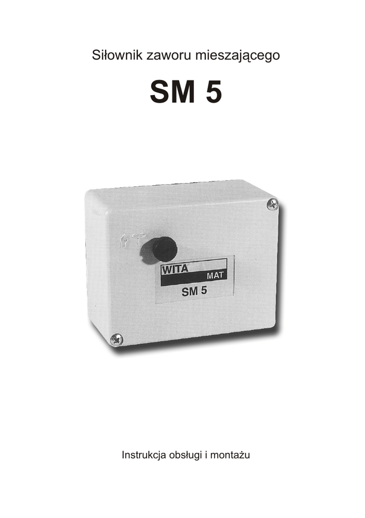 Si³ownik zaworu mieszaj¹cego SM 5 Instrukcja obs³ugi i monta¿u Si³ownik SM 5 Si³owniki z typoszeregu SM 5 charakteryzuj¹ siê kompaktow¹ budow¹ i solidnym wykonaniem. Pod obudow¹ z tworzywa sztucznego umieszczone s¹: przek³adnia o maksymalnym momencie obrotowym 6Nm lub 10 Nm, silnik synchroniczny, dwie przestawne krzywki wy³¹czników krañcowych oraz listwa zaciskowa. Monta¿ i obs³uga Monta¿ si³ownika mo¿e dokonywaæ tylko instalator posiadaj¹cy wa¿ne uprawnienia i odpowiednie przygotowanie merytoryczne. Bezwzglêdnie nie wolno montowaæ si³owników osobom postronnym, nie posiadaj¹cym specjalistycznej wiedzy dotycz¹cej si³owników elektrycznych, ich zasady pracy oraz zasad pod³¹czenia z automatyk¹ instalacji. Dziêki uniwersalnym lub specjalnym adapterom lub ró¿nym wa³kom napêdowym monta¿ SM 5 jest praktycznie mo¿liwy wszêdzie gdzie jest to wymagane. Rêczne przestawienie zaworu mieszaj¹cego nastêpuje poprzez wciœniêcie czarnego, plastikowego pokrêt³a znajduj¹cego siê na przedniej stronie si³ownika i obrót . K¹t obrotu si³ownika SM 5 fabrycznie ustawiony jest na 900. Fabrycznie si³ownik SM5 wyposa¿ony jest w adapter nr 50 przeznaczony do monta¿u na ¿eliwnych zaworach mieszaj¹cych typu H firmy WITA . Sposób monta¿u si³ownika na zaworze jest rozrysowany krok po kroku i znajduje siê w woreczku razem z odpowiednim adapterem. W celu monta¿u na zaworach mieszaj¹cych innych producentów oferujemy specjalne adaptery (patrz tabela). Zawory mieszaj¹ce, na których zamontowane s¹ si³owniki nale¿y przed rozpoczêciem ka¿dego sezonu grzewczego „rozruszaæ”, tzn. sprawdziæ czy podczas okresu przestoju centralnego ogrzewania nie nast¹pi³o zapieczenie serca zaworu. Czynnoœæ powy¿sza mo¿e uchroniæ si³ownik przed zniszczeniem przek³adni zêbatej. Dane techniczne Typ Moment obrotowy Napiêcie zasilania SM 5 6 Nm 230 V 50 Hz 24 V 50 Hz SM 5 10 Nm 230 V 50 Hz 24 V 50 Hz K¹t obrotu 900 900 60 s, 150 s, 210 s 60 s, 150 s, 210 s Czas obrotu o k¹t 900 IP 51 IP 51 Rodzaj ochrony 1 1 Klasa ochrony Wszystkie czasy i napiêcia zasilania mog¹ byæ ze sob¹ kombinowane. Wyposa¿enie dodatkowe Na ¿yczenie: Trzeci wy³¹cznik krañcowy ( 3A / 250 V) Specjalne adaptery przeznaczone dla ró¿nych mieszaczy Adapter nr 50 Dla mieszaczy: WITA typu Minimix i H Ms Adapter nr 52 Dla mieszaczy: Holter BR Adapter nr 54 Dla mieszaczy: PAW Ms - H Adapter nr 51 Dla mieszaczy: WITA typu H wykonanych z ¿eliwa, w tym zespo³y WITA Bloc Adapter nr 53 Dla mieszaczy: Landis & Gyr, Elesta (seria G), ESBE / PAW, Danfoss HRE Ustawienie dodatkowego wy³¹cznika krañcowego Umieœciæ wkrêtak p³aski w naciêciu tarczy krzywkowej dla dodatkowego wy³¹cznika krañcowego i nastêpnie ruchem obrotowym przesun¹æ tarczê krzywkow¹ w ¿¹dan¹ pozycjê. Schemat wymiarowy Rêczne przestawienie si³ownika Po³¹czenie elektryczne Siownik SM 5 nale¿y pod³¹czyæ zawsze wed³ug za³¹czonych rysunków. Plan pod³¹czenia SM 5 Przewód 4 x 0.75 Æ Plan pod³¹czenia SM 5 z dodatkowym wy³¹cznikiem krañcowym Przewód 7 x 0.75 Æ Przewód zerowy zawsze pod³¹czamy na zacisku N . Napiêcie na zacisku powoduje prawe obroty wa³u si³ownika . Napiêcie na zacisku powoduje lewe obroty wa³u si³ownika. Zmiany kierunków obrotów mo¿na dokonaæ poprzez zamianê przewodów na zaciskach. UWAGA! Fazy i zero nie mog¹ byæ zamieniane.