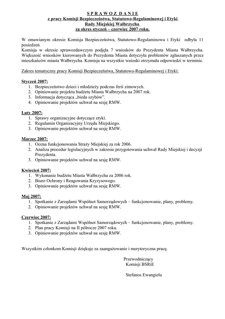 SPRAWOZ DANIE z pracy Komisji Bezpieczeństwa, Statutowo-Regulaminowej i Etyki Rady Miejskiej Wałbrzycha za okres styczeń – czerwiec 2007 roku. W omawianym okresie Komisja Bezpieczeństwa, Statutowo-Regulaminowa i Etyki odbyła 11 posiedzeń. Komisja w okresie sprawozdawczym podjęła 7 wniosków do Prezydenta Miasta Wałbrzycha. Większość wniosków kierowanych do Prezydenta Miasta dotyczyła problemów zgłaszanych przez mieszkańców miasta Wałbrzycha. Komisja na wszystkie wnioski otrzymała odpowiedzi w terminie. Zakres tematyczny pracy Komisji Bezpieczeństwa, Statutowo-Regulaminowej i Etyki: Styczeń 2007: 1. Bezpieczeństwo dzieci i młodzieży podczas ferii zimowych. 2. Opiniowanie projektu budżetu Miasta Wałbrzycha na 2007 rok. 3. Informacja dotycząca „bieda szybów”. 4. Opiniowanie projektów uchwał na sesję RMW. Luty 2007: 1. Sprawy organizacyjne dotyczące etyki. 2. Regulamin Organizacyjny Urzędu Miejskiego. 3. Opiniowanie projektów uchwał na sesję RMW. Marzec 2007: 1. Ocena funkcjonowania Straży Miejskiej za rok 2006. 2. Analiza procedur legislacyjnych w zakresie przygotowania uchwał Rady Miejskiej i decyzji Prezydenta. 3. Opiniowanie projektów uchwał na sesję RMW. Kwiecień 2007: 1. Wykonanie budżetu Miasta Wałbrzycha za 2006 rok. 2. Biuro Ochrony i Reagowania Kryzysowego. 3. Opiniowanie projektów uchwał na sesję RMW. Maj 2007: 1. Spotkanie z Zarządami Wspólnot Samorządowych – funkcjonowanie, plany, problemy. 2. Opiniowanie projektów uchwał na sesję RMW. Czerwiec 2007: 1. Spotkanie z Zarządami Wspólnot Samorządowych – funkcjonowanie, plany, problemy. 2. Plan pracy Komisji na II półrocze 2007 roku. 3. Opiniowanie projektów uchwał na sesję RMW. Wszystkim członkom Komisji dziękuje za zaangażowanie i merytoryczna pracę. Przewodniczący Komisji BSRiE Stefanos Ewangielu