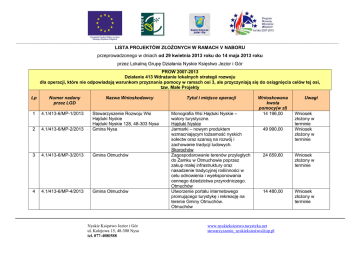 Europejski Fundusz Rolny na rzecz Rozwoju Obszarów Wiejskich ------------------------------------------------------------------------------------------------------------------------------------------------------------------------------------------------------------------------------------------------------------------------------------------------------------------------------------------------------------------------------------------ LISTA PROJEKTÓW ZŁOŻONYCH W RAMACH V NABORU przeprowadzonego w dniach od 29 kwietnia 2013 roku do 14 maja 2013 roku przez Lokalną Grupę Działania Nyskie Księstwo Jezior i Gór PROW 2007-2013 Działanie 413 Wdrażanie lokalnych strategii rozwoju dla operacji, które nie odpowiadają warunkom przyznania pomocy w ramach osi 3, ale przyczyniają się do osiągnięcia celów tej osi, tzw. Małe Projekty Lp Numer nadany przez LGD Nazwa Wnioskodawcy 1 4.1/413-6/MP-1/2013 2 4.1/413-6/MP-2/2013 Stowarzyszenie Rozwoju Wsi Hajduki Nyskie Hajduki Nyskie 128, 48-303 Nysa Gmina Nysa 3 4.1/413-6/MP-3/2013 Gmina Otmuchów 4 4.1/413-6/MP-4/2013 Gmina Otmuchów Nyskie Księstwo Jezior i Gór ul. Kolejowa 15, 48-300 Nysa tel. 077-4080588 Tytuł i miejsce operacji Monografia Wsi Hajduki Nyskie – walory turystyczne. Hajduki Nyskie Jarmarki – nowym produktem wzmacniającym tożsamość nyskich sołectw oraz szansą na rozwój i zachowanie tradycji ludowych. Skorochów Zagospodarowanie terenów przyległych do Zamku w Otmuchowie poprzez zakup małej infrastruktury oraz nasadzenie tradycyjnej roślinności w celu odnowienia i wyeksponowania cennego dziedzictwa przyrodniczego. Otmuchów Utworzenie portalu internetowego promującego turystykę i rekreację na terenie Gminy Otmuchów. Otmuchów Wnioskowana kwota pomocy(w zł) 14 196,00 49 990,00 Uwagi Wniosek złożony w terminie Wniosek złożony w terminie 24 659,60 Wniosek złożony w terminie 14 480,00 Wniosek złożony w terminie www.nyskieksiestwo.turystyka.net [email protected] Europejski Fundusz Rolny na rzecz Rozwoju Obszarów Wiejskich ------------------------------------------------------------------------------------------------------------------------------------------------------------------------------------------------------------------------------------------------------------------------------------------------------------------------------------------------------------------------------------------ 5 4.1/413-6/MP-5/2013 Ochotnicza Straż Pożarna w Kępnicy 6 4.1/413-6/MP-6/2013 Stowarzyszenie na Rzecz Rozwoju Wsi Niwnica 7 4.1/413-6/MP-7/2013 Parafia Rzymskokatolicka p.w. Św. Jana Apostoła i Ewangelisty w Paczkowie 8 4.1/413-6/MP-8/2013 Stowarzyszenie Przyjaciół Szkoły w Biskupowie 9 4.1/413-6/MP-9/2013 Skowrońska Małgorzata 10 4.1/413-6/MP-10/2013 Gmina Głuchołazy 11 4.1/413-6/MP-11/2013 Centrum Kultury w Głuchołazach 12 4.1/413-6/MP-12/2013 Stowarzyszenie „Razem dla Niwnicy” 13 4.1/413-6/MP-13/2013 Dawidowicz Nicole Łucja Nyskie Księstwo Jezior i Gór ul. Kolejowa 15, 48-300 Nysa tel. 077-4080588 Wykonanie i montaż siedzisk na boisku sportowym w Kępnicy. Kępnica Siłownia pod chmurką w Niwnicy. Niwnica 30 252,82 Odnowienie i restauracja ołtarza Maltizów z kościoła p.w. Św. Jana Apostoła i Ewangelisty w Paczkowie Paczków Ścieżką rekreacji, przyrody i historii – przystanek Biskupów. Biskupów Warsztaty instruktora rekreacji ruchowej ze specjalnością jazda konna. Jarnołtówek Odnowienie i konserwacja tarczy zabytkowej wieży zegarowej w Głuchołazach Głuchołazy Kulturalne i turystyczne skarby Nyskiego Księstwa Jezior i Gór. Głuchołazy „Święto Miodu Niwnica 2014” Niwnica 50 000,00 Modernizacja i zagospodarowanie terenu przy gospodarstwie agroturystycznym poprzez utworzenie przestrzeni turystyczno-rekreacyjnej w celu uatrakcyjnienia gospodarstwa agroturystycznego. 24 951,52 40 023,36 19 600,00 25 000,00 50 000,00 36 098,08 25 264,00 www.nyskieksiestwo.turystyka.net [email protected] Wniosek złożony w terminie Wniosek złożony w terminie Wniosek złożony w terminie Wniosek złożony w terminie Wniosek złożony w terminie Wniosek złożony w terminie Wniosek złożony w terminie Wniosek złożony w terminie Wniosek złożony w terminie Europejski Fundusz Rolny na rzecz Rozwoju Obszarów Wiejskich ------------------------------------------------------------------------------------------------------------------------------------------------------------------------------------------------------------------------------------------------------------------------------------------------------------------------------------------------------------------------------------------ 14 4.1/413-6/MP-14/2013 Dawidowicz Nicole Łucja 15 4.1/413-6/MP-15/2013 Stowarzyszenie Na Rzecz Rozwoju Wsi Goświnowice 16 4.1/413-6/MP-16/2013 Witkowska Alicja Bronisława 17 4.1/413-6/MP-17/2013 Ośrodek Kultury i Rekreacji 18 4.1/413-6/MP-18/2013 Ośrodek Kultury i Rekreacji 19 4.1/413-6/MP-19/2013 Erm Dorota Łucja Dziewiętlice Modernizacja części pomieszczeń istniejącego budynku mieszkalnego z przeznaczeniem na cele agroturystyczne. Dziewiętlice Zagospodarowanie przestrzeni publicznej w Goświnowicach na plac rekreacji i wypoczynku. Goświnowice Modernizacja budynku gospodarczego na warsztat garncarski. Gierałcice Kultywowanie Tradycji Muzycznych poprzez Reaktywację Paczkowskiej Orkiestry Dętej – zakup instrumentów, akcesoriów muzycznych i strojów galowych. Paczków Przystosowanie pomieszczeń Ośrodka Kultury w Paczkowie do prowadzenia działalności szkoleniowej, edukacyjnej i kulturalnej. Paczków Zakup oraz montaż ekospa w gospodarstwie agroturystycznym Pałac Heymana w Ściborzu. Ścibórz SUMA 24 945,12 Wniosek złożony w terminie 48 629,33 Wniosek złożony w terminie 50 000,00 Wniosek złożony w terminie Wniosek złożony w terminie 18 641,60 28 101,60 Wniosek złożony w terminie 47 960,16 Wniosek złożony w terminie 622 793,19 Limit dostępnych środków