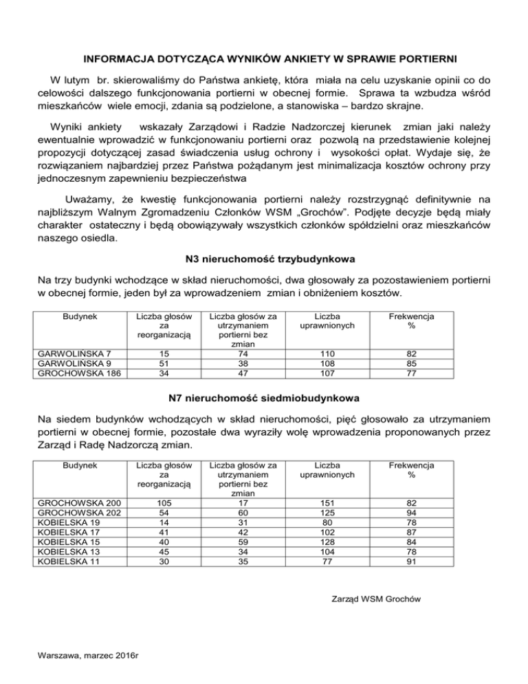 INFORMACJA DOTYCZĄCA WYNIKÓW ANKIETY W SPRAWIE PORTIERNI W lutym br. skierowaliśmy do Państwa ankietę, która miała na celu uzyskanie opinii co do celowości dalszego funkcjonowania portierni w obecnej formie. Sprawa ta wzbudza wśród mieszkańców wiele emocji, zdania są podzielone, a stanowiska – bardzo skrajne. Wyniki ankiety wskazały Zarządowi i Radzie Nadzorczej kierunek zmian jaki należy ewentualnie wprowadzić w funkcjonowaniu portierni oraz pozwolą na przedstawienie kolejnej propozycji dotyczącej zasad świadczenia usług ochrony i wysokości opłat. Wydaje się, że rozwiązaniem najbardziej przez Państwa pożądanym jest minimalizacja kosztów ochrony przy jednoczesnym zapewnieniu bezpieczeństwa Uważamy, że kwestię funkcjonowania portierni należy rozstrzygnąć definitywnie na najbliższym Walnym Zgromadzeniu Członków WSM „Grochów”. Podjęte decyzje będą miały charakter ostateczny i będą obowiązywały wszystkich członków spółdzielni oraz mieszkańców naszego osiedla. N3 nieruchomość trzybudynkowa Na trzy budynki wchodzące w skład nieruchomości, dwa głosowały za pozostawieniem portierni w obecnej formie, jeden był za wprowadzeniem zmian i obniżeniem kosztów. Budynek Liczba głosów za reorganizacją GARWOLIŃSKA 7 GARWOLIŃSKA 9 GROCHOWSKA 186 15 51 34 Liczba głosów za utrzymaniem portierni bez zmian 74 38 47 Liczba uprawnionych Frekwencja % 110 108 107 82 85 77 N7 nieruchomość siedmiobudynkowa Na siedem budynków wchodzących w skład nieruchomości, pięć głosowało za utrzymaniem portierni w obecnej formie, pozostałe dwa wyraziły wolę wprowadzenia proponowanych przez Zarząd i Radę Nadzorczą zmian. Budynek Liczba głosów za reorganizacją GROCHOWSKA 200 GROCHOWSKA 202 KOBIELSKA 19 KOBIELSKA 17 KOBIELSKA 15 KOBIELSKA 13 KOBIELSKA 11 105 54 14 41 40 45 30 Liczba głosów za utrzymaniem portierni bez zmian 17 60 31 42 59 34 35 Liczba uprawnionych Frekwencja % 151 125 80 102 128 104 77 82 94 78 87 84 78 91 Zarząd WSM Grochów Warszawa, marzec 2016r