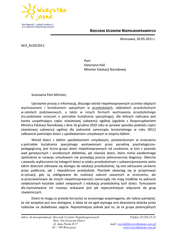 RZECZNIK UCZNIÓW NIEPEŁNOSPRAWNYCH Warszawa, 20.05.2011 r. WJ2_Rz20/2011 Pani Katarzyna Hall Minister Edukacji Narodowej Szanowna Pani Minister, Uprzejmie proszę o informację, dlaczego wśród niepełnosprawnych uczniów objętych wychowaniem i kształceniem specjalnym w przedszkolach, oddziałach przedszkolnych w szkołach podstawowych, a także w innych formach wychowania przedszkolnego (na podstawie orzeczeń o potrzebie kształcenia specjalnego), dla których naliczana jest kwota uzupełniająca części oświatowej subwencji ogólnej (zgodnie z Rozporządzeniem Ministra Edukacji Narodowej z dnia 16 grudnia 2010 roku w sprawie sposobu podziału części oświatowej subwencji ogólnej dla jednostek samorządu terytorialnego w roku 2011) całkowicie pominięto dzieci z upośledzeniem umysłowym w stopniu lekkim. Wśród dzieci z lekkim upośledzeniem umysłowym, potwierdzonym w orzeczeniu o potrzebie kształcenia specjalnego wystawionym przez poradnię psychologiczno‐ pedagogiczną, jest liczna grupa dzieci niepełnosprawnych od urodzenia, w tym z powodu wad genetycznych i wrodzonych defektów, jak również dzieci, które mimo ewidentnego opóźnienia w rozwoju umysłowym nie posiadają jeszcze jednoznacznej diagnozy. Obecnie z powodu wykluczenia tej kategorii dzieci w wieku przedszkolnym z subwencjonowania wielu takim dzieciom odmawia się dostępu do edukacji przedszkolnej. Są one odrzucane zarówno przez publiczne, jak i niepubliczne przedszkola. Placówki obawiają się je przyjmować w sytuacji, gdy są zobligowane do realizacji zaleceń zawartych w orzeczeniu, ale w przeciwieństwie do innych niepełnosprawności samorządy nie mają środków na pokrycie zwiększonych kosztów zadań związanych z edukacją przedszkolną tych dzieci. Tymczasem dla stymulowania ich rozwoju wskazane jest jak najwcześniejsze włączanie do grup rówieśniczych. Dzieci te mogą co prawda korzystać ze wczesnego wspomagania, ale należy pamiętać, że nie wszędzie jest ono dostępne, a także że na ogół wymaga ono dowożenia dziecka przez rodziców na dodatkowe zajęcia. Najistotniejsze jednak jest to, że ta grupa potencjalnych Adres do korespondencji: Rzecznik Uczniów Niepełnosprawnych Stow. Nie-Grzeczne Dzieci Al. Jana Pawła II 27 02 – 790 Warszawa Telefon:22/226-23-51 mail: [email protected] www.wszystkojasne.waw.pl RZECZNIK UCZNIÓW NIEPEŁNOSPRAWNYCH przedszkolaków ma ze względu na brak naliczania kwoty uzupełniającej części oświatowej subwencji jeszcze trudniejszy dostęp do przedszkola niż ich rówieśnicy z innymi rodzajami niepełnosprawności. O ile proces wychowania i kształcenia dzieci z lekkim upośledzeniem przez publiczne i niepubliczne przedszkola nie będzie subwencjonowany na tych samych zasadach, co edukacja przedszkolna dzieci z innymi niepełnosprawnościami, to początkowo zdiagnozowany lekki stopień upośledzenia w wieku przedszkolnym może ulec pogłębieniu, często nieodwracalnie pogarszając szanse życiowe tych osób, a przez to powodując znaczne skutki finansowe dla systemu w późniejszej edukacji i w pomocy społecznej. Oczekując uzasadnienia pominięcia tych dzieci w obowiązującym obecnie rozporządzeniu subwencyjnym, liczę jednocześnie, że zasady naliczania części oświatowej subwencji ogólnej na rok 2012 zostaną zmienione w kierunku korzystnym dla lekko upośledzonych maluchów. Z poważaniem, dr Agnieszka Dudzińska Rzecznik uczniów niepełnosprawnych Do wiadomości: 1. 2. 3. Zarząd Główny Polskiego Stowarzyszenia na Rzecz Osób z Upośledzeniem Umysłowym, ul. Głogowa 2B, 02‐639 Warszawa Stowarzyszenie Rodzin i Opiekunów Osób z Zespołem Downa „Bardziej Kochani”, ul. Conrada 13, 01‐922Warszawa Stowarzyszenie Rodzin Osób z Zespołem Downa „Ukryty Skarb", ul. Poturzyńska 1, 20‐853 Lublin Adres do korespondencji: Rzecznik Uczniów Niepełnosprawnych Stow. Nie-Grzeczne Dzieci Al. Jana Pawła II 27 02 – 790 Warszawa Telefon:22/226-23-51 mail: [email protected] www.wszystkojasne.waw.pl