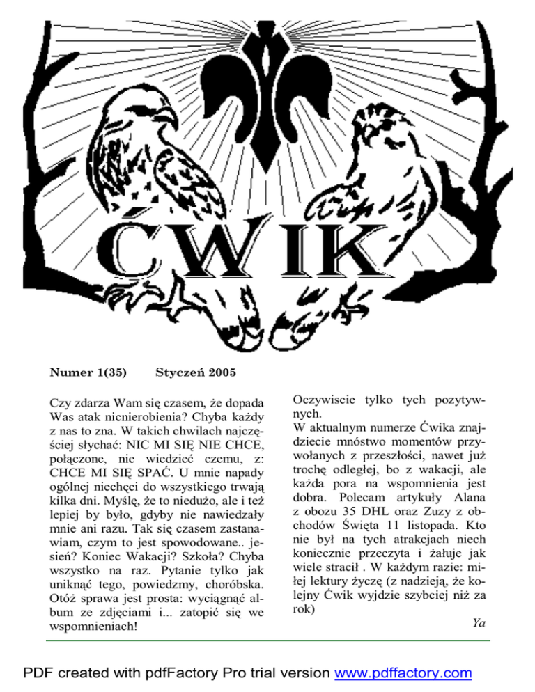 Numer 1(35) Styczeń 2005 Czy zdarza Wam się czasem, że dopada Was atak nicnierobienia? Chyba każdy z nas to zna. W takich chwilach najczęściej słychać: NIC MI SIĘ NIE CHCE, połączone, nie wiedzieć czemu, z: CHCE MI SIĘ SPAĆ. U mnie napady ogólnej niechęci do wszystkiego trwają kilka dni. Myślę, że to niedużo, ale i też lepiej by było, gdyby nie nawiedzały mnie ani razu. Tak się czasem zastanawiam, czym to jest spowodowane.. jesień? Koniec Wakacji? Szkoła? Chyba wszystko na raz. Pytanie tylko jak uniknąć tego, powiedzmy, choróbska. Otóż sprawa jest prosta: wyciągnąć album ze zdjęciami i... zatopić się we wspomnieniach! Oczywiscie tylko tych pozytywnych. W aktualnym numerze Ćwika znajdziecie mnóstwo momentów przywołanych z przeszłości, nawet już trochę odległej, bo z wakacji, ale każda pora na wspomnienia jest dobra. Polecam artykuły Alana z obozu 35 DHL oraz Zuzy z obchodów Święta 11 listopada. Kto nie był na tych atrakcjach niech koniecznie przeczyta i żałuje jak wiele stracił . W każdym razie: miłej lektury życzę (z nadzieją, że kolejny Ćwik wyjdzie szybciej niż za rok) Ya PDF created with pdfFactory Pro trial version www.pdffactory.com Numer 1(35) Str. 2 "35 the best" Na obozie w Nowym Zatomiu miałem zadanie dowiedzieć się o różnych zwyczajach, obrzędach drużyn na obozie. Przystąpiłem więc do działania i tu psikus... Mało która drużyna miała jakieś obrzędy nawet jak miała to takie które raczej nie można zaliczyć do obrzędów a zwyczajów np. piosenka na koniec zbiórki. Chustę kupowało się wraz z mundurem (co to za przyjemność). Krzyż dostawało się na ostatnim ognisku po (biednym) biegu patrolowym. Jedynym i ciekawym moim zdaniem obrzędem była rada ognia podczas której każdy mógł coś powiedzieć, przeprosić, podziękować... W porównaniu z naszą drużyną wszystkie te drużyny razem wzięte nie miały tyle obrzędów co 35. Stwierdziłem więc jednoznacznie i bez apelacyjnie iż 35 drużyna harcerzy leśnych (pamiętajmy o tym iż jesteśmy harcerzami leśnymi a nie obleśnymi) była, jest i będzie najlepsza dopóki są w niej tacy ludzie jak my którzy do czegoś dążą. Mamy wiele ciekawych i niepowtarzalnych obrzędów nie zapomnijmy o nich... MaZuRo71 Harce... ...to rodzaj pojedynków, czyli utarczek rycerzy przed bitwą, które w powszechnym były zwyczaju, a historia prawie każdej walnej bitwy wspomina o poprzednim mocowaniu się rycerzy na rękę. I tak w roku 1410 pod Koronowem, przed zaczęciem bitwy, Ślązak Konrad Niemiec wyjechał na harc z szyków krzyżackich, okuty wraz z koniem w bogatą zbroję i harcując wyzywał po niemiecku, a potem po polsku wojowników naszych. Wtedy z szyków rycerstwa polskiego wyskoczył ku niemu z kopią Scycicki, a złożywszy się drzewcem zwalił z konia zuchwałego Ślązaka i pojmał go żywcem. PDF created with pdfFactory Pro trial version www.pdffactory.com Str. 3 ĆWIK Mężny Jan Tarnowski w bitwie walnej pod Orszą w pełnej zbroi wyjechał na harc, wyzywając nieprzyjaciół do walki sam na sam. Stanisław Studnicki zwany Diabłem, pan na Łańcucie, za Stefana Batorego, pod Gdańskiem, gdy Niemców na harc wywabił, każdego prawie, który wystąpić się odważył ubił, po czym mu żaden czoła stawić nie śmiał. Za to kasztelan Kacper Lipski w harcu pod Cecorą, zdjąwszy jednego Turka z konia, przed hetmana Żółkiewskiego przyniósł. Wyjeżdżać na harc można było tylko za pozwoleniem lub rozkazem wodza. Polacy mieli w świecie sławę pierwszych harcerzy. Zdarzyło się, że najdzielniejsi z naszych harcerzy, przepasawszy się na ukos nałęczami, przed bitwą rzucali się w kilkadziesiąt koni w środek obozu nieprzyjaciela i sprawiali popłoch w tysiącach. Wśród dworzan wojskowych u polskich królów znajdujemy zastęp rycerzy konnych zwanych harcerzami. Na dworze Zygmunta III w 1510 roku znajdujemy harcerzy 45. Za Stefana Batorego każdy z harcerzy miał dwa wierzchowce, pobierał rocznych zasług złotych ówczesnych 120, a na strawę tygodniowo 1 zł i 20 groszy. Miał też sługę, który dostawał 12 łokci sukna. Przełożonym harcerzy na dworze króla Batorego był Jerzy Kretkowski, a miał on 6 koni i pobierał 400 zł pensji. Wyjeżdżać na harc znaczy popisywać się, chełpić, zabiegać o pierwszeństwo. Monika Knaź na podstawie encyklopedii historycznej PDF created with pdfFactory Pro trial version www.pdffactory.com Numer 1(35) Z H P Str. 4 N I E J E S T Z Ł E Jadąc na ten obóz miałem pozytywne uczucia mieszane z negatywnymi. Ponieważ miejsce było dla mnie bardzo interesujące i ważne ,ale jak byłem wcześniej "edukowany" że ZHP jest złe, że to po prostu syf. Miejsce było super i koniec na ten temat. Dla mnie ważniejszy jest ten drugi więc na jego temat się więcej rozpisze. Chodzi mi o to że ja byłem zawsze nastawiany na ZHP jako coś złego ale teraz wiem że wymyśliła to osoba która nie ma pojęcia o ZHP gdyż po pierwsze są to tacy sami harcerze jak my tyle że należą do innego związku. Mogę też powiedzieć z własnego doświadczenia iż ZHP nie jest złe, no, może nie mają tyle obrzędów co my ale to nie czas aby o tym pisać. Wiem teraz i mówię to z pełną świadomością iż jeżeli ktoś będzie mówił jakie to ZHP jest okropne i w ogóle, ja się z tym nie zgodzę i będę przeczył tej tezie. Motywują mnie chociażby tacy ludzie jak Piszu, Olek, czy dh. Bogdan bo są to osoby mocno w to zaangażowane i konkretne. W ZHR powinniśmy mieć kilka takich osób bo przydałyby nam się one chociażby do ruszenia "watry". Nie chcę tu nic krytykować lecz po prostu uświadomić kilku osobom że ZHP nie jest wcale takie straszne! MaZuRo71 PDF created with pdfFactory Pro trial version www.pdffactory.com Str. 5 ĆWIK „O nas...” Zainspirowana dzisiejszym spotkaniem chętnych do tworzenia „Ćwika” postanowiłam coś napisać... o harcerstwie. O Nas. W h