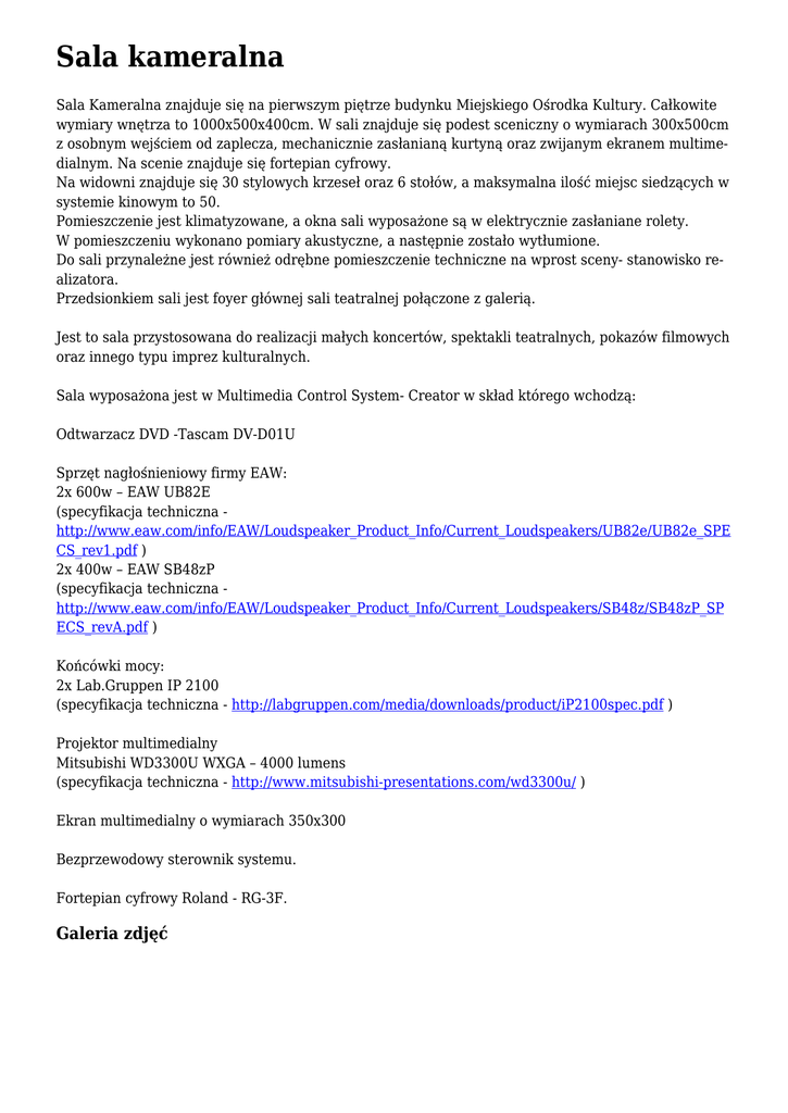 Sala kameralna Sala Kameralna znajduje się na pierwszym piętrze budynku Miejskiego Ośrodka Kultury. Całkowite wymiary wnętrza to 1000x500x400cm. W sali znajduje się podest sceniczny o wymiarach 300x500cm z osobnym wejściem od zaplecza, mechanicznie zasłanianą kurtyną oraz zwijanym ekranem multimedialnym. Na scenie znajduje się fortepian cyfrowy. Na widowni znajduje się 30 stylowych krzeseł oraz 6 stołów, a maksymalna ilość miejsc siedzących w systemie kinowym to 50. Pomieszczenie jest klimatyzowane, a okna sali wyposażone są w elektrycznie zasłaniane rolety. W pomieszczeniu wykonano pomiary akustyczne, a następnie zostało wytłumione. Do sali przynależne jest również odrębne pomieszczenie techniczne na wprost sceny- stanowisko realizatora. Przedsionkiem sali jest foyer głównej sali teatralnej połączone z galerią. Jest to sala przystosowana do realizacji małych koncertów, spektakli teatralnych, pokazów filmowych oraz innego typu imprez kulturalnych. Sala wyposażona jest w Multimedia Control System- Creator w skład którego wchodzą: Odtwarzacz DVD -Tascam DV-D01U Sprzęt nagłośnieniowy firmy EAW: 2x 600w – EAW UB82E (specyfikacja techniczna http://www.eaw.com/info/EAW/Loudspeaker_Product_Info/Current_Loudspeakers/UB82e/UB82e_SPE CS_rev1.pdf ) 2x 400w – EAW SB48zP (specyfikacja techniczna http://www.eaw.com/info/EAW/Loudspeaker_Product_Info/Current_Loudspeakers/SB48z/SB48zP_SP ECS_revA.pdf ) Końcówki mocy: 2x Lab.Gruppen IP 2100 (specyfikacja techniczna - http://labgruppen.com/media/downloads/product/iP2100spec.pdf ) Projektor multimedialny Mitsubishi WD3300U WXGA – 4000 lumens (specyfikacja techniczna - http://www.mitsubishi-presentations.com/wd3300u/ ) Ekran multimedialny o wymiarach 350x300 Bezprzewodowy sterownik systemu. Fortepian cyfrowy Roland - RG-3F. Galeria zdjęć