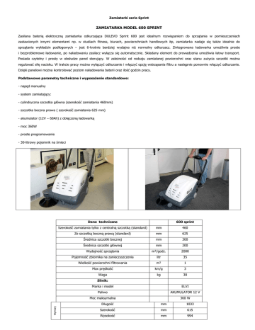 Zamiatarki seria Sprint ZAMIATARKA MODEL 600 SPRINT Zasilana baterią elektryczną zamiatarka odkurzająca DULEVO Sprint 600 jest idealnym rozwiązaniem do sprzątania w pomieszczeniach zastawionych innymi elementami np. w studiach fitness, biurach, powierzchniach handlowych itp, zamiatarka nadaje się także idealnie do sprzątania wykładzin podłogowych – jest 6-krotnie bardziej wydajna niż normalny odkurzacz. Zintegrowana ładowarka umożliwia proste i bezproblemowe ładowanie, po naładowaniu zasilacz wyłącza się automatycznie. Składany element do prowadzenia umożliwia łatwy transport. Posiada czytelny i prosty w obsłudze panel sterujący. W zależności od rodzaju zamiatanej powierzchni oraz stanu zużycia szczotki można regulować siłę nacisku. W trakcie pracy można wyłączyć odkurzanie i włączyć opcję wstrząsania filtru a następnie ponownie włączyć odkurzanie. Dzięki panelowi można kontrolować poziom naładowania baterii oraz ilość godzin pracy. Podstawowe parametry techniczne i wyposażenie standardowe: - napęd manualny - system zamiatający: - cylindryczna szczotka główna (szerokość zamiatania 460mm) - szczotka boczna prawa ( szerokość zamiatania 625 mm) - akumulator (12V – 60Ah) z dołączoną ładowarką - moc 360W - proste programowanie - 30-litrowy pojemnik na śmieci Dane techniczne 600 sprint Szerokość zamiatania tylko z centralną szczotką (standard) mm 460 Ze szczotką boczną prawą (standard) mm 625 Średnica szczotki bocznej mm 300 Średnica szczotki głównej mm 200 Wydajność sprzątania m²/godz. 2000 Pojemność zbiornika na zanieczyszczenia litr 35 Wielkość powierzchni filtrowania m² 1 Max prędkość km/g 3 Waga kg 38 Silnik: Marka i model ELVI Paliwo AKUMULATOR 12 V Wymiary Moc maksymalna 360 W Długość mm 1033 Szerokość mm 615 Wysokość mm 994 Zamiatarki seria Sprint ZAMIATARKA MANUALNA MODEL 700 M SPRINT Zamiatarka manualna DULEVO Sprint 700 M nadaje się optymalnie so codziennego sprzątania powierzchni na zewnątrz i wewnątrz, powierzchni suchych i mokrych. Może być także traktowana, jako uzupełnienie do zamiatania po większych maszynach sprzątających. Jest łatwa do prowadzenia i do transportu (składany element prowadzący). Podstawowe parametry techniczne i wyposażenie standardowe: - napęd manualny - system zamiatający: - cylindryczna szczotka główna (szerokość zamiatania 500 mm) - szczotka boczna prawa (szerokość zamiatania 670 mm) - możliwość dostosowania nacisku szczotki głównej - 30-litrowy zbiornik na śmieci Dane techniczne 700 M Szerokość zamiatania tylko ze szczotką główną (standard) mm 500 Z boczną szczotką prawą mm 670 Średnica szczotki bocznej mm 320 Średnica szczotki głównej mm 240 Wydajność sprzątania m²/godz. 2000 Pojemność zbiornika na zanieczyszczenia litr 30 Wielkość powierzchni filtrowania m² Maksymalna prędkość km/h 3 Waga kg 25 Silnik: Marka i model Cylindry Paliwo Moc maksymalna Wymiary System chłodzenia Długość mm 1200 Szerokość mm 780 Wysokość mm 960 Zamiatarki seria Sprint ZAMIATARKA MODEL 700 SPRINT Prowadzona zamiatarka przemysłowa Dulevo model 700 Sprint jest przeznaczona do sprzątania powierzchni małych i średnich, na zewnątrz i na wewnątrz. Jest profesjonalnym i ekonomicznym rozwiązaniem do czyszczenia zróżnicowanych powierzchni, nawet wykładzin. Nadaje się przede wszystkim do powierzchni z wieloma narożnikami i wypustami. Dostępna jest w wersji spalinowej i elektrycznej. Obie wersje umożliwiają mechaniczką jazdę do przodu. Oczywiście wersja na baterię jest cichsza.. Właściwości zaskoczą pozytywnie każdego użytkownika; napęd przez tylne koła, przednie kółko prowadzące i wspierające, mocna obudowa z tworzywa sztucznego. Solidny uchwyt prowadzący pozwala umożliwia łatwą obsługę i pozwala obserwować sprzątaną powierzchnię. Łatwo zbiera kurz i inne świeci, który zbiera do wyjmowanego zbiornika o pojemności 40 litrów. System filtracji zapewnia utrzymanie kurzu w środku dzięki mechanicznej opcji otrząsania filtra. Operator może włączyć/ wyłączyć system odkurzający w zależności od rodzaju sprzątanej powierzchni i potrzeb. Podstawowe parametry techniczne i wyposażenie standardowe: - napęd mechaniczny do przodu - system zamiatający: - cylindryczna szczotka główna (szer. zamiatania 520 mm) - szczotka boczna prawa (szerokość zamiatania 700 mm) - system odkurzający: - turbina ssąca - panelowy filtr papierowy - mechaniczny otrząsacz filtra - automatyczny wyłącznik odkurzacza - drążek sterowania wyposażony w deskę rozdzielczą z kluczykiem zapłonu, dźwignię napędu i dźwignię szczotki bocznej - 40-litrowy zbiornik na śmieci STANDARDOWE SZCZOTKI DLA MODELI 700 M – 700 EH – 700 SH - Polipropylenowa szczotka główna, polipropylenowa szczotka boczna Szerokość zamiatania tylko ze szczotką główną (standard) Mm 700 EH 700 SH 520 520 Z boczną szczotką prawą Mm 700 700 Średnica szczotki bocznej Mm 380 380 Średnica szczotki głównej Mm 240 240 Wydajność sprzątania m²/godz. 3500 3500 Pojemność zbiornika na zanieczyszczenia Litr 40 40 Wielkość powierzchni filtrowania m² 1,5 1,5 Maksymalna prędkość km/h 5 5 Waga Kg 68 73 ELVI HONDA G 1000 Silnik: Marka i model Cylindry 1 Paliwo AKUMULATOR 12 V Moc maksymalna 360 W Wymiary System chłodzenia BENZYNA 1,8 kW POWIETRZE Długość Mm 1160 1160 Szerokość Mm 810 810 Wysokość Mm 1000 1000 Zamiatarki seria Sprint ZAMIATARKA MODEL 900 SPRINT DULEVO Sprint 900 jest zamiatarką przemysłową, która spełnia wysokie wymagania. jest przeznaczona do sprzątania powierzchni małych i średnich, na zewnątrz i na wewnątrz. Jest profesjonalnym i ekonomicznym rozwiązaniem do czyszczenia zróżnicowanych powierzchni, nawet wykładzin. Nadaje się przede wszystkim do powierzchni z wieloma narożnikami i wypustami. Dostępna jest w wersji spalinowej i elektrycznej. Obie wersje umożliwiają mechaniczką