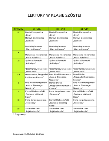 LEKTURY W KLASIE SZÓSTEJ TERMIN IX KL.VIA KL. VIB KL.VIC Maria Konopnicka Maria Konopnicka Maria Konopnicka „Dym” „Dym” „Dym” Henryk Sienkiewicz Henryk Sienkiewicz Henryk Sienkiewicz „Sachem” „Sachem” „Sachem” Maria Dąbrowska Maria Dąbrowska Maria Dąbrowska „Marcin Kozera” „Marcin Kozera” „Marcin Kozera” Małgorzata Musierowicz Małgorzata Musierowicz Małgorzata Musierowicz „Kwiat kalafiora” „Kwiat kalafiora” „Kwiat kalafiora” *Juliusz Słowacki *Juliusz Słowacki *Juliusz Słowacki „Balladyna” „Balladyna” „Balladyna” *Józef Ignacy Kraszewski *Józef Ignacy Kraszewski *Józef Ignacy Kraszewski „Stara Baśń” „Stara Baśń” X XI XII Daniel Defoe „Przypadki Lucy Maud Montgomery II „Przypadki Robinsona Wzgórza” Kruzoe” Lucy Maud Montgomery Daniel Defoe Lucy Maud Montgomery „Ania z Zielonego „Przypadki Robinsona „Ania z Zielonego Wzgórza” Kruzoe” Wzgórza” Kornel Makuszyński Irena Jurgielewiczowa Kornel Makuszyński „Szatan z siódmej „Ten obcy” „Szatan z siódmej klasy” klasy” III Daniel Defoe „Ania z Zielonego Robinsona Kruzoe” I „Stara Baśń” Irena Jurgielewiczowa Kornel Makuszyński Irena Jurgielewiczowa „Ten obcy” „Szatan z siódmej „Ten obcy” klasy” IV *Stanisław Lem *Stanisław Lem *Stanisław Lem „Bajki robotów” „Bajki robotów” „Bajki robotów” * fragmenty Opracowała: M. Michalak-Zielińska