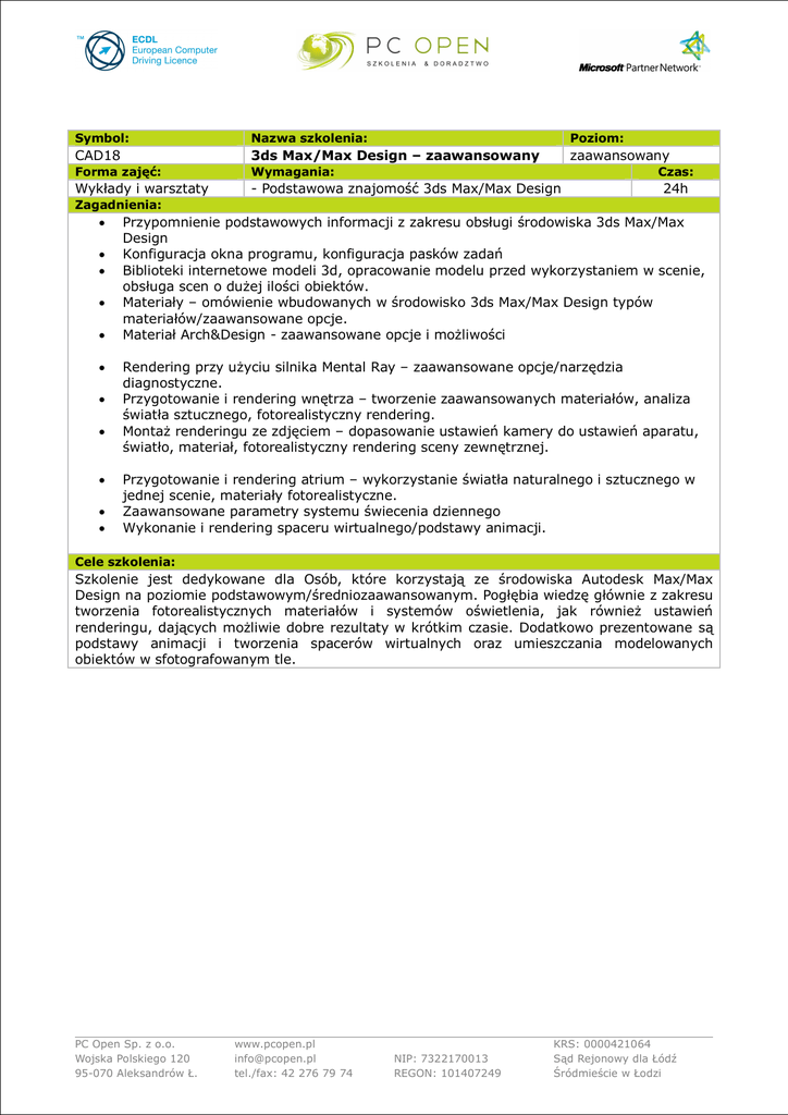 Symbol: Nazwa szkolenia: Poziom: CAD18 3ds Max/Max Design – zaawansowany zaawansowany Forma zajęć: Wymagania: Wykłady i warsztaty - Podstawowa znajomość 3ds Max/Max Design Czas: 24h Zagadnienia: Przypomnienie podstawowych informacji z zakresu obsługi środowiska 3ds Max/Max Design Konfiguracja okna programu, konfiguracja pasków zadań Biblioteki internetowe modeli 3d, opracowanie modelu przed wykorzystaniem w scenie, obsługa scen o dużej ilości obiektów. Materiały – omówienie wbudowanych w środowisko 3ds Max/Max Design typów materiałów/zaawansowane opcje. Materiał Arch&Design - zaawansowane opcje i możliwości Rendering przy użyciu silnika Mental Ray – zaawansowane opcje/narzędzia diagnostyczne. Przygotowanie i rendering wnętrza – tworzenie zaawansowanych materiałów, analiza światła sztucznego, fotorealistyczny rendering. Montaż renderingu ze zdjęciem – dopasowanie ustawień kamery do ustawień aparatu, światło, materiał, fotorealistyczny rendering sceny zewnętrznej. Przygotowanie i rendering atrium – wykorzystanie światła naturalnego i sztucznego w jednej scenie, materiały fotorealistyczne. Zaawansowane parametry systemu świecenia dziennego Wykonanie i rendering spaceru wirtualnego/podstawy animacji. Cele szkolenia: Szkolenie jest dedykowane dla Osób, które korzystają ze środowiska Autodesk Max/Max Design na poziomie podstawowym/średniozaawansowanym. Pogłębia wiedzę głównie z zakresu tworzenia fotorealistycznych materiałów i systemów oświetlenia, jak również ustawień renderingu, dających możliwie dobre rezultaty w krótkim czasie. Dodatkowo prezentowane są podstawy animacji i tworzenia spacerów wirtualnych oraz umieszczania modelowanych obiektów w sfotografowanym tle. PC Open Sp. z o.o. Wojska Polskiego 120 95-070 Aleksandrów Ł. www.pcopen.pl [email protected] tel./fax: 42 276 79 74 NIP: 7322170013 REGON: 101407249 KRS: 0000421064 Sąd Rejonowy dla Łódź Śródmieście w Łodzi