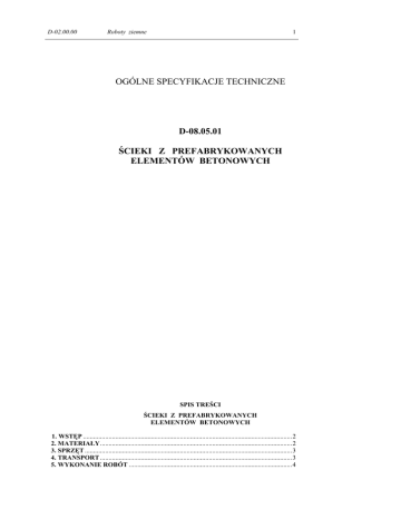 D-02.00.00 Roboty ziemne 1 OGÓLNE SPECYFIKACJE TECHNICZNE D-08.05.01 ŚCIEKI Z PREFABRYKOWANYCH ELEMENTÓW BETONOWYCH SPIS TREŚCI ŚCIEKI Z PREFABRYKOWANYCH ELEMENTÓW BETONOWYCH 1. WSTĘP ........................................................................................................................... 2 2. MATERIAŁY ................................................................................................................. 2 3. SPRZĘT .......................................................................................................................... 3 4. TRANSPORT ................................................................................................................. 3 5. WYKONANIE ROBÓT ................................................................................................ 4 D-02.00.00 Roboty ziemne 2 6. KONTROLA JAKOŚCI ROBÓT ................................................................................ 4 7. OBMIAR ROBÓT ......................................................................................................... 6 8. ODBIÓR ROBÓT .......................................................................................................... 6 9. PODSTAWA PŁATNOŚCI .......................................................................................... 6 10. PRZEPISY ZWIĄZANE ............................................................................................... 6 1. WSTĘP 1.1. Przedmiot OST Przedmiotem niniejszej ogólnej specyfikacji technicznej (OST) są wymagania dotyczące wykonania i odbioru robót związanych z wykonaniem ścieków z prefabrykowanych elementów betonowych. 1.2. Zakres stosowania OST Ogólna specyfikacja techniczna (OST) stanowi obowiązującą podstawę opracowania szczegółowej specyfikacji technicznej (SST) stosowanej jako dokument przetargowy i kontraktowy przy zlecaniu i realizacji robót na drogach krajowych i wojewódzkich. Zaleca się wykorzystanie OST przy zlecaniu robót na drogach miejskich i gminnych. 1.3. Zakres robót objętych OST Ustalenia zawarte w niniejszej specyfikacji dotyczą zasad prowadzenia robót związanych z wykonaniem: − ścieków ulicznych przykrawężnikowych, − ścieków ulicznych międzyjezdniowych, − ścieków terenowych. 1.4. Określenia podstawowe 1.4.1. Ściek przykrawężnikowy - element konstrukcji jezdni służący do odprowadzenia wód opadowych z nawierzchni jezdni i chodników do projektowanych odbiorników (np. kanalizacji deszczowej). 1.4.2. Ściek międzyjezdniowy - element konstrukcji jezdni służący do odprowadzenia wód opadowych z nawierzchni, na których zastosowano przeciwne spadki poprzeczne, np. w rejonie zatok, placów itp. 1.4.3. Ściek terenowy - element zlokalizowany poza jezdnią lub chodnikiem służący do odprowadzenia wód opadowych z nawierzchni jezdni, chodników oraz przyległego terenu do odbiorników sztucznych lub naturalnych. 1.4.4. Pozostałe określenia podstawowe są zgodne z obowiązującymi, odpowiednimi polskimi normami i z definicjami podanymi w OST D-M-00.00.00 „Wymagania ogólne” pkt 1.4. 1.5. Ogólne wymagania dotyczące robót Ogólne wymagania dotyczące robót podano w OST D-M-00.00.00 „Wymagania ogólne” pkt 1.5. 2. MATERIAŁY 2.1. Ogólne wymagania dotyczące materiałów Ogólne wymagania dotyczące materiałów, ich pozyskiwania i składowania, podano w OST D-M00.00.00 „Wymagania ogólne” pkt 2. 2.2. Krawężniki Krawężniki powinny odpowiadać wymaganiom BN-80/6775-03/01 [9] 03/04 [10]. i BN-80/6775- 2.3. Beton na ławę Beton na ławę pod krawężnik i ściek powinien odpowiadać wymaganiom PN-B-06250 [2]. Jeżeli dokumentacja projektowa nie stanowi inaczej, powinien to być beton klasy B-15 lub B-10. D-02.00.00 Roboty ziemne 3 2.4. Kruszywo do betonu Kruszywo do betonu powinno odpowiadać wymaganiom PN-B-06712 [4]. Kruszywo należy przechowywać w warunkach zabezpieczających je przed zanieczyszczeniem, zmieszaniem z kruszywami innych asortymentów, gatunków i marek. 2.5. Cement Cement do betonu powinien być cementem portlandzkim, odpowiadającym wymaganiom PN-B-19701 [5]. Cement do zaprawy cementowej i na podsypkę cementowo-piaskową powinien być klasy 32,5. Przechowywanie cementu powinno być zgodne z BN-88/6731-08 [7]. 2.6. Woda Woda powinna być „odmiany 1” i odpowiadać wymaganiom PN-B-32250 [6]. 2.7. Piasek Piasek na podsypkę cementowo-piaskową powinien odpowiadać wymaganiom PN-B-06712 [4]. Piasek do zaprawy cementowo-piaskowej powinien odpowiadać wymaganiom PN-B-06711 [3]. 2.8. Prefabrykowane elementy betonowe ścieku Prefabrykowane elementy betonowe stosowane do wykonania ścieków przykrawężnikowych, międzyjezdniowych lub terenowych, powinny odpowiadać wymaganiom BN-80/6775-03/01 [9]. Kształt i wymiary prefabrykowanych elementów betonowych, użytych do wykonania ścieków, powinny być zgodne z dokumentacją projektową. Mogą to być np. prefabrykaty betonowe o wymiarach i kształtach wg „Katalogu szczegółów drogowych ulic, placów i parków miejskich - Karty 2.5, 2.9, 2.13 [12]. Do wykonania prefabrykatów należy stosować beton wg PN-B-06250 [2], klasy co najmniej 25. Nasiąkliwość prefabrykatów nie powinna przekraczać 4%. Ścieralność na tarczy Boehmego nie powinna przekraczać 3,5 mm. Wytrzymałość betonu na ściskanie powinna być zgodna z PN-B-06250 [2] dla przyjętej klasy betonu. Powierzchnia prefabrykatów powinna być bez rys, pęknięć i ubytków betonu, o fakturze zatartej. Krawędzie elementów powinny być równe i proste. Wklęsłość lub wypukłość powierzchni elementów nie powinna przekraczać 3 mm. Dopuszczalne odchyłki wymiarów prefabrykatów: − na długości ± 10 mm, − na wysokości i szerokości ± 3 mm. Prefabrykaty betonowe powinny być składowane w pozycji wbudowania, na podłożu utwardzonym i dobrze odwodnionym. 2.9. Masa zalewowa Masa zalewowa do wypełnienia spoin powinna być stosowana na gorąco i o