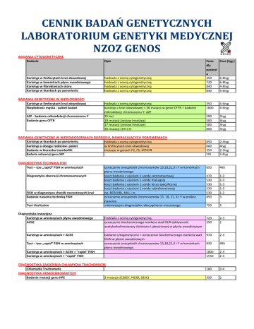 CENNIK BADAŃ GENETYCZNYCH LABORATORIUM GENETYKI MEDYCZNEJ NZOZ GENOS BADANIA CYTOGENETYCZNE Badanie Opis Cena dla pacjent a 350 720 840 840 Czas (tyg.) Kariotyp w limfocytach krwi obwodowej Kariotyp w komórkach płynu owodniowego Kariotyp w fibroblastach skóry Kariotyp w tkankach po poronieniu hodowla z oceną cytogenetyczną hodowla z oceną cytogenetyczną hodowla z oceną cytogenetyczną hodowla z oceną cytogenetyczną 350 1800 4-6tyg 4-6tyg 500 500 500 800 3tyg 3tyg 3tyg 3tyg 850 600 350 2-4tyg 4tyg 2-3tyg 195 3-4tyg oznaczenie aneuploidii chromosomów 13,18,21,X i Y w komórkach płynu owodniowego koszt badania z użyciem 1 sondy centromerowej koszt badania z użyciem 1 sondy malującej koszt badania z użyciem 1 sondy locus specyficznej koszt badania z użyciem 1 sondy subtelomerowej np. BCR/ABL, MLL i in. oznaczenie aneuploidii chromosomów 13, 18, 21, X i Y w próbce nasienia nieinwazyjna diagnostyka raka pęcherza moczowego 850 48h 470 530 530 530 530 850 1-3 1-3 1-3 1-3 1-2 3 750 2 hodowla z oceną cytogenetyczną oznaczenie biochemicznego markera wad OUN (aktywność acetylocholinesterazy ilościowo i jakościowo) w płynie owodniowym 720 250 2-3 1 badanie cytogenetyczne + oznaczenie biochemicznego markera wad OUN w płynie owodniowym oznaczenie aneuploidii chromosomów 13,18,21,X i Y w komórkach płynu owodniowego 970 2-3 830 48h 1800 1550 2-3 2-3 180 3-4 350 2 6-8tyg 6-8tyg 4-8tyg 4-6tyg BADANIA GENETYCZNE W NIEPŁODNOŚCI Kariotyp w limfocytach krwi obwodowej Niepłodnośc męska - pakiet badań AZF - badanie mikrodelecji chromosomu Y Badanie genu CFTR hodowla z oceną cytogenetyczną kariotyp z krwi obwodowej + 36 mutacji w genie CFTR + badanie mikrodelecji chromosomu Y: AZF 25 loci 19 mutacji (zestaw InnoLipa) 17 mutacji (zestaw InnoLipa) 36 mutacji (19+17) BADANIA GENETYCZNE W NIEPOWODZENIACH ROZRODU, NAWRACAJĄCYCH PORONIENIACH Kariotyp w tkankach po poronieniu Kariotyp u obojga rodziców- pakiet Badanie w kierunku trombofilii hodowla z oceną cytogenetyczną w limfocytach krwi obwodowej mutacje w genach F2, F5, MTHFR Badanie sekwencji genu SRY DIAGNOSTYKA TECHNIKĄ FISH Test – tzw „rapid” FISH w amniocytach Diagnostyka aberracji chromosomowych FISH w diagnostyce chorób rozrostowych krwi Badanie nasienia techniką FISH Test UroVysion Diagnostyka inwazyjna Kariotyp w amniocytach płynu owodniowego AChE Kariotyp w amniocytach + AChE Test – tzw „rapid” FISH w amniocytach Kariotyp w amniocytach + AChE + "rapid" FISH Kariotyp w amniocytach + "rapid" FISH DIAGNOSTYKA ZAKAŻENIA CHLAMYDIA TRACHOMATIS Chlamydia Trachomatis DIAGNOSTYKA HEMOCHROMATOZY Badanie mutacji genu HFE 3 mutacje (C282Y, H63D, S65C) DIAGNOSTYKA MUKOWISCYDOZY Badanie genu CFTR 19 mutacji (zestaw InnoLipa) 17 mutacji (zestaw InnoLipa) 36 mutacji (19+17) 500 500 800 3tyg 3tyg 3tyg 4-5tyg 4-5tyg 4-5tyg PROFILAKTYKA I DIAGNOSTYKA WYBRANYCH CHORÓB NOWOTWOROWYCH Predyspozycja do raka piersi BRCA1 NOD2 + CHEK2 CDKN2A + NBS1+ CYP1B1 BRCA1 + NOD2 + CHEK2 BRCA1 + NOD2 + CHEK2 + CDKN2A + NBS1 + CYP1B1 Etap I (3 mutacje) Etap II (1 + 4 mutacje) Etap III (3 mutacje) Etap I + Etap II (8 mutacji) Etap I + Etap II + Etap III (11 mutacji) 350 450 450 700 1050 Predyspozycja do raka jajnika BRCA1 NOD2+CHEK2 BRCA1 + NOD2 + CHEK2 Etap I (3 mutacje) Etap II (1 + 4 mutacje) Etap I + Etap II (8 mutacji) 350 450 660 6-7tyg Predyspozycja do raka jelita grubego NOD2 + CHEK2 + CDKN2A 6 mutacji 650 4-5tyg Predyspozycja do raka płuc NOD2 + CDKN2A 2 mutacje 450 4-5tyg Predyspozycja do raka tarczycy CHEK2 4 mutacje 350 4-5tyg Predyspozycja do raka krtani CHEK2 4 mutacje 350 4-5tyg Predyspozycja do raka prostaty CHEK2 + NBS1 5 mutacji 450 4-5tyg Predyspozycja do raka nerki CHEK2 4 mutacje 350 4-5tyg Predyspozycja do czerniaka złośliwego CDKN2A 1 mutacja 250 4-5tyg Wielonarządowa predyspozycja do nowotworów CHEK2 + NOD2 CDKN2A + NBS1+ CYP1B1 CHEK2 + NOD2 + CDKN2A + NBS1+ CYP1B2 Etap I (1 + 4 mutacje) Etap II (3 mutacje) Etap I + Etap II (8 mutacji) 450 480 950 4-5tyg 4-5tyg 8 skrinning genotypowanie – 37 genotypów skrining + genotypowanie 150 180 300 4 4 4 nieinwazyjna diagnostyka raka pęcherza moczowego w osadzie moczu techniką FISH 750 2 Diagnostyka zakażenia HPV HPV Diagnostyka raka pęcherza moczowego techniką FISH Test UroVysion N.Z.O.Z. GENOS Poradnia Genetyczna i Laboratorium Genetyki Medycznej ul.Sterlinga 27/29, Łódź Tel. 42 611 63 11 Fax. 42 611 63 12 [email protected] www.genos.com.pl 6-7tyg 8tyg 4-5tyg 4-5tyg