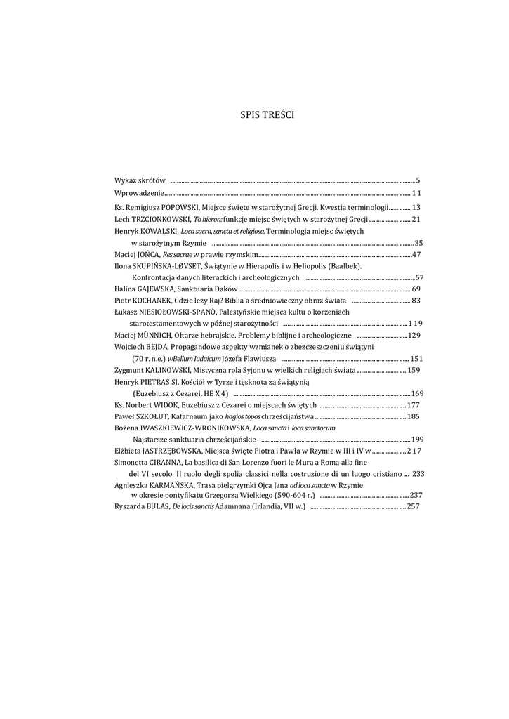 SPIS TREŚCI Wykaz skrótów ............................................................................................................................................................... 5 Wprowadzenie................................................................................................................................................................ 1 1 Ks. Remigiusz POPOWSKI, Miejsce święte w starożytnej Grecji. Kwestia terminologii .............. 13 Lech TRZCIONKOWSKI, To hieron: funkcje miejsc świętych w starożytnej Grecji ........................... 21 Henryk KOWALSKI, Loca sacra, sancta et religiosa. Terminologia miejsc świętych w starożytnym Rzymie ................................................................................................................................... 35 Maciej JOŃCA, Res sacrae w prawie rzymskim....................................................................................................47 Ilona SKUPIŃSKA-LØVSET, Świątynie w Hierapolis i w Heliopolis (Baalbek). Konfrontacja danych literackich i archeologicznych ........................................................................57 Halina GAJEWSKA, Sanktuaria Daków ................................................................................................................ 69 Piotr KOCHANEK, Gdzie leży Raj? Biblia a średniowieczny obraz świata ...................................... 83 Łukasz NIESIOŁOWSKI-SPANÒ, Palestyńskie miejsca kultu o korzeniach starotestamentowych w późnej starożytności ................................................................................. 1 1 9 Maciej MÜNNICH, Ołtarze hebrajskie. Problemy biblijne i archeologiczne .................................129 Wojciech BEJDA, Propagandowe aspekty wzmianek o zbezczeszczeniu świątyni (70 r. n.e.) wBellum Iudaicum Józefa Flawiusza ................................................................................... 151 Zygmunt KALINOWSKI, Mistyczna rola Syjonu w wielkich religiach świata ................................ 159 Henryk PIETRAS SJ, Kościół w Tyrze i tęsknota za świątynią (Euzebiusz z Cezarei, HE X 4) ................................................................................................................... 169 Ks. Norbert WIDOK, Euzebiusz z Cezarei o miejscach świętych ......................................................... 177 Paweł SZKOŁUT, Kafarnaum jako hagios topos chrześcijaństwa ........................................................... 185 Bożena IWASZKIEWICZ-WRONIKOWSKA, Loca sancta i loca sanctorum. Najstarsze sanktuaria chrześcijańskie ................................................................................................. 199 Elżbieta JASTRZĘBOWSKA, Miejsca święte Piotra i Pawła w Rzymie w III i IV w ...................... 2 1 7 Simonetta CIRANNA, La basilica di San Lorenzo fuori le Mura a Roma alla fine del VI secolo. Il ruolo degli spolia classici nella costruzione di un luogo cristiano ... 233 Agnieszka KARMAŃSKA, Trasa pielgrzymki Ojca Jana ad loca sancta w Rzymie w okresie pontyfikatu Grzegorza Wielkiego (590-604 r.) .......................................................... 237 Ryszarda BULAS, De locis sanctis Adamnana (Irlandia, VII w.) .............................................................. 257 464 SPIS TREŚCI Józef Cezary KAŁUŻNY, Spotkanie religii z polityką w architekturze sakralnej późnoantycznej Rawenny .......................................................................................................................... 265 Zsolt KISS, Świątynia w Luksorze. Miejsce święte Egipcjan, Rzymian, chrześcijan i muzułmanów .................................................................................................................................................... 281 Ida RYL-PREIBISZ, File. Starożytne miejsce kultu i ośrodek wczesnego chrześcijaństwa . . . 291 Bogdan ŻURAWSKI, Peregrinatio nubiana. Kilka uwag na marginesie problematyki miejsc świętych w Nubii chrześcijańskiej ............................................................................................. 301 Piotr O. SCHOLZ, Kontynuacja pogańskich „miejsc świętych" we wczesnej tradycji chrześcijańskiej. „Święta podróż" jako „kinetyczne miejsce święte" ....................................... 325 Tadeusz GOŁGOWSKI, Organizacja przestrzeni sakralnej w praktyce liturgicznej Wschodu chrześcijańskiego a kościoły chrześcijańskiej Nubii ................................................... 337 Andrzej FREJLICH, Mons Admirabilis i eulogie św. Symeona Słupnika Młodszego ...................... 353 Daniel PRÓCHNIAK, Między historią a legendą. Miejsca święte Armeńczyków .......................... 373 Ludmiła KHROUCHKOVA, La propagation du christianisme dans une région Pontique. La basilique de Candripš, „tempie pour les Abasges" ................................................................... 405 Maria Adelaide LALA COMNENO, II luogo sacro nelle città orientali: qualche considerazłone su delie regioni poco conosciute ......................................................... 447 Jadwiga KUCZYŃSKA, Tradycje kultu św. Michała Archanioła i jego sanktuaria ........................ 453 Lista uczestników VII Sympozjum Kazimierskiego ................................................................................... 461