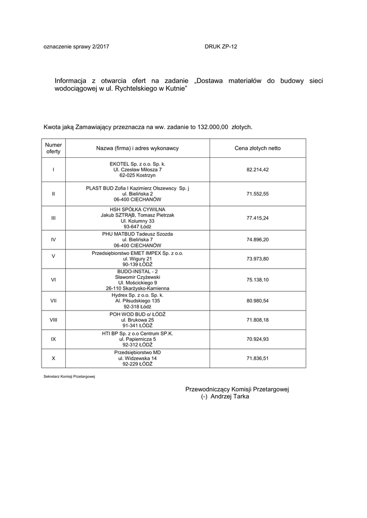 oznaczenie sprawy 2/2017 DRUK ZP-12 Informacja z otwarcia ofert na zadanie „Dostawa materiałów do budowy sieci wodociągowej w ul. Rychtelskiego w Kutnie” Kwota jaką Zamawiający przeznacza na ww. zadanie to 132.000,00 złotych. Numer oferty Nazwa (firma) i adres wykonawcy Cena złotych netto I EKOTEL Sp. z o.o. Sp. k. Ul. Czesław Miłosza 7 62-025 Kostrzyn 82.214,42 II PLAST BUD Zofia I Kazimierz Olszewscy Sp. j ul. Bielińska 2 06-400 CIECHANÓW 71.552,55 III HSH SPÓŁKA CYWILNA Jakub SZTRĄB, Tomasz Pietrzak Ul. Kolumny 33 93-647 Łódź 77.415,24 IV PHU MATBUD Tadeusz Szozda ul. Bielińska 7 06-400 CIECHANÓW 74.896,20 V VI VII Przedsiębiorstwo EMET IMPEX Sp. z o.o. ul. Wigury 21 90-139 ŁÓDŹ BUDO-INSTAL - 2 Sławomir Czyżewski Ul. Mościckiego 9 26-110 Skarżysko-Kamienna Hydrex Sp. z o.o. Sp. k. Al. Piłsudskiego 135 92-318 Łódź 73.973,80 75.138,10 80.980,54 VIII POH WOD BUD o/ ŁÓDŹ ul. Brukowa 25 91-341 ŁÓDŹ 71.808,18 IX HTI BP Sp. z o.o Centrum SP.K. ul. Papiernicza 5 92-312 ŁÓDŹ 70.924,93 X Przedsiębiorstwo MD ul. Widzewska 14 92-229 ŁÓDŹ 71.836,51 Sekretarz Komisji Przetargowej Przewodniczący Komisji Przetargowej (-) Andrzej Tarka