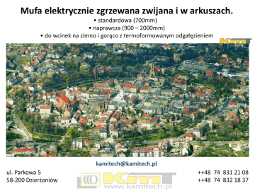 Mufa elektrycznie zgrzewana zwijana i w arkuszach. • standardowa (700mm) • naprawcza (900 – 2000mm) • do wcinek na zimno i gorąco z termoformowanym odgałęzieniem [email protected] ul. Parkowa 5 58-200 Dzierżoniów ++48 74 831 21 08 ++48 74 832 18 37 W nowoczesnych sieciach ciepłowniczych rury osłonowe są wykonane z wysokiej jakości polietylenu o podwyższonej odporności na propagację pęknięć. Stosowanie szczelnych połączeń jest gwarancją bezawaryjnej pracy takiej sieci. Zgrzewanie jest jedyną metodą zapewniającą uszczelnienie zespoleń o wytrzymałości większej od wytrzymałości rodzimej rury. • wyłącznie proces zgrzewania może być przedstawiony w formie prezentacji graficznej obrazującej zachowanie się materiałów w procesie łączenia (zgrzewania). • Elektromufy KamiTech w połączeniu ze zgrzewarkami elektrooporowymi KmT 2k8P zapewniają pełną automatyzację procesu zgrzewania. • wszystkie rzeczywiste parametry procesu mogą być przeniesione do komputera w postaci szyfrowanych, nieedytowalnych protokołów. Oprogramowanie KmT umożliwia zaprezentowanie danych w postaci graficznego wykresu rozkładu temperatury w złączu podczas procesu zgrzewania. • technologia montażu i zgrzewania nie wymaga specjalistycznej wiedzy – jedynie przeszkolenia. • faza wstępnego podgrzewania, oryginalne akcesoria montażowe i technologia KmT umożliwiają montaż muf na rurociągach z błędami montażowymi (ukosowanie) nawet powyżej 8°, a także pozwalają na poprawienie ułożenia mufy przed zasadniczym procesem zgrzewania. • zgrzewanie jest jedyną technologią rejestrującą przebieg procesu i umożliwiającą wygenerowanie elektronicznej dokumentacji powykonawczej z pełnym obrazem przebiegu procesu zgrzewania (nawet po upływie wielu lat od zakończenia prac montażowych). Historia produktów… KamiTech działa w branży urządzeń do łączenia rur z tworzyw sztucznych poprzez zgrzewanie od roku 1992. • 1993 – pierwsza zgrzewarka elekrooporowa pracująca w cyklu automatycznym • 1994 – zgrzewarka z rejestracją parametrów i czytnikiem kodów kreskowych • 1995 – pierwsza manualna zgrzewarka doczołowa • 1996 – automatyczna zgrzewarka doczołowa z rejestracją parametrów • 1999 – pierwsza zgrzewarka warsztatowa do prefabrykacji kolan dla systemów preizolowanych • 1997 – 2005 – kolejne wersje zgrzewarek elektrooporowych i doczołowych • 2007 – 2008 – zgrzewarki warsztatowe do termoformowania trójnika oraz zgrzewania osłony trójnika • 2007 – zgrzewarki elektrooporowe dla systemów rur preizolowanych (zgrzewana mufa termokurczliwa) • 2008 – nowa generacja zgrzewarek warsztatowych dla systemów ciśnieniowych (do Ø1000mm) • 2009 – nowa generacja zgrzewarek warsztatowych dla systemów rur preizolowanych (do Ø1200mm) • 2010 – 4 generacja zgrzewarek elektrooporowych • 2011 – 3 generacja zgrzewarek doczołowych • 2011 – 2012 – unifikacja zgrzewarek doczołowych oraz elektrooporowych (dla systemów ciśnieniowych i preizolowanych) elektromufy owijane KmT PE-L oraz PE-LN • 2013 – mufa owijana z termoformowanym gniazdem odgałęzienia (KmT PE-LO) do wcinek na zimno i na gorąco, 3 generacja zgrzewarek elektrooporowych dla systemów mufy owijanej (rejestracja danych na kartach SD, GPS, nowe oprogramowanie do archiwizacji). Nasze produkty: urządzenia i technologia elektrooporowego zgrzewania rur preizolowanych zgrzewarki dla systemów ciśnieniowych stanowiska do prefabrykacji kształtek segmentowych (łuki, kolana) Zgrzewarki warsztatowe KmT. Termoformowanie odgałęzienia trójnika. 1 2 3 4 5 Mufa z zaformowanym odgałęzieniem do wcinek na zimno i gorąco. Montaż i zgrzewanie – narzędzia montażowe. Prezentacje i szkolenia. Zalety muf KmT na budowie. Sytuacje w których montaż muf tulejowych termokurczliwych jest niemożliwy. Dobór parametrów termicznych. Stabilność rozkładu temperatur. Protokoły ze zgrzewania w warunkach budowlanych Badania w laboratorium KmT Badania w Laboratoriach akredytowanych oraz na Politechnice Wrocławskiej g/10 min Wyniki badania MFR 1,4 1,2 1 0,8 0,6 0,4 0,2 0 PE 100 Izocon PE 100 EA PE 80 Izocon 190 0 C/5 kg 0,282 0,321 0,612 230 0 C/5 kg 0,476 0,531 1,279 Badania w skrzyni z piaskiem w Dalkia Heat-Tech Center Sprawozdanie z badań w skrzyni z piaskiem wg. PN-EN 489:2005 Sprawozdanie z badań na pękanie (działania karbu) wg. PN-EN 489:2009