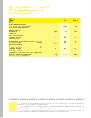 Wyroby karborundowe SiC Carborundum products SiC Erzeugnisse Gatunek Grade Sorte Maks. temperatura pracy Max. temperature of aplication Max. Anwendungstemperatur 94/4 p 1450 1460 g/cm 2,50 2,55 % 20 20 N/mm 18 12 18 14 % 80 85 10-6K-1 4,85 4,85 °C Gęstość pozorna Bulk density Rohdichte 3 Porowatość otwarta Apparent porosity Offene Porosität Wytrzymałość na zginanie w temperaturze 20°C Bending strenght 1200°C Kaltbiegefestigkeit Analiza chemiczna: Chemical analysis Chemische Analyse 88s 2 SiC Współczynnik rozszerzalności cieplnej 20-1000°C Thermal coefficient of expansion Wärmeausdenhungkoeffizient Oferowane parametry są własnościami przeciętnymi wyrobów standardowych formowanych maszynowo o wadze do 12 kg i nie stanowią warunków odbioru. The presented qualities have been specified as average properties of machine formed products with weight into 12 kg and are not to be conditions of receipt. Die angegebenen Daten sind Durchschnittswerte für maschinengepressten Steine bis zum Gewicht von 12 kg. Die Durchschnittswerte sind typische Richtwerte, die nicht als Spezifikation gelten. Wyroby karborundowe SiC Carborundum products SiC erzeugnisse Gatunek Grade Sorte Analiza chemiczna: Chemical analysis Chemische Analyse Jednostka Unit Einheit SiC Max temperatura stosowania Temperature limit Max Anwendungstemperatur Gęstość pozorna Bulk density Rohdichte Porowatość otwarta Apparent porosity Offene Porosität Wytrzymałość na ściskanie Cold crushing strenght Kaltdruckfestigkeit EH % ‡65 °C 1450 g/cm3 2,50 % 22-23 N/mm2 100 Odporność na nagłe zmiany temperatury Thermal shock resistance Temperaturwechselbeständigkeit Bardzo dobra Odporność na utlenianie Oxidation resistance Oxydationsbeständigkeit Bardzo dobra Zastosowanie Typical application Typische Anwendung Very good Sehr gut Very good Sehr gut Osłony Saggars Kapseln Nasz odporny na zmiany temperatury gatunek SiC wyróżnia się dobrą przewodnością cieplną. Dodatkowo korzystnie wpływa na żywotność wyrobu, dobrze trzymająca się, nie szkliwiąca się, chroniąca przed oksydacją angoba. Our thermal shock resistant silicon carbide grades are distinguished by their very good thermal conductivity. A good sticking, not vitrifying and against oxidizing protecting engobe is another condition for a long service life. Unsesre temperaturwechselbeständingen SiC-Sorten zeichnen sich durch ihre sehr gute Wärmeleitfähigkeit aus. Zusätzlich günstig beeinflußt werden die Standzeiten durch eine gut haftende, nicht verglasende und vor Oxidation Schützende Engobe.