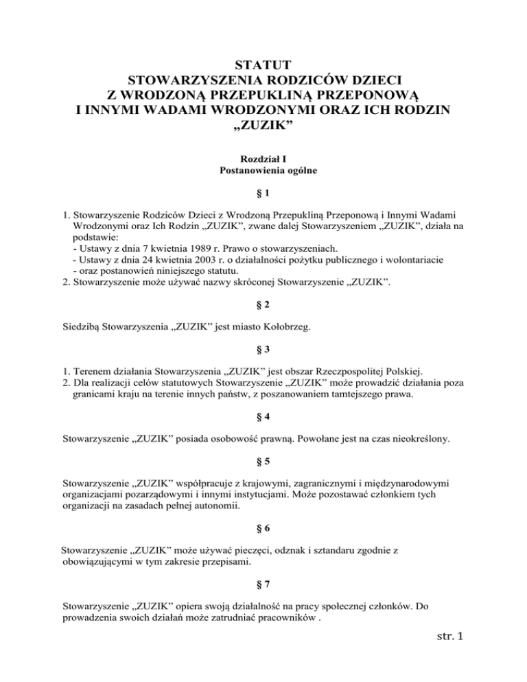 STATUT STOWARZYSZENIA RODZICÓW DZIECI Z WRODZONĄ PRZEPUKLINĄ PRZEPONOWĄ I INNYMI WADAMI WRODZONYMI ORAZ ICH RODZIN „ZUZIK” Rozdział I Postanowienia ogólne §1 1. Stowarzyszenie Rodziców Dzieci z Wrodzoną Przepukliną Przeponową i Innymi Wadami Wrodzonymi oraz Ich Rodzin „ZUZIK”, zwane dalej Stowarzyszeniem „ZUZIK”, działa na podstawie: - Ustawy z dnia 7 kwietnia 1989 r. Prawo o stowarzyszeniach. - Ustawy z dnia 24 kwietnia 2003 r. o działalności pożytku publicznego i wolontariacie - oraz postanowień niniejszego statutu. 2. Stowarzyszenie może używać nazwy skróconej Stowarzyszenie „ZUZIK”. §2 Siedzibą Stowarzyszenia „ZUZIK” jest miasto Kołobrzeg. §3 1. Terenem działania Stowarzyszenia „ZUZIK” jest obszar Rzeczpospolitej Polskiej. 2. Dla realizacji celów statutowych Stowarzyszenie „ZUZIK” może prowadzić działania poza granicami kraju na terenie innych państw, z poszanowaniem tamtejszego prawa. §4 Stowarzyszenie „ZUZIK” posiada osobowość prawną. Powołane jest na czas nieokreślony. §5 Stowarzyszenie „ZUZIK” współpracuje z krajowymi, zagranicznymi i międzynarodowymi organizacjami pozarządowymi i innymi instytucjami. Może pozostawać członkiem tych organizacji na zasadach pełnej autonomii. §6 Stowarzyszenie „ZUZIK” może używać pieczęci, odznak i sztandaru zgodnie z obowiązującymi w tym zakresie przepisami. §7 Stowarzyszenie „ZUZIK” opiera swoją działalność na pracy społecznej członków. Do prowadzenia swoich działań może zatrudniać pracowników . str. 1 Rozdział II Cele i sposoby ich realizacji §8 Celem Stowarzyszenia „ZUZIK” jest działalność w zakresie: 1. 2. 3. 4. 5. 6. Dobroczynności i działalności charytatywnej . Ochrony zdrowia i pomocy społecznej . Rehabilitacji zawodowej i społecznej inwalidów oraz kultu religijnego. Promocji i organizacji wolontariatu. Działalności na rzecz osób niepełnosprawnych. Innych form wsparcia dla członków Stowarzyszenia. §9 1. Stowarzyszenie „ZUZIK” realizuje swoje cele prowadząc nieodpłatną i odpłatną działalność pożytku publicznego. 2. Działalnością nieodpłatną pożytku publicznego Stowarzyszenia „ZUZIK” jest: a) Działalność związana z organizacją konferencji, targów, wystaw i kongresów (PKD 82.30.Z). b) Pozostałe pozaszkolne formy edukacji gdzie indziej nie sklasyfikowane, szkolenia, seminaria w zakresie promocji i ochrony zdrowia dla pracowników, członków Stowarzyszenia, wolontariuszy i innych zainteresowanych osób (PKD 85.59.B). c) Prowadzenie działalności mającej na celu promocję i ochronę zdrowia dzieci z wadami wrodzonymi poprzez współpracę z ośrodkami medycznymi w kraju i za granicą, popularyzowanie zdobytej wiedzy na temat tych wad, osiągnięć Stowarzyszenia oraz organizowanie i finansowanie forum umożliwiającego zapoznanie się z osiągnięciami naukowymi w leczeniu (PKD 85.59 Z). d) Organizowanie i finansowanie zakupu specjalistycznego sprzętu medycznego (w tym leczniczego, rehabilitacyjnego itp.) oraz lekarstw niezbędnych dla ratowania zdrowia lub życia oraz inne formy finansowania leczenia, zarówno na terytorium Rzeczpospolitej Polskiej i za granicą (PKD 86.90.E). e) Pozostała działalność w zakresie opieki zdrowotnej, gdzie indziej niesklasyfikowaną (działalność w zakresie profilaktyki i promocji zdrowia) ( PKD 86.90 E). f) Pozostała pomoc społeczna bez zakwaterowania gdzie indziej nie sklasyfikowana, pomoc dla dzieci z wadami wrodzonymi i ich rodzin w okresie prenatalnym i po urodzeniu, pomoc rzeczowa, finansowa, inna ( PKD 88.99.Z ). g) Prowadzenie stałej działalności informacyjnej, doradczej i profilaktycznej w zakresie realizacji celów statutowych Stowarzyszenia „ZUZIK” (PKD 94.99.Z), h) Niesienie pomocy psychologicznej i terapeutycznej. (PKD 94.99.Z), i) Gromadzenie funduszy na realizację zadań statutowych, pozyskiwanie środków ze źródeł krajowych i zagranicznych, uczestnictwo w projektach, zamówieniach publicznych, programach unijnych i innych, w tym zagranicznych. (PKD 94.99.Z), j) Współprace z lekarzami oraz innymi instytucjami na terenie kraju i zagranicy (PKD 94.99.Z). k) Organizacja kampanii społecznych, koncertów , występów, wystaw (PKD 94.99.Z). l) Reprezentowanie interesów osób niepełnosprawnych wobec władz publicznych (PKD 94.99.Z). str. 2 m) Niesienie pomocy moralnej, materialnej i prawnej osobom niepełnosprawnym (PKD 94.99.Z) n) Organizowanie wypoczynku wakacyjnego i imprez sportowo – rekreacyjno integracyjnych (PKD 94 99 Z). o) Działalność pozostałych organizacji członkowskich gdzie indziej niesklasyfikowana (PKD 94.99Z). p) Organizacja pomocy w zakresie finansowania transportu ,w tym medycznego (PKD 94.99.Z). q) Organizacja pomocy w zakresie finansowania rehabilitacji oraz zakupu sprzętu i leków (PKD 94.99.Z). r) Promocja i organizacja wolontariatu (PKD 94.99.Z). s) Współpraca, pomoc i wspieranie, również finansowe innych instytucji i organizacji działających w celach zbieżnych z celami Stowarzyszenia (PKD 94.99.Z). t) Inicjowanie i prowadzenie grup spotkaniowych, grup wsparcia, grup terapeutycznych oraz innych form oddziaływań psychospołecznych i rehabilitacyjnych dla dzieci z wadami wrodzonymi i ich rodzin. (PKD 94.99.Z). u) Podejmowanie wszelkich innych dozwolonych prawem działań służących realizacji celów statutowych Stowarzyszenia (PKD 94.99.Z). 3. Działalnością odpłatną pożytku publicznego Stowarzyszenia „ZUZIK” jest: a) Działalność związana z organizacją konferencji, targów, wystaw i kongresów (PKD 82.30.Z). b) Pozostałe pozaszkolne formy edukacji gdzie indziej nie sklasyfikowane, szkolenia, seminaria w zakresie promocji i ochrony zdrowia dla pracowników, członków Stowarzyszenia, wolontariuszy i innych zainteresowanych osób (PKD 85.59.B). c) Prowadzenie działalności mającej na celu promocję i ochronę zdrowia dzieci z wadami wrodzonymi poprzez współpracę z