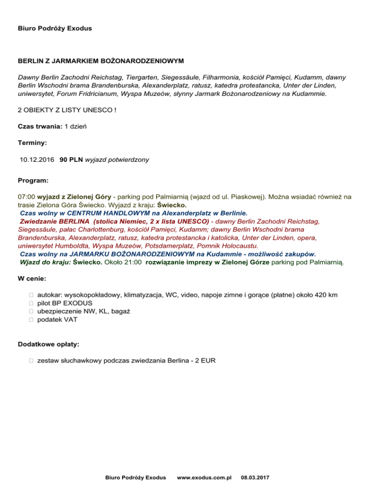 Biuro Podróży Exodus BERLIN Z JARMARKIEM BOŻONARODZENIOWYM Dawny Berlin Zachodni Reichstag, Tiergarten, Siegessäule, Filharmonia, kościół Pamięci, Kudamm, dawny Berlin Wschodni brama Brandenburska, Alexanderplatz, ratusz, katedra protestancka, Unter der Linden, uniwersytet, Forum Fridricianum, Wyspa Muzeów, słynny Jarmark Bożonarodzeniowy na Kudammie. 2 OBIEKTY Z LISTY UNESCO ! Czas trwania: 1 dzień Terminy: 10.12.2016 90 PLN wyjazd potwierdzony Program: 07:00 wyjazd z Zielonej Góry - parking pod Palmiarnią (wjazd od ul. Piaskowej). Można wsiadać również na trasie Zielona Góra Świecko. Wyjazd z kraju: Świecko. Czas wolny w CENTRUM HANDLOWYM na Alexanderplatz w Berlinie. Zwiedzanie BERLINA (stolica Niemiec, 2 x lista UNESCO) - dawny Berlin Zachodni Reichstag, Siegessäule, pałac Charlottenburg, kościół Pamięci, Kudamm; dawny Berlin Wschodni brama Brandenburska, Alexanderplatz, ratusz, katedra protestancka i katolicka, Unter der Linden, opera, uniwersytet Humboldta, Wyspa Muzeów, Potsdamerplatz, Pomnik Holocaustu. Czas wolny na JARMARKU BOŻONARODZENIOWYM na Kudammie - możliwość zakupów. Wjazd do kraju: Świecko. Około 21:00 rozwiązanie imprezy w Zielonej Górze parking pod Palmiarnią. W cenie: autokar: wysokopokładowy, klimatyzacja, WC, video, napoje zimne i gorące (płatne) około 420 km pilot BP EXODUS ubezpieczenie NW, KL, bagaż podatek VAT Dodatkowe opłaty: zestaw słuchawkowy podczas zwiedzania Berlina - 2 EUR Biuro Podróży Exodus www.exodus.com.pl 08.03.2017