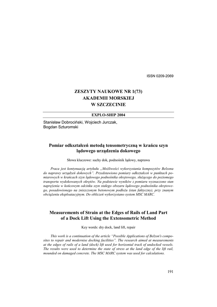 ISSN 0209-2069 ZESZYTY NAUKOWE NR 1(73) AKADEMII MORSKIEJ W SZCZECINIE EXPLO-SHIP 2004 Stanisław Dobrociński, Wojciech Jurczak, Bogdan Szturomski Pomiar odkształceń metodą tensometryczną w krańcu szyn lądowego urządzenia dokowego Słowa kluczowe: suchy dok, podnośnik lądowy, naprawa Praca jest kontynuacją artykułu „Możliwości wykorzystania kompozytów Belzona do naprawy urządzeń dokowych”. Przedstawiono pomiary odkształceń w punktach pomiarowych w krańcach szyn lądowego podnośnika okrętowego, służącego do poziomego transportu wydokowanych okrętów. Na podstawie wyników z pomiaru wyznaczono stan naprężenia w końcowym odcinku szyn stałego obszaru lądowego podnośnika okrętowego, posadowionego na zniszczonym betonowym podłożu (stan faktyczny), przy znanym obciążeniu eksploatacyjnym. Do obliczeń wykorzystano system MSC MARC. Measurements of Strain at the Edges of Rails of Land Part of a Dock Lift Using the Extensometric Method Key words: dry dock, land lift, repair This work is a continuation of the article “Possible Applications of Belzon's composites to repair and modernise docking facilities”. The research aimed at measurements at the edges of rails of a land (dock) lift used for horizontal track of undocked vessels. The results were used to determine the state of stress at the land edge of the lift rail, mounded on damaged concrete. The MSC MARC system was used for calculations. 191 Stanisław Dobrociński, Wojciech Jurczak, Bogdan Szturomski 1. Opis problemu Rozwiązywany problem dotyczy udarowego niszczenia kół wózków, stanowiących podporę transportową kadłuba dokowanego okrętu przy przekazywaniu tegoż obiektu ze stałego obszaru na obszar ruchomy podnośnika lądowego. Przyczyną tego zjawiska jest brak liniowości przyjścia szyn ww. obszarów (rys. 1), spowodowaną wyraźną deformacją szyn końcowego odcinka obszaru stałego, wywołaną ubytkami betonowego podłoża. Należy przypuszczać, że tak drastyczną deformację wspomnianych szyn spowodowała wieloletnia eksploatacja tego stanowiska, w głównej mierze przez przeciążenia (przekroczony ciężar dokowanych jednostek) i erozję betonu przyspieszoną działaniem wody, szczególnie w okresie zimowym. Rys. 1. Miejsce łączenia szyn obszaru stałego i ruchomego lądowego podnośnika okrętowego z szyną pośrednią Fig. 1. The connection between rails of land and movable parts of the screw lift 2. Przebieg badań Po wstępnych ustaleniach, z udziałem pracowników stoczni, wyznaczone obszary badanych szyn zostały wstępnie oczyszczone, osuszone i odtłuszczone. Pomiaru odkształceń dokonywano metodą tensometryczną. Na przygotowanych do badań szynach lądowego stanowiska podnośnika okrętu naklejono 8 tensometrów, po 4 na każdej szynie. Tensometry zostały naklejone na końcowych fragmentach szyn na odcinku w odległości od końca szyny odpowiednio 21, 62, 101, 144 cm (rys. 2). Zastosowano tensometry typu TF pxy-4. Niestety na skutek złych warunków pogodowych tensometry uległy zalaniu i na szynie prawej sprawne pozostały pierwszy i drugi tensometr, a na szynie lewej pierwszy i trzeci. 192 Pomiar odkształceń metodą tensometryczną w krańcu szyn lądowego urządzenia dokowego T1 T2 T3 T4 21 621 101 144 Rys. 2. Tensometry naklejone na stopie szyny Fig. 2. Extensometers stuck to the rail foot Dokonano pomiarów odkształcenia szyn pod wpływem zadanego obciążenia eksploatacyjnego. Obciążenie stanowił ponton, napełniony wodą o masie 84 ton, posadowiony na dwóch wózkach o masie 3,3 tony każdy. Ponton nad pierwszym wózkiem został dodatkowo obciążony masą 22 ton (rys. 3). Rys. 3. Obciążenie szyny Fig. 3. The load of a rail 193 Stanisław Dobrociński, Wojciech Jurczak, Bogdan Szturomski Zestaw aparatury stanowił 10-kanałowy układ pomiarowy produkcji włoskiej. Do rejestracji wykorzystano 4-kanałowy oscyloskop firmy „Hewlett Packard” typu Onfinium. Pomiarów dokonano w układzie półmostka. Jeden z tensometrów TF pxy-4 był tensometrem czynnym, a drugi kompensacyjnym. 3. Kolejność badań Przebieg pomiaru wyglądał następująco. Ponton umieszczony na dwóch wózkach przemieszczał się pomiędzy naklejonymi tensometrami. Sygnał z tensometrów poprzez układ wzmacniający był podawany na oscyloskop i rejestrowany. Jednocześnie rejestrowano sygnał z obu sprawnych tensometrów pierwszej szyny. Później przejazd wózka ponawiano i rejestrowano sygnały z tensometrów naklejonych na drugiej szynie. Rys. 4. Schemat pomiaru odkształceń Fig. 4. Strain measurements 4. Wyniki badań Zarejestrowane odkształcenia w punktach pomiarowych przeliczono na naprężenia, otrzymując następujące wyniki (rys. 5 i 6). Są to naprężenia normalne, które mają decydujący wpływ na stan naprężenia w tym przypadku podparcia szyny, ponieważ gdy koło wózka znajduje się nad ubytkiem betonu, szyna jest przede wszystkim zginana. Analizując otrzymane przebiegi naprężeń w punktach pomiarowych można zauważyć, że na tensometrze pierwszym w obu przypadkach szyna odkształca się w przeciwnym kierunku. Świadczy to, że pod szyną jest szczelina, bądź też podłoże jest pokruszone i ma zmienną sztywność (rys. 7). 194 Pomiar odkształceń metodą tensometryczną w krańcu szyn lądowego urządzenia dokowego [Pa] tensometr nr 1 tensometr nr 2 [0.1 s] Rys. 5. Wykres stanu naprężenia w funkcji czasu na szynie prawej Fig. 5. The stress of the right rail as the time function [Pa] tensometr nr 1 tensometr nr 3 [0.1 s] Rys. 6. Wykres stanu naprężenia w funkcji czasu na szynie lewej Fig. 6. The stress of the left rail as the time function 195 Stanisław Dobrociński, Wojciech Jurczak, Bogdan Szturomski T1 T2 T3 T4 szczelina pod szyną Rys. 7. Prawdopodobny kształt podłoża pod szyną Fig. 7. Probable shape of the base under a rail 5. Obliczenia numeryczne stanu naprężenia w szynie Otrzymane wyniki odzwierciedlają naprężenia w punkcie n