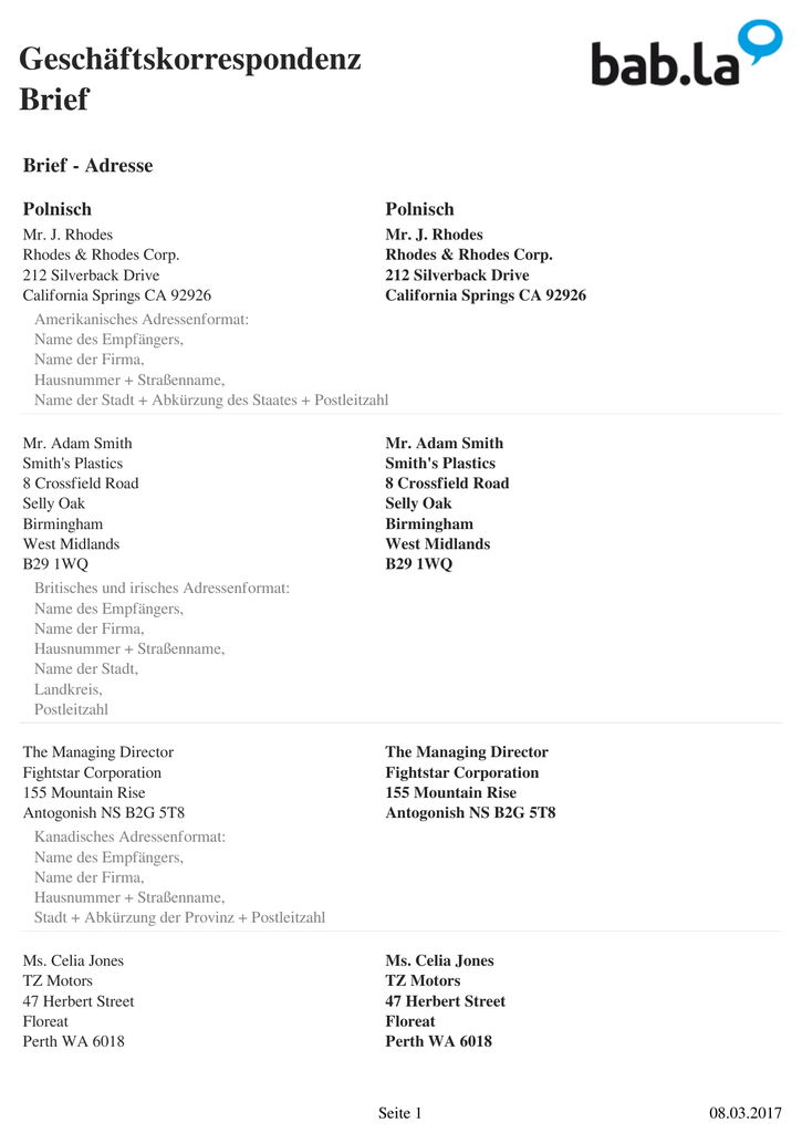 Geschäftskorrespondenz Brief Brief - Adresse Polnisch Polnisch Mr. J. Rhodes Mr. J. Rhodes Rhodes & Rhodes Corp. Rhodes & Rhodes Corp. 212 Silverback Drive 212 Silverback Drive California Springs CA 92926 California Springs CA 92926 Amerikanisches Adressenformat: Name des Empfängers, Name der Firma, Hausnummer + Straßenname, Name der Stadt + Abkürzung des Staates + Postleitzahl Mr. Adam Smith Smith's Plastics 8 Crossfield Road Selly Oak Birmingham West Midlands B29 1WQ Britisches und irisches Adressenformat: Name des Empfängers, Name der Firma, Hausnummer + Straßenname, Name der Stadt, Landkreis, Postleitzahl Mr. Adam Smith Smith's Plastics 8 Crossfield Road Selly Oak Birmingham West Midlands B29 1WQ The Managing Director Fightstar Corporation 155 Mountain Rise Antogonish NS B2G 5T8 Kanadisches Adressenformat: Name des Empfängers, Name der Firma, Hausnummer + Straßenname, Stadt + Abkürzung der Provinz + Postleitzahl The Managing Director Fightstar Corporation 155 Mountain Rise Antogonish NS B2G 5T8 Ms. Celia Jones TZ Motors 47 Herbert Street Floreat Perth WA 6018 Ms. Celia Jones TZ Motors 47 Herbert Street Floreat Perth WA 6018 Seite 1 08.03.2017 Geschäftskorrespondenz Brief Australisches Adressenformat: Name des Empfängers, Name der Firma, Hausnummer + Straßenname, Name der Provinz, Stadt + Postleitzahl Miss L. Marshall Aquatechnics Ltd. 745 King Street West End Wellington 0680 Neuseeländisches Adressenformat: Name des Empfängers, Name der Firma, Hausnummer + Straßenname, Vorort/Straße/Postfach, Stadt + Postleitzahl Miss L. Marshall Aquatechnics Ltd. 745 King Street West End Wellington 0680 Mirosław Zdaniuk Mirosław Zdaniuk Okonel Sp. z.o.o. Okonel Sp. z.o.o. ul. Złota 3 ul. Złota 3 00-115 Warszawa 00-115 Warszawa Standard-Adressenformat in Deutschland: Name der Firma, Name des Empfängers, Straße + Hausnummer, Postleitzahl + Stadt, Land Brief - Einleitung Polnisch Polnisch Szanowny Panie Prezydencie, Szanowny Panie Prezydencie, Sehr formell, Empfänger hat einen besonderen Titel, der anstelle seines Namens benutzt wird Szanowny Panie, Formell, männlicher Empfänger, Name unbekannt Szanowny Panie, Szanowna Pani, Formell, weibliche Empfängerin, Name unbekannt Szanowna Pani, Seite 2 08.03.2017 Geschäftskorrespondenz Brief Szanowni Państwo, Szanowni Państwo, Formell, Name und Geschlecht des Empfängers unbekannt Szanowni Państwo, Szanowni Państwo, Formell, eine Gruppe von unbekannten Menschen oder eine Abteilung wird addressiert Szanowni Państwo, Szanowni Państwo, Formell, Name und Geschlecht des Empfängers völlig unbekannt Szanowny Panie, Formell, männlicher Empfänger, Name bekannt Szanowny Panie, Szanowna Pani, Szanowna Pani, Formell, weibliche Empfängerin, verheiratet, Name bekannt Szanowna Pani, Szanowna Pani, Formell, weibliche Empfängerin, ledig, Name bekannt Szanowna Pani, Szanowna Pani, Formell, weibliche Empfängerin, Familienstand unbekannt, Name bekannt Szanowny Panie, Szanowny Panie, Weniger formell, man hat bereits Geschäfte mit dem Empfänger gemacht Drogi Tomaszu, Drogi Tomaszu, Informell, man ist mit dem Empfänger persönlich befreundet, eher ungebräuchlich Piszemy do Państwa w sprawie... Formell, Einleitung im Namen der gesamten Firma Piszemy do Państwa w sprawie... Piszemy do Państwa w związku z... Formell, Einleitung im Namen der gesamten Firma Piszemy do Państwa w związku z... W nawiązaniu do... W nawiązaniu do... Formell, Einleitung nimmt Bezug auf etwas, das man in der kontaktierten Firma gesehen hat Nawiązując do... Nawiązując do... Formell, Einleitung nimmt Bezug auf etwas, das man in der kontaktierten Firma gesehen hat Seite 3 08.03.2017 Geschäftskorrespondenz Brief Piszę do Państwa z zapytaniem o... Piszę do Państwa z zapytaniem o... Weniger formell, Einleitung im eigenen Namen für das eigene Unternehmen W imieniu Pana Michalaka, piszę do Państwa... Formell, im Namen einer anderen Person W imieniu Pana Michalaka, piszę do Państwa... Pańska firma została nam wysoce polecona/rekomendowana przez... Formell, höfliche Einleitung Pańska firma została nam wysoce polecona/rekomendowana przez... Brief - Hauptteil Polnisch Polnisch Czy miałby Pan coś przeciwko... Formelle Anfrage, vorsichtig Czy miałby Pan coś przeciwko... Czy byłby Pan tak uprzejmy... Formelle Anfrage, vorsichtig Czy byłby Pan tak uprzejmy... Byłbym zobowiązany, gdyby... Formelle Anfrage, vorsichtig Byłbym zobowiązany, gdyby... Bylibyśmy wdzięczni, gdyby mógł Pan przesłać nam więcej informacji na temat... Formelle Anfrage, sehr höflich Bylibyśmy wdzięczni, gdyby mógł Pan przesłać nam więcej informacji na temat... Byłbym wdzięczny, gdyby Pan zechciał... Formelle Anfrage, sehr höflich Byłbym wdzięczny, gdyby Pan zechciał... Czy mógłby mi Pan przesłać... Formelle Anfrage, höflich Czy mógłby mi Pan przesłać... Jesteśmy zainteresowani nabyciem/otrzymaniem... Formelle Anfrage, höflich Jesteśmy zainteresowani nabyciem/otrzymaniem... Chciałbym zapytać, czy... Formelle Anfrage, höflich Chciałbym zapytać, czy... Seite 4 08.03.2017 Geschäftskorrespondenz Brief Czy mógłby mi Pan polecić... Formelle Anfrage, direkt Czy mógłby mi Pan polecić... Prosiłbym o przesłanie mi... Formelle Anfrage, direkt Prosiłbym o przesłanie mi... Proszę o pilne... Formelle Anfrage, sehr direkt Proszę o pilne... Będziemy wdzięczni, jeśli... Będziemy wdzięczni, jeśli... Formelle Anfrage, höflich, im Namen des Unternehmens Jaka jest Pańska obecna cena za... Spezifische formelle Anfrage, direkt Jaka jest Pańska obecna cena za... Jesteśmy zainteresowani...i chcielibyśmy się dowiedzieć... Formelle Anfrage, direkt Jesteśmy zainteresowani...i chcielibyśmy się dowiedzieć... Z reklamy wnioskujemy, że produkują Państwo... Formelle Anfrage, direkt Z reklamy wnioskujemy, że produkują Państwo... Mamy zamiar/Nosimy się z zamiarem... Formelle Absichtserklärung, direkt Mamy zamiar/Nosimy się z zamiarem... 