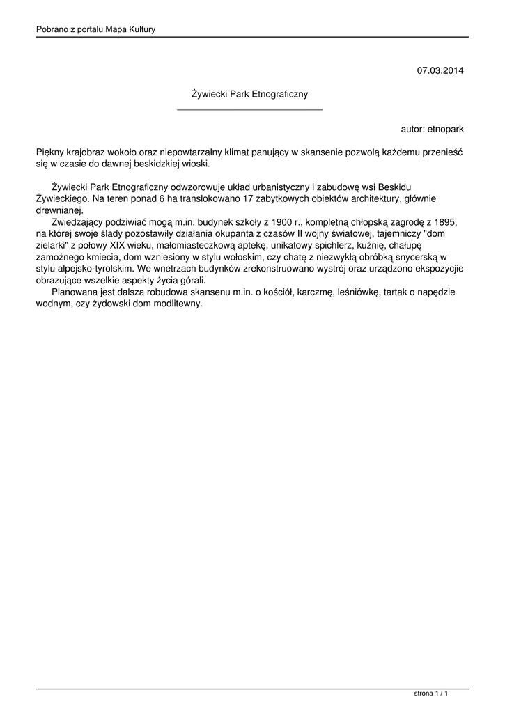 Pobrano z portalu Mapa Kultury 07.03.2014 Żywiecki Park Etnograficzny ____________________________ autor: etnopark Piękny krajobraz wokoło oraz niepowtarzalny klimat panujący w skansenie pozwolą każdemu przenieść się w czasie do dawnej beskidzkiej wioski. Żywiecki Park Etnograficzny odwzorowuje układ urbanistyczny i zabudowę wsi Beskidu Żywieckiego. Na teren ponad 6 ha translokowano 17 zabytkowych obiektów architektury, głównie drewnianej. Zwiedzający podziwiać mogą m.in. budynek szkoły z 1900 r., kompletną chłopską zagrodę z 1895, na której swoje ślady pozostawiły działania okupanta z czasów II wojny światowej, tajemniczy "dom zielarki" z połowy XIX wieku, małomiasteczkową aptekę, unikatowy spichlerz, kuźnię, chałupę zamożnego kmiecia, dom wzniesiony w stylu wołoskim, czy chatę z niezwykłą obróbką snycerską w stylu alpejsko-tyrolskim. We wnetrzach budynków zrekonstruowano wystrój oraz urządzono ekspozycjie obrazujące wszelkie aspekty życia górali. Planowana jest dalsza robudowa skansenu m.in. o kościół, karczmę, leśniówkę, tartak o napędzie wodnym, czy żydowski dom modlitewny. strona 1 / 1