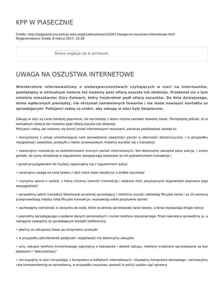 KPP W PIASECZNIE Źródło: http://kpppiaseczno.policja.waw.pl/pp1/aktualnosci/25267,Uwaga-na-oszustwa-internetowe.html Wygenerowano: Środa, 8 marca 2017, 15:28 Strona znajduje się w archiwum. UWAGA NA OSZUSTWA INTERNETOWE Wielokrotnie informowaliśmy o niebezpieczeństwach czyhających w sieci na internautów, pamiętajmy w wirtualnym świecie też możemy paść ofiarą oszusta lub złodzieja. Przekonał się o tym ostatnio mieszkaniec Góry Kalwarii, który trzykrotnie padł ofiarą oszustów. Do dnia dzisiejszego, mimo wpłaconych pieniędzy, nie otrzymał zamówionych towarów i nie może nawiązać kontaktu ze sprzedającymi. Policjanci radzą co zrobić, aby zakupy w sieci były bezpieczne. Zakupy w sieci są coraz bardziej popularne, nie wychodząc z domu można zamówić dowolny towar. Pamiętajmy jednak, że w wirtualnym świecie też możemy paść ofiarą oszusta lub złodzieja. Policjanci radzą, jak możemy się bronić przed internetowymi oszustami, pierwsza podstawowa zasada to: • korzystajmy z usługi umożliwiającej nam sprawdzenie zawartości paczki w obecności dostarczyciela. / w przypadku niezgodności zawartości przesyłki z listem przewozowym możemy wycofać się z transakcji/ • zawierajmy transakcje za pośrednictwem znanych portali internetowych. Nie dokonujmy zakupów poza aukcją. / znane portale, do sumy określonej w regulaminie ubezpieczają zawierane za ich pośrednictwem transakcje / • przed przystąpieniem do licytacji zapoznajmy się z regulaminem aukcji • zwracajmy uwagę na cenę towaru / zbyt niska może świadczyć o próbie oszustwa/ • czytajmy opinie o osobie, z którą chcemy zawrzeć transakcję / większa ilość pozytywnych wypowiedzi poprawia jego wiarygodność/ • sprawdźmy jakich transakcji dokonywał wcześniej sprzedający / niektórzy oszuści zakładają fikcyjne konta i za ich pomocą przeprowadzają między sobą fikcyjne transakcje i wystawiają sobie pozytywne opinie/ • zachowajmy ostrożność w stosunku do osób, które wcześniej sprzedawały tanie towary, a teraz wystawiają drogie rzeczy • poprośmy sprzedającego o podanie danych personalnych i numer telefonu stacjonarnego. Przez operatora sprawdźmy je, a następnie nawiążmy ze sprzedającym kontakt telefoniczny • płaćmy za zakupiony towar po otrzymaniu przesyłki • w przypadku jakichkolwiek podejrzeń i wątpliwości nie dokonujmy zakupów • przy zakupie telefonu komórkowego zapytajmy o ładowarkę i dowód zakupu, telefony kradzione sprzedawane są bez ładowarki i "dokumentacji" • nie kupujmy w sieci korzystając z komputera w kafejkach internetowych. Używajmy komputera domowego i zachowujmy całą korespondencję ze sprzedawcą, w przypadku oszustwa, pozwoli to policji szybko ująć sprawcę • jeżeli mimo zachowania ostrożności, dostaniemy jednak zamiast towaru puste pudełko, natychmiast należy powiadomić policję. Wtedy zachowana korespondencja i przesłana przez oszusta paczka będą stanowiły dowód przestępstwa • pamiętajmy aby zawsze kierować się ograniczonym zaufaniem do sprzedającego Zanim dokonamy zakupów w „sieci” pamiętajmy o powyższych zasadach hkk Ocena: 0/5 (0) Tweetnij