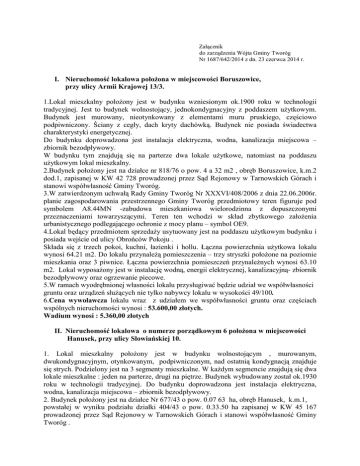 Załącznik do zarządzenia Wójta Gminy Tworóg Nr 1687/642/2014 z dn. 23 czerwca 2014 r. I. Nieruchomość lokalowa położona w miejscowości Boruszowice, przy ulicy Armii Krajowej 13/3. 1.Lokal mieszkalny położony jest w budynku wzniesionym ok.1900 roku w technologii tradycyjnej. Jest to budynek wolnostojący, jednokondygnacyjny z poddaszem użytkowym. Budynek jest murowany, nieotynkowany z elementami muru pruskiego, częściowo podpiwniczony. Ściany z cegły, dach kryty dachówką. Budynek nie posiada świadectwa charakterystyki energetycznej. Do budynku doprowadzona jest instalacja elektryczna, wodna, kanalizacja miejscowa – zbiornik bezodpływowy. W budynku tym znajdują się na parterze dwa lokale użytkowe, natomiast na poddaszu użytkowym lokal mieszkalny. 2.Budynek położony jest na działce nr 818/76 o pow. 4 a 32 m2 , obręb Boruszowice, k.m.2 dod.1, zapisanej w KW 42 728 prowadzonej przez Sąd Rejonowy w Tarnowskich Górach i stanowi współwłasność Gminy Tworóg. 3.W zatwierdzonym uchwałą Rady Gminy Tworóg Nr XXXVI/408/2006 z dnia 22.06.2006r. planie zagospodarowania przestrzennego Gminy Tworóg przedmiotowy teren figuruje pod symbolem A8.44MN -zabudowa mieszkaniowa wielorodzinna z dopuszczonymi przeznaczeniami towarzyszącymi. Teren ten wchodzi w skład zbytkowego założenia urbanistycznego podlegającego ochronie z mocy planu – symbol OE9. 4.Lokal będący przedmiotem sprzedaży usytuowany jest na poddaszu użytkowym budynku i posiada wejście od ulicy Obrońców Pokoju . Składa się z trzech pokoi, kuchni, łazienki i hollu. Łączna powierzchnia użytkowa lokalu wynosi 64.21 m2. Do lokalu przynależą pomieszczenia – trzy stryszki położone na poziomie mieszkania oraz 3 piwnice. Łączna powierzchnia pomieszczeń przynależnych wynosi 63.10 m2. Lokal wyposażony jest w instalację wodną, energii elektrycznej, kanalizacyjną- zbiornik bezodpływowy oraz ogrzewanie piecowe. 5.W ramach wyodrębnionej własności lokalu przysługiwać będzie udział we współwłasności gruntu oraz urządzeń służących nie tylko nabywcy lokalu w wysokości 49/100. 6.Cena wywoławcza lokalu wraz z udziałem we współwłasności gruntu oraz częściach wspólnych nieruchomości wynosi : 53.600,00 złotych. Wadium wynosi : 5.360,00 złotych II. Nieruchomość lokalowa o numerze porządkowym 6 położona w miejscowości Hanusek, przy ulicy Słowiańskiej 10. 1. Lokal mieszkalny położony jest w budynku wolnostojącym , murowanym, dwukondygnacyjnym, otynkowanym, podpiwniczonym, nad ostatnią kondygnacją znajduje się strych. Podzielony jest na 3 segmenty mieszkalne. W każdym segmencie znajdują się dwa lokale mieszkalne : jeden na parterze, drugi na piętrze. Budynek wybudowany został ok.1930 roku w technologii tradycyjnej. Do budynku doprowadzona jest instalacja elektryczna, wodna, kanalizacja miejscowa – zbiornik bezodpływowy. 2. Budynek położony jest na działce Nr 677/43 o pow. 0.07 63 ha, obręb Hanusek, k.m.1, powstałej w wyniku podziału działki 404/43 o pow. 0.33.50 ha zapisanej w KW 45 167 prowadzonej przez Sąd Rejonowy w Tarnowskich Górach i stanowi współwłasność Gminy Tworóg . 3. W zatwierdzonym uchwałą Rady Gminy Tworóg Nr XXXVI/408/2006 z dnia 22.06.2006 roku planie zagospodarowania przestrzennego Gminy Tworóg teren ten figuruje pod symbolem A3.14/MW - zabudowa mieszkaniowa wielorodzinna. 4. Lokal mieszkalny objęty niniejszym wykazem usytuowany jest na piętrze w ostatnim segmencie budynku położonego prostopadle do ulicy Słowiańskiej. Ma wspólne wejście z zewnątrz z lokalem o numerze porządkowym 5. Składa się z pokoju, kuchni, łazienki oraz przedpokoju. Łączna powierzchnia użytkowa lokalu wynosi 34.30 m2. Do mieszkania przynależą pomieszczenia pomocnicze: piwnica, strych i schody do niego prowadzące. Łączna powierzchnia pomieszczeń przynależnych do lokalu wynosi: 31.80 m2. Lokal wyposażony jest w energię elektryczną, instalację wodną, kanalizację miejscową, ogrzewanie piecowe. 5. W ramach wyodrębnionej własności lokalu nabywcy przysługiwać będzie udział we współwłasności gruntu i urządzeń służących nie tylko nabywcy lokalu w wysokości 0,1573. 6. Cena wywoławcza lokalu wraz ze współudziałem w gruncie i częściach wspólnych nieruchomości wynosi: 33.000,00 złotych. Wadium : 3.300,00 złotych. III. Nieruchomość lokalowa o numerze porządkowym 4 położona w miejscowości Hanusek, przy ulicy Słowiańskiej 10. 1.Lokal mieszkalny położony jest w budynku wolnostojącym , murowanym, dwukondygnacyjnym, otynkowanym, podpiwniczonym, nad ostatnią kondygnacją znajduje się strych. Podzielony jest na 3 segmenty mieszkalne. W każdym segmencie znajdują się dwa lokale mieszkalne : jeden na parterze, drugi na piętrze. Budynek wybudowany został ok.1930 roku w technologii tradycyjnej. Do budynku doprowadzona jest energia elektryczna, wodna, kanalizacja miejscowa – zbiornik bezodpływowy. 2. Budynek położony jest na działce Nr 677/43 o pow. 0.07 63 ha, obręb Hanusek, k.m.1, powstałej w wyniku podziału działki 404/43 o pow. 0.33.50 ha zapisanej w KW 45 167 prowadzonej przez Sąd Rejonowy w Tarnowskich Górach, powiat tarnogórski i stanowi współwłasność Gminy Tworóg . 3. W zatwierdzonym uchwałą Rady Gminy Tworóg Nr XXXVI/408/2006 z dnia 22.06.2006 roku planie zagospodarowania przestrzennego Gminy Tworóg teren ten figuruje pod symbolem A3.14/MW - zabudowa mieszkaniowa wielorodzinna. 4.Lokal mieszkalny objęty niniejszym wykazem usytuowany jest na piętrze w środkowym segmencie budynku położonego prostopadle do ulicy Słowiańskiej. Ma wspólne wejście z zewnątrz z lokalem o numerze porządkowym 3. Składa się z dwóch pokoi, kuchni, przedpokoju oraz w.c. Łączna powierzchnia użytkowa lokalu wynosi 44.30 m2. Do mieszkania przynależą pomieszczenia pomocnicze: piwnica, strych i schody do niego prowadzące. Łączna powierzchnia pomieszczeń przynależnych do lokalu 