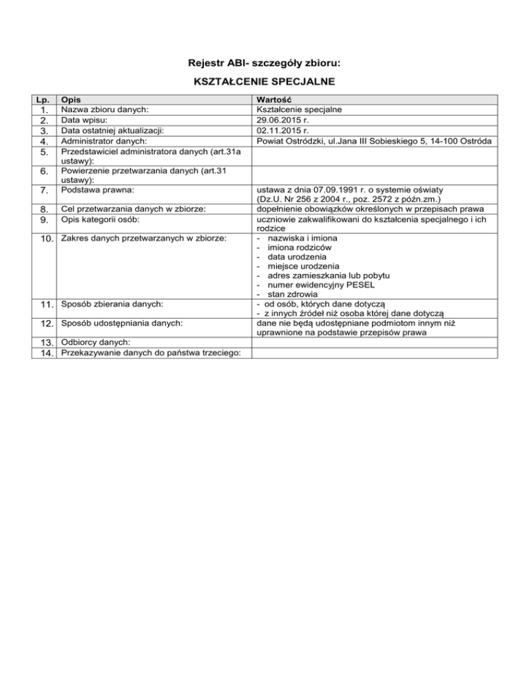 Rejestr ABI- szczegóły zbioru: KSZTAŁCENIE SPECJALNE Lp. 7. Opis Nazwa zbioru danych: Data wpisu: Data ostatniej aktualizacji: Administrator danych: Przedstawiciel administratora danych (art.31a ustawy): Powierzenie przetwarzania danych (art.31 ustawy): Podstawa prawna: 8. 9. Cel przetwarzania danych w zbiorze: Opis kategorii osób: 1. 2. 3. 4. 5. 6. 10. Zakres danych przetwarzanych w zbiorze: 11. Sposób zbierania danych: 12. Sposób udostępniania danych: 13. Odbiorcy danych: 14. Przekazywanie danych do państwa trzeciego: Wartość Kształcenie specjalne 29.06.2015 r. 02.11.2015 r. Powiat Ostródzki, ul.Jana III Sobieskiego 5, 14-100 Ostróda ustawa z dnia 07.09.1991 r. o systemie oświaty (Dz.U. Nr 256 z 2004 r., poz. 2572 z późn.zm.) dopełnienie obowiązków określonych w przepisach prawa uczniowie zakwalifikowani do kształcenia specjalnego i ich rodzice - nazwiska i imiona - imiona rodziców - data urodzenia - miejsce urodzenia - adres zamieszkania lub pobytu - numer ewidencyjny PESEL - stan zdrowia - od osób, których dane dotyczą - z innych źródeł niż osoba której dane dotyczą dane nie będą udostępniane podmiotom innym niż uprawnione na podstawie przepisów prawa