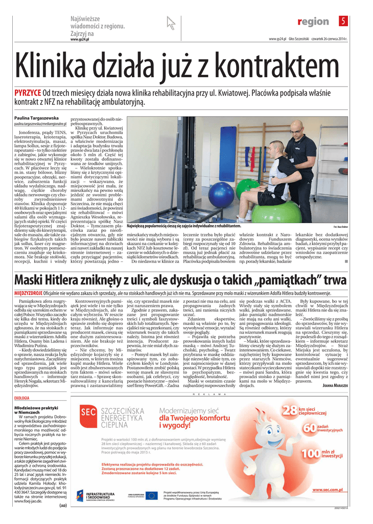 Najświeższe wiadomości z regionu. Zajrzyj na region 5 www.gs24.pl Głos Szczeciński czwartek 26 czerwca 2014 r. www.gs24.pl Klinika działa już z kontraktem PYRZYCE Od trzech miesięcy działa nowa klinika rehabilitacyjna przy ul. Kwiatowej. Placówka podpisała właśnie kontrakt z NFZ na rehabilitację ambulatoryjną. Paulina Targaszewska [email protected] Jonofereza, prądy TENS, laseroterapia, krioterapia, elektrostymulacja, masaż, lampa Sollux, sesje z fizjoterapeutami – to tylko niektóre z zabiegów, jakie wykonuje się w nowo otwartej klinice rehabilitacyjnej w Pyrzycach. W placówce leczy się m.in. stany bólowe, blizny pooperacyjne, obrzęki, nerwice, zaburzenia funkcji układu wydalniczego, nadwagę, ciężkie choroby układu nerwowego czy choroby zwyrodnieniowe stawów. Klinika dysponuje 40 łóżkami w pokojach 1 i 2osobowych oraz specjalnymi salami dla osób wymagających stałej opieki. W części fizjoterapeutycznej znajdziemy salę do kinezyterapii, sale do masażu, ale także zabiegów fizykalnych takich jak sollux, laser czy magnetron. W osobnym pomieszczeniu znajduje się kriokomora. Nie brakuje stołówki, recepcji, kuchni i windy przystosowanej do osób niepełnosprawnych. Klinikę przy ul. Kwiatowej w Pyrzycach uruchomiła spółka Nasz Doktor. Budowa, a właściwie modernizacja i adaptacja budynku trwała prawie dwa lata i pochłonęła około 5 mln zł. Część tej kwoty została dofinansowana ze środków unijnych. – Wielokrotnie spotkaliśmy się z krytycznymi opiniami dotyczącymi lokalizacji – wskazywano, że miejscowość jest mała, że mieszkańcy na pewno wolą jeździć ze swoimi problemami zdrowotnymi do Szczecina, że nie mają chęci ani świadomości, że powinni się rehabilitować – mówi Agnieszka Wesołowska, reprezentująca spółkę Nasz Doktor. – Tymczasem placówka zaraz po nieoficjalnym otwarciu, gdy nie było jeszcze nawet tabliczki informacyjnej na drzwiach ani nawet zakładki na naszej stronie internetowej – zaczęła przyciągać pacjentów, którzy powtarzają jedno – Największą popularnością cieszą się zajęcia indywidualne z rehabilitantem. mieszkańcy małych miejscowości nie mają wyboru i są skazani na czekanie w kolejkach NFZ lub kosztowne leczenie w oddalonych o dziesiątki kilometrów ośrodkach. Do niedawna w klinice za leczenie trzeba było płacić (ceny za poszczególne zabiegi rozpoczynały się od 10 zł). Od teraz pacjenci nie muszą już jednak płacić za rehabilitację ambulatoryjną. Placówka podpisała bowiem właśnie kontrakt z Narodowym Funduszem Zdrowia. Rehabilitacja ambulatoryjna to świadczenia zdrowotne udzielane przez rehabilitanta, mogą to być np. porady lekarskie, badanie Fot. Nasz Doktor lekarskie bez dodatkowej diagnostyki, ocena wyników badań, z którymi przybył pacjent, wypisanie recept czy wniosków na zaopatrzenie ortopedyczne. d Maski Hitlera zniknęły z ulic, ale dyskusja o takich „pamiątkach” trwa MIĘDZYZDROJE Oficjalnie nie wydano zakazu ich sprzedaży, ale na stoiskach handlowych już ich nie ma. Sprzedawane przy molo maski z wizerunkiem Adolfa Hitlera budziły kontrowersje. Pamiątkowa afera rozgrywająca się w Międzyzdrojach odbiła się szerokim echem w całej Polsce. Wszystko zaczęło się kilka dni temu, kiedy do urzędu w Międzyzdrojach zgłoszono, że na stoiskach z pamiątkami sprzedawane są maski z wizerunkiem Adolfa Hitlera, Osamy bin Ladena i Władimira Putina. – Kiedy dowiedzieliśmy się o sprawie, nasza reakcja była natychmiastowa. Zaczęliśmy od sprawdzenia, jak wiele tego typu pamiątek jest sprzedawanych na stoiskach handlowych – informuje Henryk Nogala, sekretarz Międzyzdrojów. Kontrowersyjnych pamiątek jest wiele i to nie tylko w Międzyzdrojach, ale na całym wybrzeżu. W reszcie kraju również. Ale głośno o sprawie zrobiło się dopiero teraz. Jak informuje nas producent masek, cieszą się one dużym zainteresowaniem. Ale nie brakuje też przeciwników. – Nie chcemy, by Międzyzdroje kojarzyły się z miejscem, w którym można kupić maskę Hitlera. Wiele osób jest zbulwersowanych tym faktem – mówi sekretarz miasta. – Sprawę skonsultowaliśmy z kancelarią prawną i zastanawialiśmy się, czy sprzedaż masek nie jest naruszeniem prawa. Zgodnie z prawem, zakazane jest propagowanie treści i symboli faszystowskich lub totalitarnych. Specjaliści nie są przekonani, czy wizerunek twarzy do takich należy. Istotna jest również intencja. Producent zapewnia, że nie miał złych zamiarów. – Pomysł masek był zainspirowany tym, co zobaczyłem kiedyś w Londynie. Postanowiłem zrobić polską wersję masek ze sławnymi osobami, jak celebryci, czy postacie historyczne – mówi szef firmy PowerGift. – Żadna z postaci nie ma na celu, ani propagowania żadnych treści, ani ranienia niczyich uczuć. Zdaniem ekspertów, maski są właśnie po to, by wywoływać emocje, wyrażać swoje poglądy. – Pojawiła się potrzeba prowokowania innych ludzi maską – mówi Andrzej Tucholski, psycholog. – Twarz przybrana w maskę oddziałuje niezwykle silnie tym, co jest najmocniejsze w danej postaci. W przypadku Hitlera to psychopatyzm, bezwzględność, brutalność. Maski w ostatnim czasie najbardziej rozpowszechniły R E K L A M się podczas walki z ACTA. Wtedy stały się symbolem walki, jednak sprzedawane, jako pamiątki nadmorskie nie mają na celu ani walki, ani propagowania ideologii. Są również odbiorcy, którzy na wizerunek masek reagują pozytywnie. – Maski, które sprzedawaliśmy cieszyły się dużym zainteresowaniem. Co ciekawe, najchętniej były kupowane przez starszych Niemców, którzy przypływali na molo stateczkami wycieczkowymi – mówi pani Sandra, która prowadzi stoisko z pamiątkami na molo w Międzyzdrojach. Były kupowane, bo w tej chwili w Międzyzdrojach maski Hitlera nie da się znaleźć. – Zwróciliśmy się z prośbą do sprzedawców, by nie wystawiali wizerunku Hitlera na s