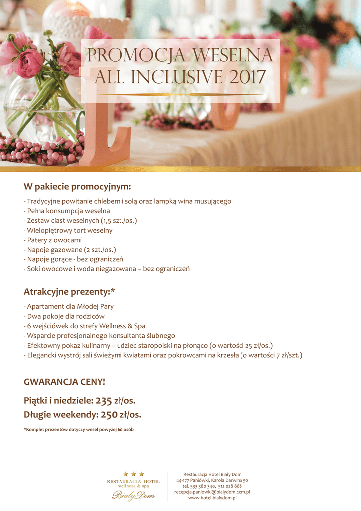 Promocja Weselna ALL INCLUSIVE 2017 W pakiecie promocyjnym: - Tradycyjne powitanie chlebem i solą oraz lampką wina musującego - Pełna konsumpcja weselna - Zestaw ciast weselnych (1,5 szt./os.) - Wielopiętrowy tort weselny - Patery z owocami - Napoje gazowane (2 szt./os.) - Napoje gorące - bez ograniczeń - Soki owocowe i woda niegazowana – bez ograniczeń Atrakcyjne prezenty:* - Apartament dla Młodej Pary - Dwa pokoje dla rodziców - 6 wejściówek do strefy Wellness & Spa - Wsparcie profesjonalnego konsultanta ślubnego - Efektowny pokaz kulinarny – udziec staropolski na płonąco (o wartości 25 zł/os.) - Elegancki wystrój sali świeżymi kwiatami oraz pokrowcami na krzesła (o wartości 7 zł/szt.) GWARANCJA CENY! Piątki i niedziele: 235 zł/os. Długie weekendy: 250 zł/os. *Komplet prezentów dotyczy wesel powyżej 60 osób Restauracja Hotel Biały Dom 44-177 Paniówki, Karola Darwina 50 tel. 533 380 340, 512 028 888 [email protected] www.hotel-bialydom.pl