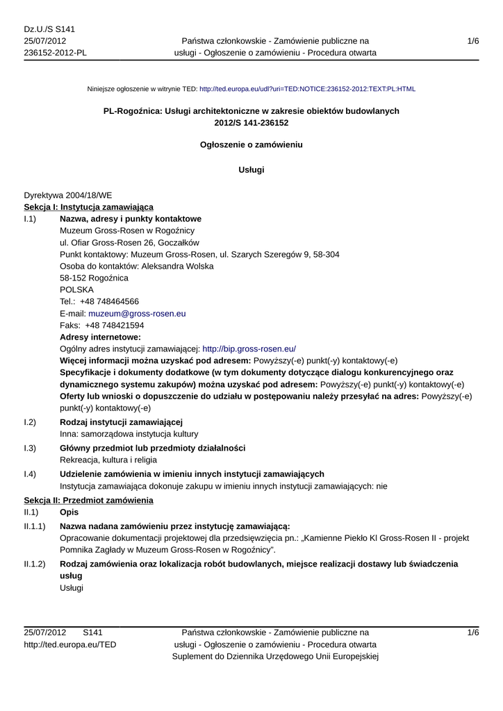 Dz.U./S S141 25/07/2012 236152-2012-PL Państwa członkowskie - Zamówienie publiczne na usługi - Ogłoszenie o zamówieniu - Procedura otwarta 1/6 Niniejsze ogłoszenie w witrynie TED: http://ted.europa.eu/udl?uri=TED:NOTICE:236152-2012:TEXT:PL:HTML PL-Rogoźnica: Usługi architektoniczne w zakresie obiektów budowlanych 2012/S 141-236152 Ogłoszenie o zamówieniu Usługi Dyrektywa 2004/18/WE Sekcja I: Instytucja zamawiająca I.1) Nazwa, adresy i punkty kontaktowe Muzeum Gross-Rosen w Rogoźnicy ul. Ofiar Gross-Rosen 26, Goczałków Punkt kontaktowy: Muzeum Gross-Rosen, ul. Szarych Szeregów 9, 58-304 Osoba do kontaktów: Aleksandra Wolska 58-152 Rogoźnica POLSKA Tel.: +48 748464566 E-mail: [email protected] Faks: +48 748421594 Adresy internetowe: Ogólny adres instytucji zamawiającej: http://bip.gross-rosen.eu/ Więcej informacji można uzyskać pod adresem: Powyższy(-e) punkt(-y) kontaktowy(-e) Specyfikacje i dokumenty dodatkowe (w tym dokumenty dotyczące dialogu konkurencyjnego oraz dynamicznego systemu zakupów) można uzyskać pod adresem: Powyższy(-e) punkt(-y) kontaktowy(-e) Oferty lub wnioski o dopuszczenie do udziału w postępowaniu należy przesyłać na adres: Powyższy(-e) punkt(-y) kontaktowy(-e) I.2) Rodzaj instytucji zamawiającej Inna: samorządowa instytucja kultury I.3) Główny przedmiot lub przedmioty działalności Rekreacja, kultura i religia I.4) Udzielenie zamówienia w imieniu innych instytucji zamawiających Instytucja zamawiająca dokonuje zakupu w imieniu innych instytucji zamawiających: nie Sekcja II: Przedmiot zamówienia II.1) Opis II.1.1) Nazwa nadana zamówieniu przez instytucję zamawiającą: Opracowanie dokumentacji projektowej dla przedsięwzięcia pn.: „Kamienne Piekło Kl Gross-Rosen II - projekt Pomnika Zagłady w Muzeum Gross-Rosen w Rogoźnicy”. II.1.2) Rodzaj zamówienia oraz lokalizacja robót budowlanych, miejsce realizacji dostawy lub świadczenia usług Usługi 25/07/2012 S141 http://ted.europa.eu/TED Państwa członkowskie - Zamówienie publiczne na usługi - Ogłoszenie o zamówieniu - Procedura otwarta Suplement do Dziennika Urzędowego Unii Europejskiej 1/6 Dz.U./S S141 25/07/2012 236152-2012-PL Państwa członkowskie - Zamówienie publiczne na usługi - Ogłoszenie o zamówieniu - Procedura otwarta 2/6 Kategoria usług: nr 12: Usługi architektoniczne, inżynieryjne i zintegrowane usługi inżynieryjne; usługi urbanistyczne, architektury krajobrazu, związane z nimi usługi konsultacji naukowych i technicznych; usługi badań i analiz technicznych Główne miejsce lub lokalizacja robót budowlanych, miejsce realizacji dostawy lub świadczenia usług: Rogoźnica. Kod NUTS PL517 II.1.3) Informacje na temat zamówienia publicznego, umowy ramowej lub dynamicznego systemu zakupów (DSZ) Ogłoszenie dotyczy zamówienia publicznego II.1.4) Informacje na temat umowy ramowej II.1.5) Krótki opis zamówienia lub zakupu Wykonanie dokumentacji projektowej dla przedsięwzięcia pn.: „Kamienne Piekło KL Gross-Rosen II” – projekt Pomnika Zagłady w Muzeum Gross-Rosen w Rogoźnicy. II.1.6) Wspólny Słownik Zamówień (CPV) 71221000 II.1.7) Informacje na temat Porozumienia w sprawie zamówień rządowych (GPA) Zamówienie jest objęte Porozumieniem w sprawie zamówień rządowych (GPA): nie II.1.8) Części To zamówienie podzielone jest na części: nie II.1.9) Informacje o ofertach wariantowych Dopuszcza się składanie ofert wariantowych: nie II.2) Wielkość lub zakres zamówienia II.2.1) Całkowita wielkość lub zakres: Szacunkowa wartość bez VAT: 2 163 000,00 PLN II.2.2) Informacje o opcjach Opcje: nie II.2.3) Informacje o wznowieniach Jest to zamówienie podlegające wznowieniu: nie II.3) Czas trwania zamówienia lub termin realizacji w dniach: 308 (od udzielenia zamówienia) Sekcja III: Informacje o charakterze prawnym, ekonomicznym, finansowym i technicznym III.1) Warunki dotyczące zamówienia III.1.1) Wymagane wadia i gwarancje: Każdy Wykonawca w wypadku złożenia oferty na zadanie zobowiązany jest do wniesienia wadium przetargowego w wysokości: 30 000,00 PLN. najpóźniej do 30.8.2012 r. do godz. 10:00. III.1.2) Główne warunki finansowe i uzgodnienia płatnicze i/lub odniesienie do odpowiednich przepisów je regulujących: III.1.3) Forma prawna, jaką musi przyjąć grupa wykonawców, której zostanie udzielone zamówienie: III.1.4) Inne szczególne warunki Wykonanie zamówienia podlega szczególnym warunkom: nie III.2) Warunki udziału 25/07/2012 S141 http://ted.europa.eu/TED Państwa członkowskie - Zamówienie publiczne na usługi - Ogłoszenie o zamówieniu - Procedura otwarta Suplement do Dziennika Urzędowego Unii Europejskiej 2/6 Dz.U./S S141 25/07/2012 236152-2012-PL Państwa członkowskie - Zamówienie publiczne na usługi - Ogłoszenie o zamówieniu - Procedura otwarta 3/6 III.2.1) Sytuacja podmiotowa wykonawców, w tym wymogi związane z wpisem do rejestru zawodowego lub handlowego III.2.2) Zdolność ekonomiczna i finansowa III.2.3) Kwalifikacje techniczne Informacje i formalności konieczne do dokonania oceny spełniania wymogów: Wykaz wykonanych, w okresie ostatnich 3 lat przed upływem terminu składania ofert, a jeśli okres prowadzenia działalności jest krótszy – w tym okresie, co najmniej 1 projektu wykonawczego obiektu usytuowanego w strefie ochrony konserwatorskiej o minimalnej powierzchni 2 000 m2, z których każdy musi być o charakterze i złożoności porównywalnej z przedmiotem zamówienia z podaniem ich wartości, przedmiotu, dat wykonania i odbiorców. Wykaz osób uczestniczących w wykonaniu zamówienia. Minimalny poziom ewentualnie wymaganych standardów: Wykonanie w okresie ostatnich 3 lat przed upływem terminu składania ofert, a jeśli okres prowadzenia działalności jest krótszy – w tym okresie, co najmniej 1 projektu wykonawczego obiektu usytuowanego w strefie ochrony konserwatorskiej o minimalnej powierzchni 2 000 m2, z których każdy musi być o charakterze i z