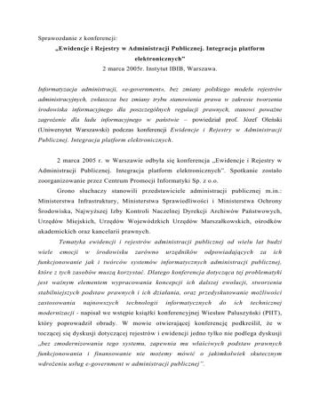 Sprawozdanie z konferencji: „Ewidencje i Rejestry w Administracji Publicznej. Integracja platform elektronicznych” 2 marca 2005r. Instytut IBIB, Warszawa. Informatyzacja administracji, «e-government», bez zmiany polskiego modelu rejestrów administracyjnych, zwłaszcza bez zmiany trybu stanowienia prawa w zakresie tworzenia środowiska informacyjnego dla poszczególnych regulacji prawnych, stanowi poważne zagrożenie dla ładu informacyjnego w państwie – powiedział prof. Józef Oleński (Uniwersytet Warszawski) podczas konferencji Ewidencje i Rejestry w Administracji Publicznej. Integracja platform elektronicznych. 2 marca 2005 r. w Warszawie odbyła się konferencja „Ewidencje i Rejestry w Administracji Publicznej. Integracja platform elektronicznych”. Spotkanie zostało zoorganizowanie przez Centrum Promocji Informatyki Sp. z o.o. Grono słuchaczy stanowili przedstawiciele administracji publicznej m.in.: Ministerstwa Infrastruktury, Ministerstwa Sprawiedliwości i Ministerstwa Ochrony Środowiska, Najwyższej Izby Kontroli Naczelnej Dyrekcji Archiwów Państwowych, Urzędów Miejskich, Urzędów Wojewódzkich Urzędów Marszałkowskich, ośrodków akademickich oraz kancelarii prawnych. Tematyka ewidencji i rejestrów administracji publicznej od wielu lat budzi wiele emocji w środowisku zarówno urzędników odpowiadających za ich funkcjonowanie jak i twórców systemów informatycznych administracji publicznej, które z tych zasobów muszą korzystać. Dlatego konferencja dotycząca tej problematyki jest ważnym elementem wypracowania koncepcji ich dalszej ewolucji, stworzenia stabilniejszych podstaw prawnych i ich działania, oraz przedyskutowanie możliwości zastosowania najnowszych technologii informatycznych do ich technicznej modernizacji - napisał we wstępie książki konferencyjnej Wiesław Paluszyński (PIIT), który poprowadził obrady. W mowie otwierającej konferencję podkreślił, że w toczącej się dyskusji dotyczącej rejestrów i ewidencji jedno tylko nie podlega dyskusji „bez zmodernizowania tego systemu, zapewnia mu właściwych podstaw prawnych funkcjonowania i finansowanie nie możemy mówić o jakimkolwiek skutecznym wdrożeniu usług e-government w administracji publicznej”. 1. prof. Bolesław Szafrański (WAT – Instytut Systemów Informatycznych) Wykład inaugurujący wygłosił prof. Bolesław Szafrański (WAT – Instytut Systemów Informatycznych), w którym Profesor przedstawił szczegóły dotyczące zapisów dotyczących rejestrów w projekcie Ustawy o informatyzacji „Rejestr publiczny to rejestr, ewidencja, wykaz, lista, spis albo inna forma ewidencji służąca do realizacji zadań publicznych, prowadzona przez podmiot publiczny na podstawie odrębnych przepisów ustawowych. Ustawa ma regulować minimalne wymagania dla rejestrów publicznych i wymiany informacji w formie elektronicznej. Ma nimi być zespół cech informacyjnych, w tym identyfikatorów oraz odpowiadających im charakterystyk elementów strukturalnych przekazu informacji, takich jak zawartości pola danych, służących do zapewnienia spójności prowadzenia rejestrów publicznych oraz wymiany informacji w formie elektronicznej między podmiotami publicznymi. Zadanie spójności podkreślał w swoim wystąpieniu również prof. Józef Oleński (Uniwersytet Warszawski, Narodowy Bank Polski). Przedstawił funkcjonujące w innych krajach modele rejestrów administracyjnych oraz model polski, którego istotą jest daleko posunięta autonomizacja inicjowania, tworzenia, projektowania i eksploatacji rejestrów podmiotów gospodarki narodowej. Efektem takiego procesu stanowienia prawa jest to, że wiele ustaw wymaga utworzenia i utrzymania odrębnych, autonomicznych rejestrów podmiotów. Rejestry tworzone jako systemy autonomiczne są niespójne - podkreśla. Wprowadzają bowiem własne standardy informacyjne, nieskoordynowane ze standardami innych rejestrów. Dlatego nie ma możliwości wymiany informacji między rejestrami dodaje. Informatyzacja administracji, e-government, w warunkach modelu polskiego, bez zmiany tego modelu, zwłaszcza bez zmiany trybu stanowienia prawa w zakresie tworzenia środowiska informacyjnego dla poszczególnych regulacji prawnych, stanowi poważne zagrożenie dla ładu informacyjnego w państwie – powiedział prof. Józef Oleński. 2.prof. Józef Oleński (Uniwersytet Warszawski, Narodowy Bank Polski). Profesor Oleński przypomniał, że rejestry administracyjne są ważnymi elementami metainformacyjnymi wszystkich systemów informatycznych jednostek sektora publicznego, dlatego zastosowanie w różnych systemach informacyjnych administracji tych samych lub spójnych w określonym zakresie rejestrów osób fizycznych, jednostek organizacyjnych, jednostek terytorialnych, obiektów technicznych czy procesów zapewnia integralność tych systemów. Aby rejestry administracyjnych mogły spełniać tę funkcję, same powinny spełniać wymogi integralności, relewancji i minimalnej redundancji. Niestety, większość rejestrów administracyjnych obecnie istniejących powstało w „epoce papierowej”. Są to systemy autonomiczne, nie spełniające warunków integralności niezbędnej do efektywnej wymiany informacji z wykorzystaniem technologii teleinformatycznych. Niezbędne jest, by reengineering tych rejestrów, w związku z wprowadzaniem nowoczesnych technologii teleinformatycznych w aparacie państwa, wykorzystać do ich integracji. Profesor twierdzi, że w pierwszej kolejności należy określić minimalny zestaw standardów dla powtarzalnych danych oraz hierarchii rejestrów z punktu widzenia standaryzacji tych danych w systemach informatycznych sektora publicznego. Systemy na szczycie tej hierarchii mogłyby pełnić funkcje tzw. rejestrów referencyjnych, a więc systemów, których wewnętrzne standardy informacyjne są uznawane przez wszystkie inne rejestry. Funkcję rejestrów referencyjnych w warunkach Polski mogłyby pełnić