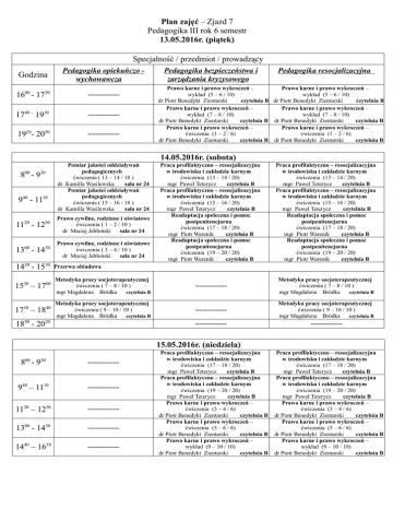 Plan zajęć – Zjazd 7 Pedagogika III rok 6 semestr 13.05.2016r. (piątek) Specjalność / przedmiot / prowadzący Godzina Pedagogika opiekuńczo wychowawcza 1600 - 1730 ---------------- 1740 – 1910 ---------------- 1920- 2050 ---------------- Pedagogika bezpieczeństwa i zarządzania kryzysowego Pedagogika resocjalizacyjna Prawo karne i prawo wykroczeń – Prawo karne i prawo wykroczeń – wykład (5 – 6 / 10) wykład (5 – 6 / 10) dr Piotr Benedykt Zientarski czytelnia B dr Piotr Benedykt Zientarski czytelnia B Prawo karne i prawo wykroczeń – Prawo karne i prawo wykroczeń – wykład (7 – 8 / 10) wykład (7 – 8 / 10) dr Piotr Benedykt Zientarski czytelnia B dr Piotr Benedykt Zientarski czytelnia B Prawo karne i prawo wykroczeń – Prawo karne i prawo wykroczeń – ćwiczenia (1 – 2 / 6) ćwiczenia (1 – 2 / 6) dr Piotr Benedykt Zientarski czytelnia B dr Piotr Benedykt Zientarski czytelnia B 14.05.2016r. (sobota) 00 8 -9 30 940 - 1110 Pomiar jakości oddziaływań pedagogicznych ćwiczenia ( 13 – 14 / 18 ) dr Kamilla Wasilewska sala nr 24 Pomiar jakości oddziaływań pedagogicznych ćwiczenia ( 15 – 16 / 18 ) dr Kamilla Wasilewska sala nr 24 1120 - 1250 Prawo cywilne, rodzinne i oświatowe ćwiczenia ( 1 – 2 / 10 ) dr Maciej Jabłoński sala nr 24 1300 - 1430 Prawo cywilne, rodzinne i oświatowe ćwiczenia ( 3 – 4 / 10 ) dr Maciej Jabłoński sala nr 24 Praca profilaktyczno – resocjalizacyjna w środowisku i zakładzie karnym ćwiczenia (13 – 14 / 20) mgr Paweł Teterycz czytelnia B Praca profilaktyczno – resocjalizacyjna w środowisku i zakładzie karnym ćwiczenia (15 – 16 / 20) mgr Paweł Teterycz czytelnia B Readaptacja społeczna i pomoc postpenitencjarna ćwiczenia (17 – 18 / 20) mgr Piotr Warenik czytelnia B Readaptacja społeczna i pomoc postpenitencjarna ćwiczenia (19 – 20 / 20) mgr Piotr Warenik czytelnia B Praca profilaktyczno – resocjalizacyjna w środowisku i zakładzie karnym ćwiczenia (13 – 14 / 20) mgr Paweł Teterycz czytelnia B Praca profilaktyczno – resocjalizacyjna w środowisku i zakładzie karnym ćwiczenia (15 – 16 / 20) mgr Paweł Teterycz czytelnia B Readaptacja społeczna i pomoc postpenitencjarna ćwiczenia (17 – 18 / 20) mgr Piotr Warenik czytelnia B Readaptacja społeczna i pomoc postpenitencjarna ćwiczenia (19 – 20 / 20) mgr Piotr Warenik czytelnia B Metodyka pracy socjoterapeutycznej ćwiczenia ( 7 – 8 / 10 ) mgr Magdalena Bródka czytelnia B 1430 - 1530 Przerwa obiadowa 1530 – 1700 Metodyka pracy socjoterapeutycznej ćwiczenia ( 7 – 8 / 10 ) mgr Magdalena Bródka czytelnia B ---------------- 1710 – 1840 Metodyka pracy socjoterapeutycznej ćwiczenia ( 9 – 10 / 10 ) mgr Magdalena Bródka czytelnia B ---------------- 1850 - 2020 ---------------- Metodyka pracy socjoterapeutycznej ćwiczenia ( 9 – 10 / 10 ) mgr Magdalena Bródka czytelnia B ---------------- 15.05.2016r. (niedziela) 00 8 -9 30 ---------------- 940 – 1110 ---------------- 1120 – 1250 ---------------- 1300 - 1430 ---------------- 1440 – 1610 ---------------- Praca profilaktyczno – resocjalizacyjna w środowisku i zakładzie karnym ćwiczenia (17 – 18 / 20) mgr Paweł Teterycz czytelnia B Praca profilaktyczno – resocjalizacyjna w środowisku i zakładzie karnym ćwiczenia (19 – 20 / 20) mgr Paweł Teterycz czytelnia B Prawo karne i prawo wykroczeń – ćwiczenia (3 – 4 / 6) dr Piotr Benedykt Zientarski czytelnia B Prawo karne i prawo wykroczeń – ćwiczenia (5 – 6 / 6) dr Piotr Benedykt Zientarski czytelnia B Prawo karne i prawo wykroczeń – wykład (9 – 10 / 10) dr Piotr Benedykt Zientarski czytelnia B Praca profilaktyczno – resocjalizacyjna w środowisku i zakładzie karnym ćwiczenia (17 – 18 / 20) mgr Paweł Teterycz czytelnia B Praca profilaktyczno – resocjalizacyjna w środowisku i zakładzie karnym ćwiczenia (19 – 20 / 20) mgr Paweł Teterycz czytelnia B Prawo karne i prawo wykroczeń – ćwiczenia (3 – 4 / 6) dr Piotr Benedykt Zientarski czytelnia B Prawo karne i prawo wykroczeń – ćwiczenia (5 – 6 / 6) dr Piotr Benedykt Zientarski czytelnia B Prawo karne i prawo wykroczeń – wykład (9 – 10 / 10) dr Piotr Benedykt Zientarski czytelnia B