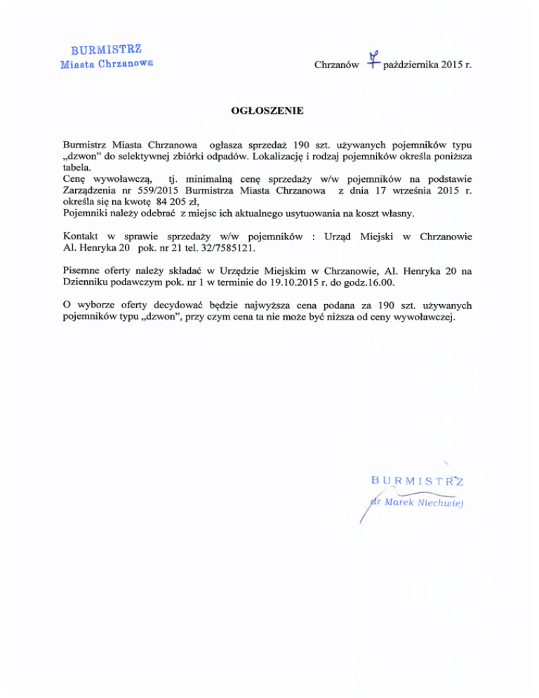 b u rm istrz M iasta Chrzanowa Chrzanów października 2015 r. OGŁOSZENIE Burmistrz Miasta Chrzanowa ogłasza sprzedaż 190 szt. używanych pojemników typu „dzwon” do selektywnej zbiórki odpadów. Lokalizację i rodzaj pojemników określa poniższa tabela. Cenę wywoławczą, tj. minimalną cenę sprzedaży w/w pojemników na podstawie Zarządzenia nr 559/2015 Burmistrza Miasta Chrzanowa z dnia 17 września 2015 r. określa się na kwotę 84 205 zł, Pojemniki należy odebrać z miejsc ich aktualnego usytuowania na koszt własny. Kontakt w sprawie sprzedaży w/w pojemników Al. Henryka 20 pok. nr 21 tel. 32/7585121. : Urząd Miejski w Chrzanowie Pisemne oferty należy składać w Urzędzie Miejskim w Chrzanowie, Al. Henryka 20 na Dzienniku podawczym pok. nr 1 w terminie do 19.10.2015 r. do godz. 16.00. O wyborze oferty decydować będzie najwyższa cena podana za 190 szt. używanych pojemników typu „dzwon”, przy czym cena ta nie może być niższa od ceny wywoławczej. \ B U R M 1S T RZ M a re k N ie c h w ie j Wykaz pojemników typu „dzwon” na terenie miasta i gminy Chrzanów l.p. ulica Ilość Żółte Żółte l,5m3 2,5m3 Białe l,5m3 Zielone Czerwo 1,5 m3 ne 1,5 m3 Niebieski e 1,5 m3 CHRZANÓW 1 2 3 4 5 6 7 8 9 10 11 12 13 14 15 16 17 18 19 Trzebińska 11 Trzebińska 21 Trzebińska 33 Przedszkole nr 10 Chrzanów, ul. Sikorskiego 6 Mieszka 1 13A Przedszkole nr 7 Chrzanów, ul. Ofiar Faszyzmu 1 Broniewskiego 12b Zielona 22 b Zielona 31 A Sienkiewicz 13 Sienkiewicz 9 Jordana 2 Jordana 6 Woj .Polskiego 6,8 Sądowa 1 Kadłubek 22 Kadłubek 30 Szafera 2 Szafera 10 4 1 1 2 X X X X X X 2 3 X 1 2 1 3 3 1 1 2 2 1 3 3 1 X 20 Pęckowskiego 2 4 X 21 Krawczyńskiego 1 2 X 22 Urbańczyka 4 23 Urbańczykal 24 Szarych Szeregów 4a 25 Witosa 3 26 Witosa 1 A 27 Orkana 21D 2 3 3 X X X X X X 3 1 4 X X X X X X X X X X X X X X X X X X X X X X X X X XX X X X X X X X XX X X X X X X X 28 Przedszkole nr 9 Chrzanów, ul. Brzezina 14 29 Orkana 21A 30 Kol. Rospontowa 15 31 Pogorska 10E 32 Pogorska 12 33 Pogorska 10A 34 Fabryczna 7c 35 Przedszkole nr 11 Chrzanów, ul. Fabryczna 25 36 Fabryczna 19 37 Kroczymiech 2g 38 Piłsudskiego 6 39 Przedszkole nr 4 Chrzanów, ul. Wyszyńskiego 5 40 Wyszyńskiego 7 41 Niepodległości 9 42 Kol. Stella k/poczty 43 Kol. Stella 1,2,5,6,7 44 Kol. Stella 24 45 Kol. Stella 27 46 Przedszkole nr 2 Chrzanów, ul. Dworska 2 47 29 listopada 28 BiC 48 29 listopadal5A 49 Przedszkole nrl Chrzanów, ul. Śląska 74b 50 Kryta Pływalnia w Chrzanowie, ul. Mydlana 20 51 Brzezina 10 PŁAZA 52 uL. Sobieskiego 39 53 Przedszkole w Płazie, ul. Wiosny Ludów 16A 3 X 2 3 X X XX X 2 3 3 2 3 X 2 2 2 3 X X X X X X X X X X X X X X X 3 X X X 3 3 X X X X X X 3 X X X 3 3 3 X X X X X X 4 XX 2 3 X X X X X X X X X X X X X X X 1 X 3 X 3 X X X 2 X X X X X X X BALIN 54 Przedszkole w Balinie, ul. Komisji Edukacji Narodowej 7 55 Baza(ul. Parkowa) RAZEM 3 X X X 59 13 0 23 18 3 2 190 45 7 67 47 12 12