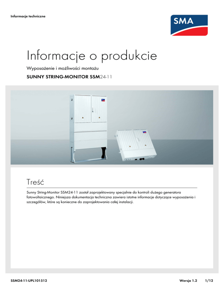 Informacje techniczne Informacje o produkcie Wyposażenie i możliwości montażu SUNNY STRING-MONITOR SSM24-11 Treść Sunny String-Monitor SSM24-11 został zaprojektowany specjalnie do kontroli dużego generatora fotowoltaicznego. Niniejsza dokumentacja techniczna zawiera istotne informacje dotyczące wyposażenia i szczegółów, które są konieczne do zaprojektowania całej instalacji. SSM24-11-UPL101512 Wersja 1.2 1/12 Informacje techniczne Informacje o produkcie 1 Informacje o produkcie • Firma SMA Solar Technology dzięki Sunny String-Monitor SSM24-11 oferuje dokładne urządzenie do kontroli dużych generatorów fotowoltaicznych. • Sunny String-Monitor SSM24-11 stale mierzy i porównuje poszczególne prądy pasmowe. Analiza dokonywana jest przez Sunny Central Control. • Monitor Sunny String SSM24-11 dysponuje 24 kanałami pomiarowymi, do których można podłączyć bezpośrednio 24 lub 48 pasma. • Sunny String-Monitor SSM24-11 posiada bezpieczniki pasma na biegunie dodatnim i ujemnym. W przypadku uziemionych generatorów fotowoltaicznych Sunny String-Monitor SSM24-11 może zostać wyposażony w mostki cylindryczne na biegunie dodatnim lub ujemnym do wyboru. • Sunny String-Monitor SSM24-11 można odłączyć przy pomocy wyłącznika mocy po stronie zejścia w stronę przemiennika częstotliwości. Wyłącznik mocy zamontowany jest we wszystkich wersjach Sunny String-Monitor. • Sunny String-Monitor SSM24-11 wyposażony jest w monitorowane ochronniki przepięciowe kategorii II. • Sunny String-Monitor SSM24-11 został zgłoszony do zastrzeżenia wzoru użytkowego. 2 Dane techniczne Obudowa Możliwość montażu na zewnątrz Odporność na promieniowanie UV Ustawienie na podstawie* Montaż ścienny* Materiał Palność Kolor Izolacja ochronna Cylinder zwierający, klucz do szafy rozdzielczej** Szyna kablowa*** tylko w cieniu Tak Tak Tak Tworzywo sztuczne wzmocnione włóknami szklanymi Samogasnący, niezawierający halogenów RAL7035 Tak Tak Tak * opcionalnie ** Przygotowany do montażu przez klienta *** tylko przy montażu na podstawie SMA Solar Technology AG 2/12 Informacje techniczne Dane techniczne Wymiary i masa podstawa Długość x wysokość x szerokość Głębokość wkopania podstawy Masa Masa całkowita, obudowa włącznie z podstawą 1 060 mm x 894 mm x 245 mm 595 mm 16 kg 96 kg Wymiary i masa obudowy Długość x wysokość x szerokość Masa 1 060 mm x 1 085 mm x 245 mm 80 kg Dane ogólne Wyłącznik mocy DC* Stopień zanieczyszczenia** 320 A 2 * Napęd bezpośredni ** Według EN 50178:1997 Parametry wejściowe Konfiguracja pola fotowoltaicznego Maksymalnie dopuszczalne napięcie prądu stałego przy L/P 2 ms Maksymalny dopuszczalny prąd DC Liczba wejść pomiarowych Maksymalna liczba złączy na wejście pomiarowe Możliwe bezpieczniki pasm Maksymalny prąd pasmowy na wejście pomiarowe przy bezpieczniku pasma 10 A Maksymalny prąd pasmowy na wejście pomiarowe przy bezpieczniku pasma 12 A Maksymalny prąd łańcucha na wejście pomiarowe przy bezpieczniku łańcucha 16 A Maksymalny prąd łańcucha na wejście pomiarowe przy bezpieczniku łańcucha 20 A Zasilanie napięciem pomiarowym SMA Solar Technology AG UDC, maks. IDC, maks. Uziemienie ujemne lub dodatnie, izolowane 1 000 V 320 A 24 2 10 A / 12 A / 16 A / 20 A 7 A, współczynnik redukcji 0,7 8,4 A, współczynnik redukcji 0,7 11,2 A, współczynnik redukcji 0,7 13,3 A, współczynnik redukcji 0,665 35 VDC … 55 VDC 3/12 Informacje techniczne Dane techniczne Przyłącze główne prądu stałego Rodzaj zacisku Maksymalny przekrój połączenia Właściwy materjał do podłączenia Liczba złączy na odgałęzienie DC Prowadzenie kabla przez złączke śrubową Sfera zacisku złączki śrubowej kabla Zacisk klatkowy 240 mm² / 300 mm² miedź / aluminium 1/2 M40 13 mm ... 32 mm * Sunny String-Monitor SSM24-11 z dennicą: możliwość podłączenia 1 kabla na zacisk DC. Sunny String-Monitor SSM24-11 bez dennicy: możliwość podłączenia 2 kabli na zacisk DC. Podłączenie pasma do wtyczki słonecznej Rodzaj wtyczki SUNCLIX / MC3 / MC4 / Tyco Przyłącze pasma DC do zacisku pomiarowego i rozdzielczego Rodzaj zacisku Maksymalny przekrój połączenia Doprowadzenie przewodów przez wielokrotną złączke śrubową kabla Strefa zacisku wielokrotnej złączki śrubowej kabla Zacisk sprężynowy 0,2 mm² ... 6 mm² M50 5,0 mm … 5,5 mm / 5,6 mm … 6,0 mm / 6,1 mm … 7,0 mm / 7,1 mm … 8,0 mm / 8,1 mm … 9,0 mm Podłączenie uziemienia Rodzaj zacisku Maksymalny przekrój połączenia Prowadzenie kabla przez złączke śrubową Sfera zacisku złączki śrubowej kabla SMA Solar Technology AG Zacisk klatkowy 35 mm² M25 7 mm … 14 mm 4/12 Informacje techniczne Dane techniczne podłączenie komunikacji Rodzaj zacisku* Maksymalny przekrój połączenia Prowadzenie kabla przez złączke śrubową Sfera zacisku złączki śrubowej kabla Wskazany typ kabla Liczba dostarczonych Zacisk sprężynowy 0,08 mm² … 2,5 mm² M25 7 mm … 14 mm 4 mm x 2mm x 0,5 mm Li2YCYv (TP) 2 * Maksymalny przekrój ekranu, 8 mm Zdalne wyzwolenie za pomocą wyzwalacza prądu roboczego (opcja) Napięcie znamionowe Rozszerzony zakres roboczy Częstotliwość znamionowa Pobór mocy 220 VAC … 240 VAC –30 % … +10 % 50 Hz / 60 Hz 100 VA Zdalne wyzwolenie za pomocą wyzwalacza podnapięciowego (opcja) Napięcie znamionowe Rozszerzony zakres roboczy Częstotliwość znamionowa Pobór mocy 220 VAC … 240 VAC –15 % … +10 % 50 Hz / 60 Hz 3 VA Podłączenie zdalne wyzwalanie (opcja) Rodzaj zacisku Maksymalny przekrój połączenia Prowadzenie kabla przez złączke śrubową Sfera zacisku złączki śrubowej kabla Zacisk sprężynowy 0,5 mm² … 6 mm² M25 7 mm … 14 mm Zestyk sygnału zwrotnego w przypadku zdalnego wyzwolenia (opcja) Napięcie znamionowe Prąd znamionowy Wersja SMA Solar Technology AG 250 VAC/DC 5 AAC / 0,15 ADC zestyk przełączny 5/12 Informacje techniczne Możliwości montażu i wymiary Podłączenie zesty